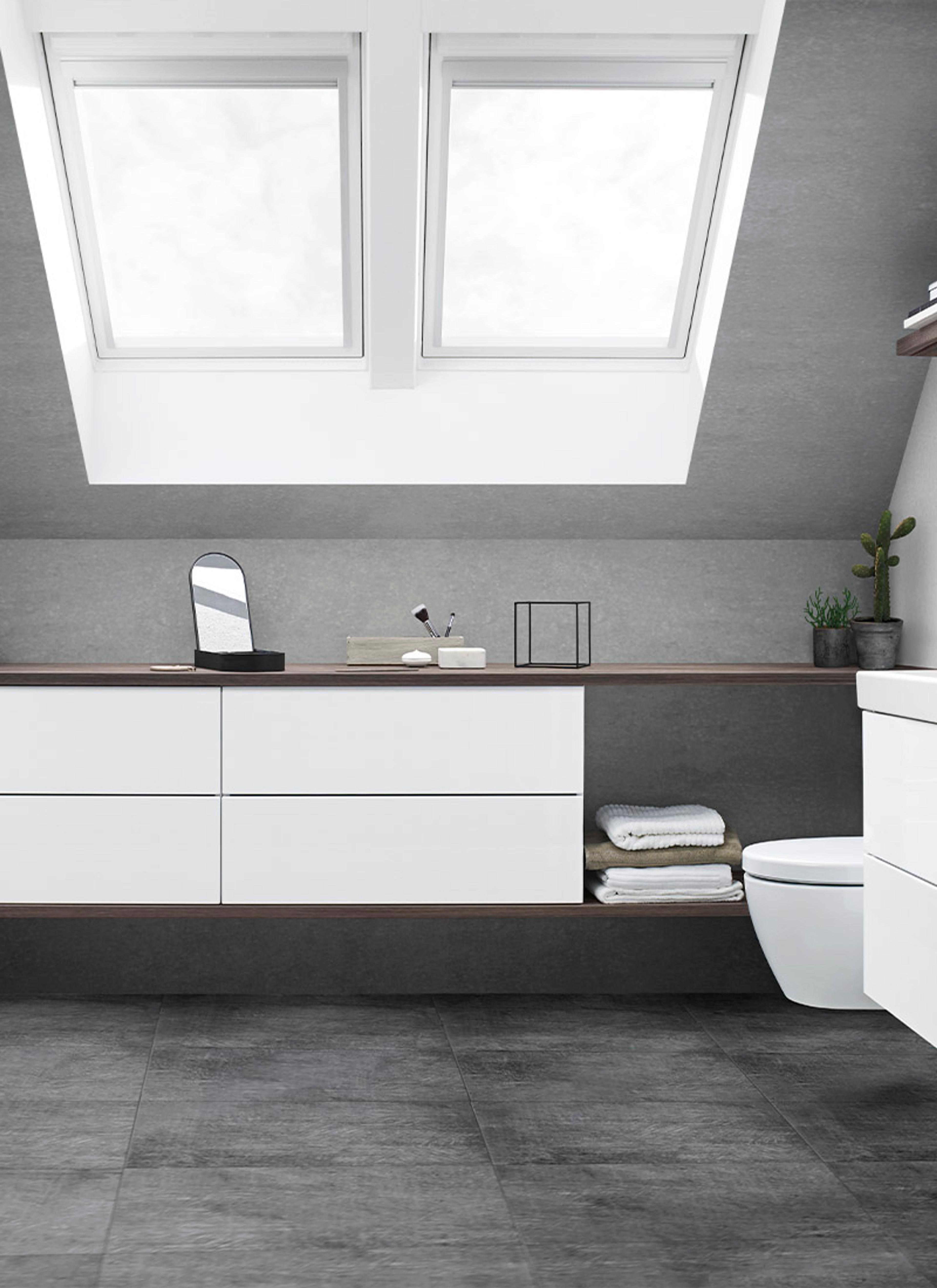 OPTIMAL OPPBEVARING MED SKRÅTAK: selv om du har skråtak finnes det muligheter. Du kan for eksempel utnytte plassen med en stor skjenk. Kombiner flere skuffemoduler med en benkeplate, så får du en praktisk og fin vegg-til-vegg-løsning. | Dansani Inzo baderomsmøbel.