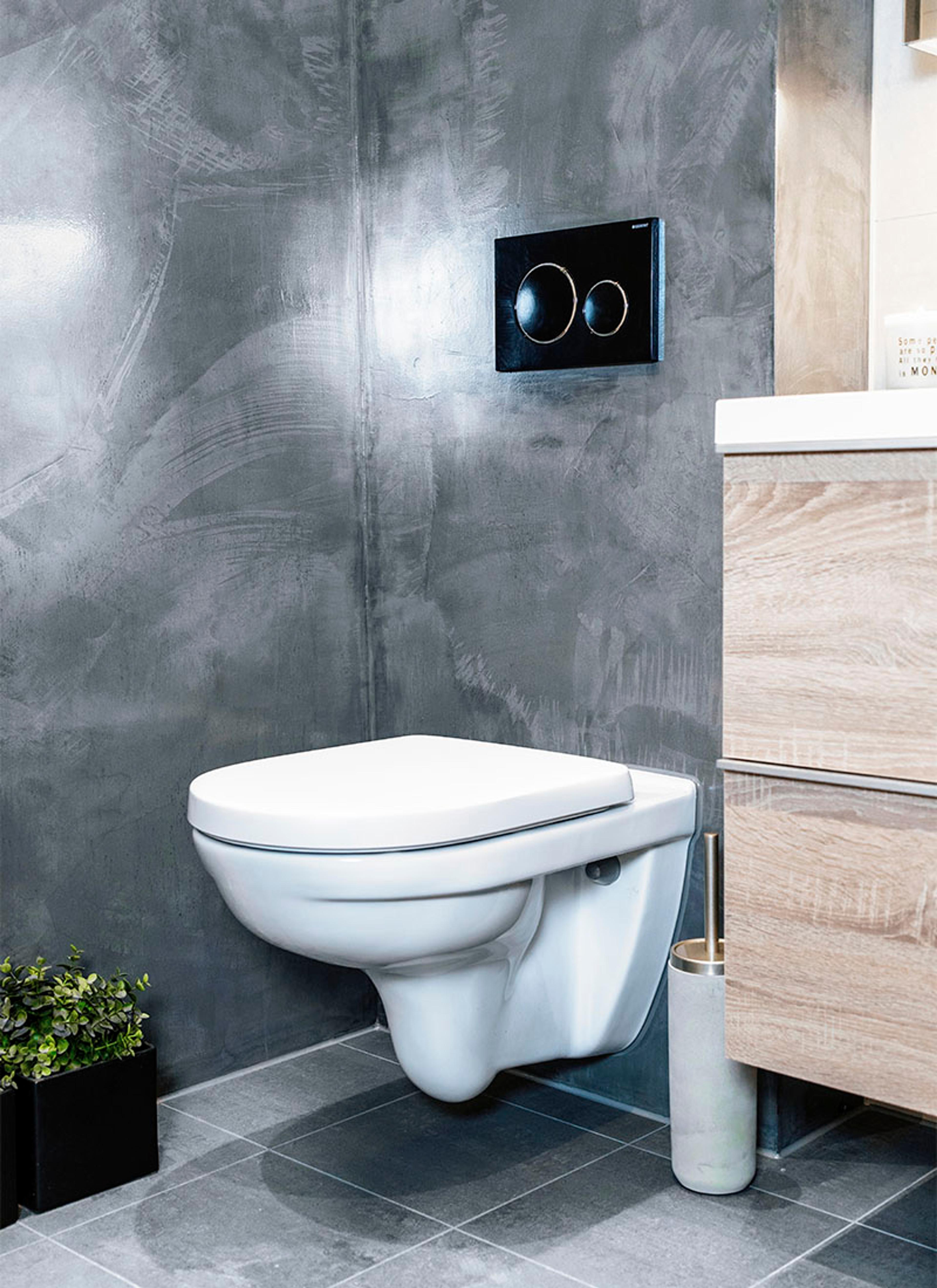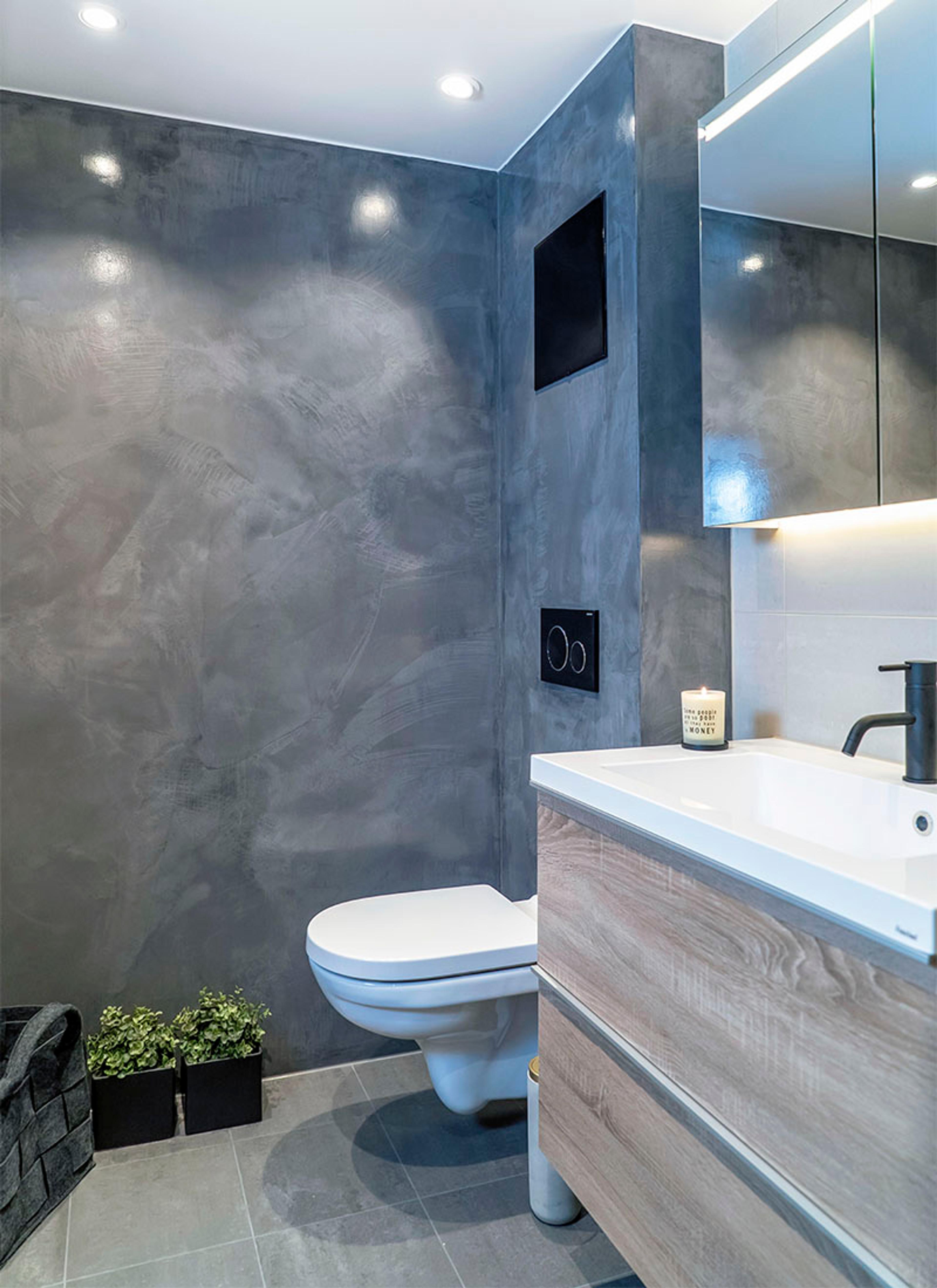 Inspirasjon fant Miriam både gjennom iherdig googling og dypdykking i interiørmagasiner. Hun var innom flere stilretninger, men enkelte elementer landet hun kjapt. – Et av de elementene jeg var helt bestemt på, var at jeg ville ha en vegg i en slags betong- eller sement-look. I tillegg hadde jeg veldig lyst på sort armatur og dusj, som jeg kunne myke opp med noe mer organisk - som treverk, forteller hun.
