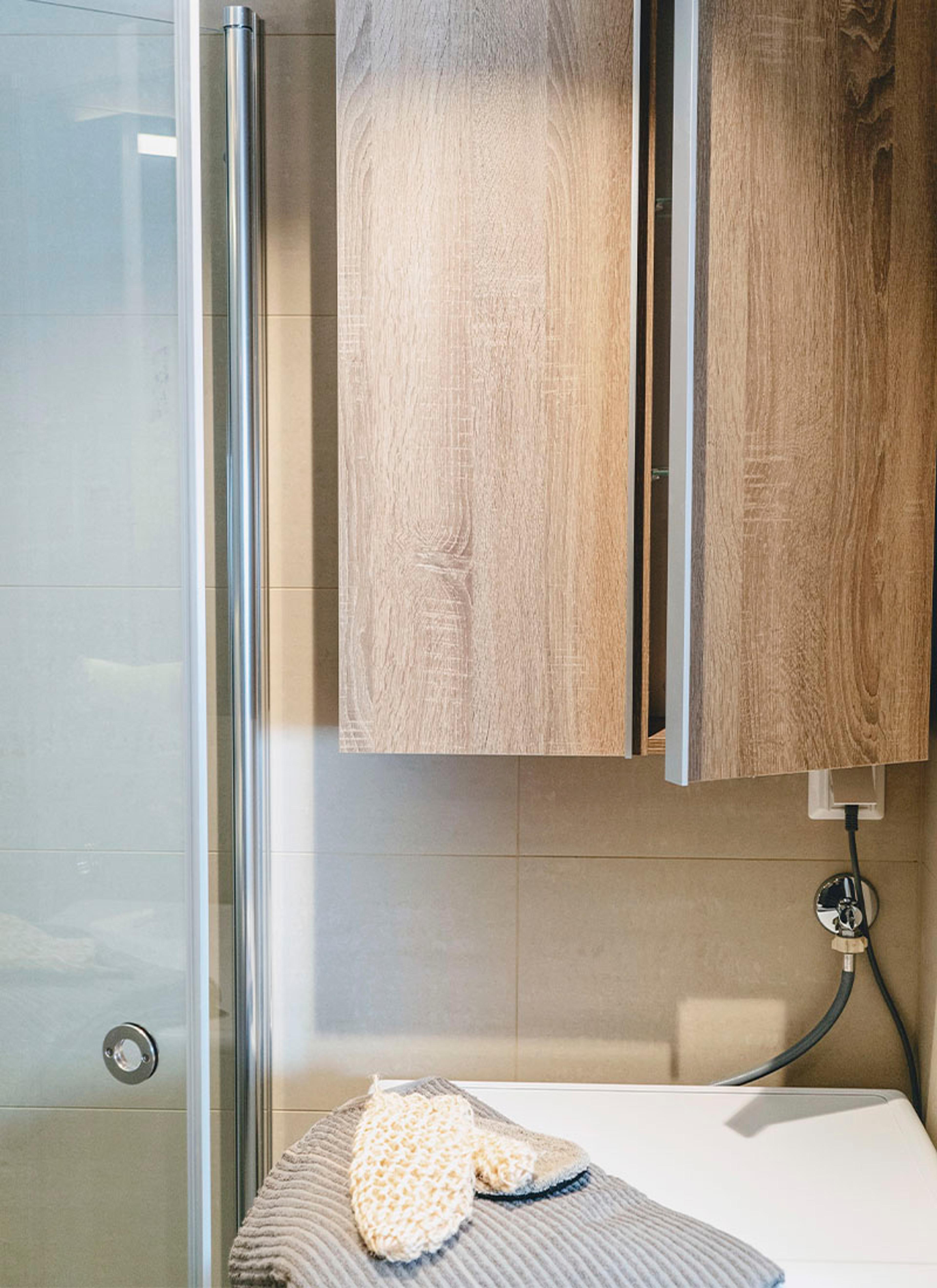 Miriam har virkelig fått utnyttet plassen optimalt med et overskap over vaskemaskinen | Variant overskap i eik struktur fra Foss