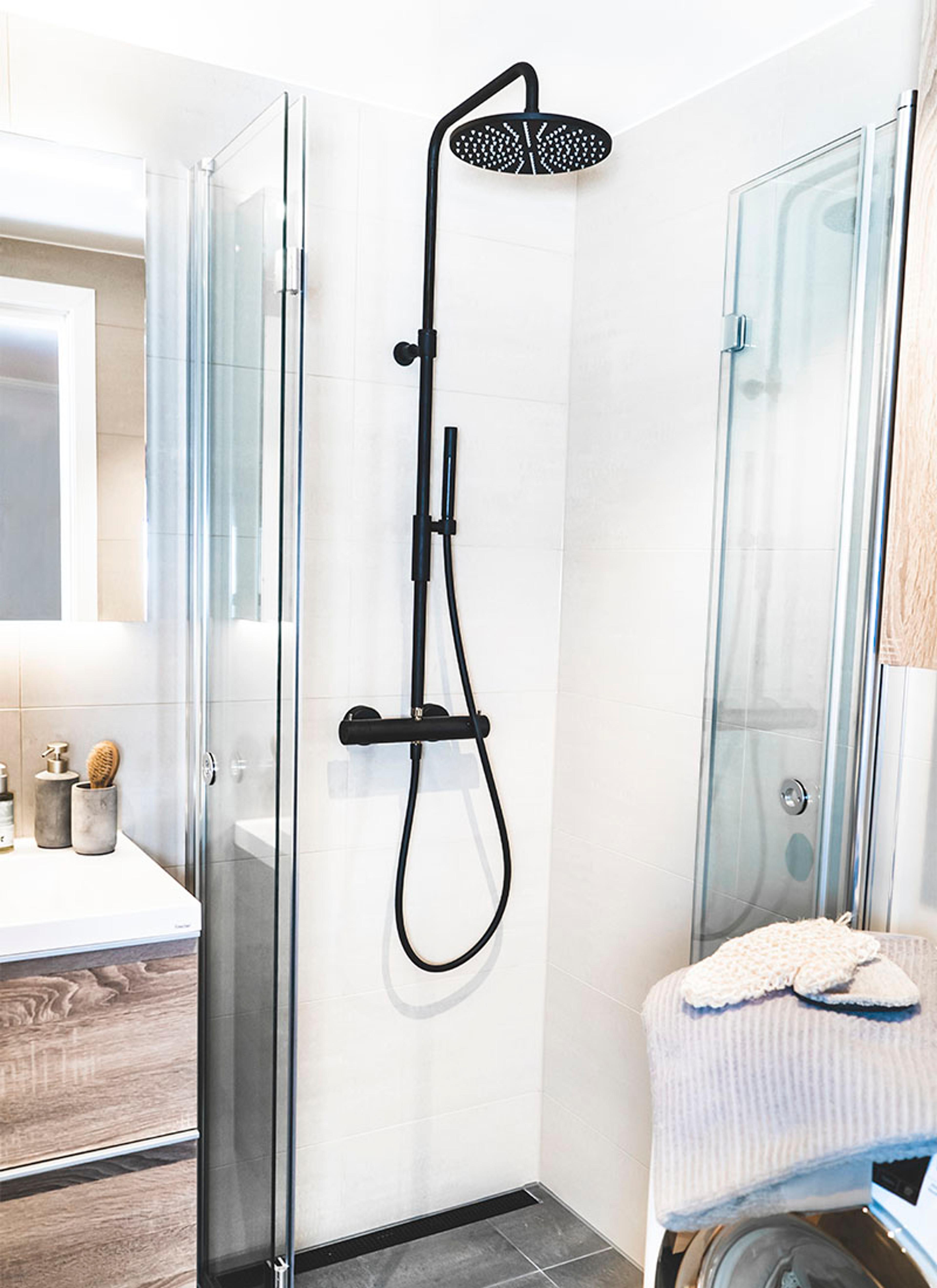 Miriam har valgt sorte detaljer på det nye badet. Sort skaper en "edgy"-look på badet og er en fin kontrast til det varme treverket | TVM7200 takdusj fra Tapwell i sort matt | Purus Line Chess slukrist i sort matt | Praktiske LINC Flex foldedører fra INR
