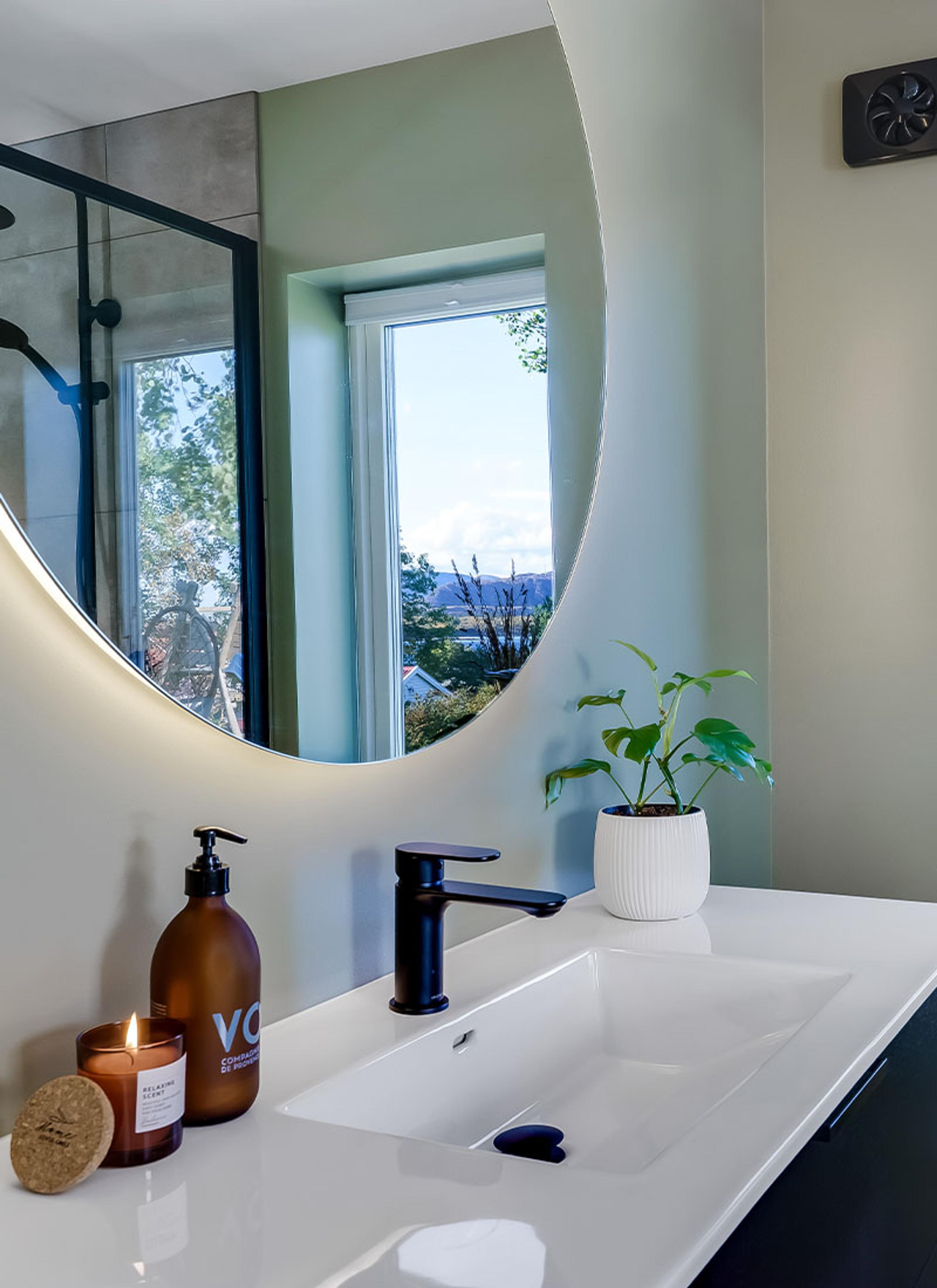 Grønnfargen harmonerer med utearealet og skogen utenfor de to vinduene. Ett vindu gir lys til vaskeromsdelen, et annet åpner opp rommet mellom dusjhjørnet og det store speilet.