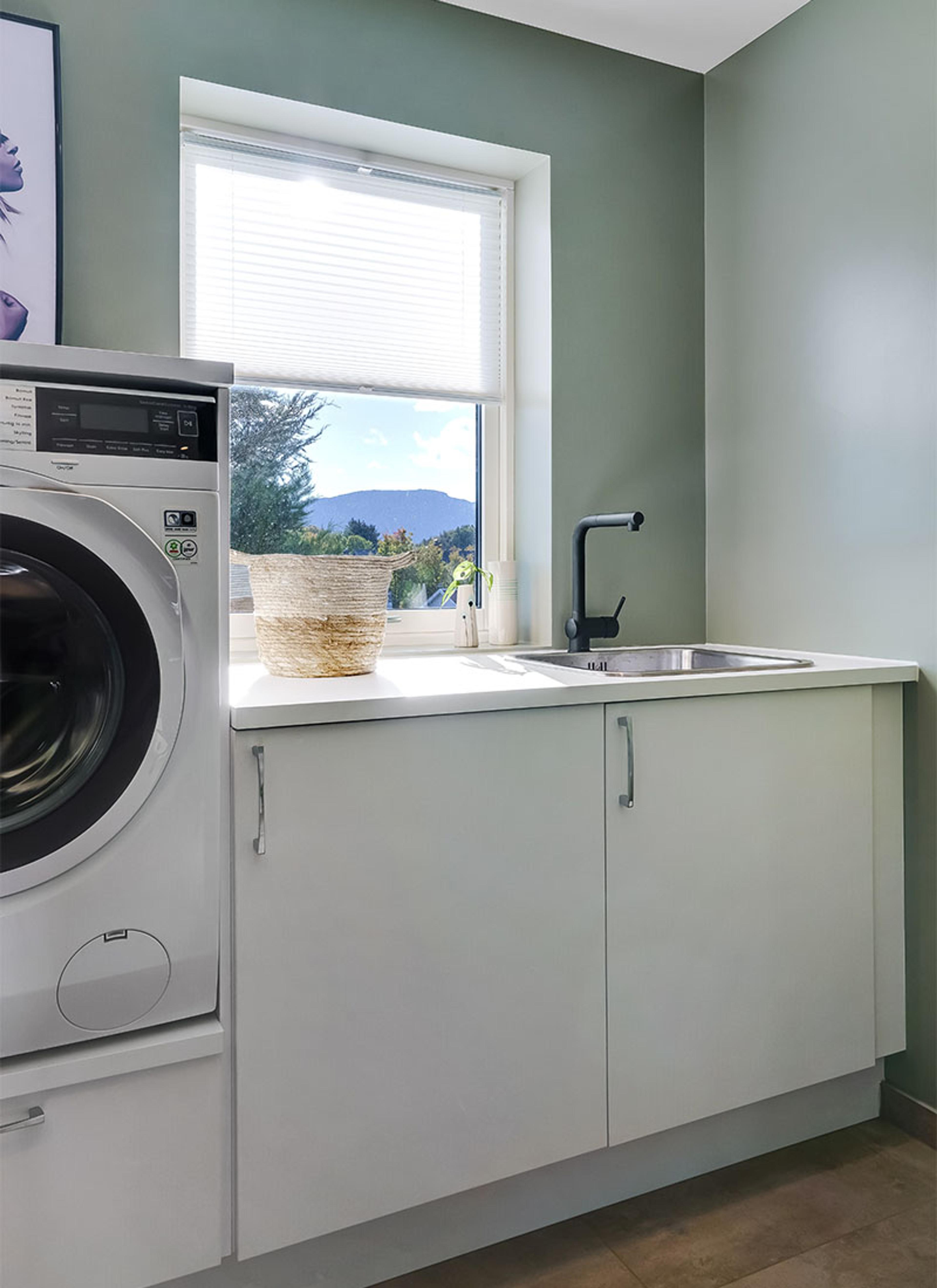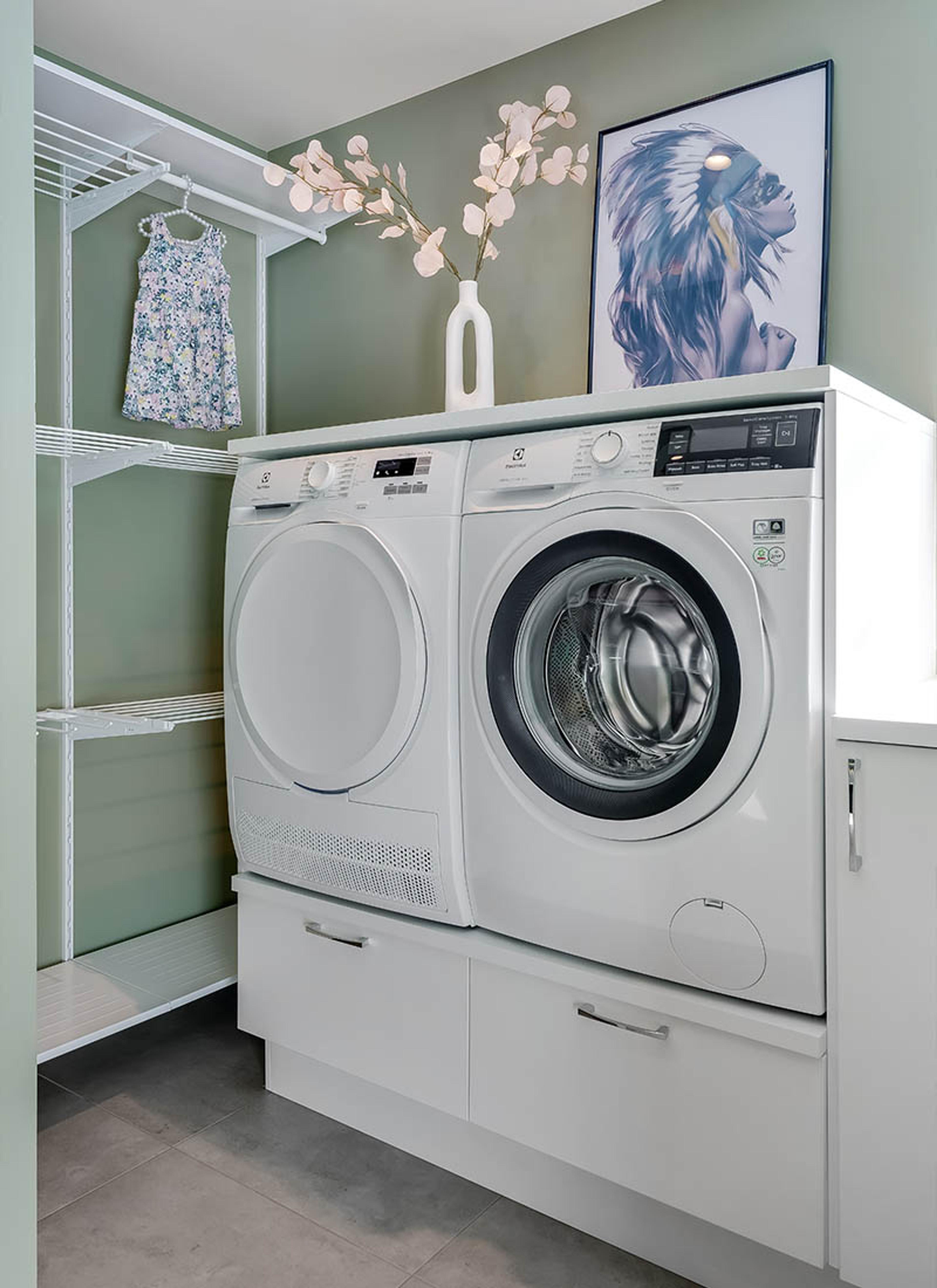 Funksjon og design: Et godt tips er å plassere vaskemaskinen og tørketrommelen opp i høyden. Ikke bare frigjør du gulvplass på vaskerommet, du sparer også rygg og knær for unødig belastning. | Linn Bad vaskeromsinnredning med skuffer og skap | Hansgrohe Talis M54 kjøkkenbatteri i sort matt.