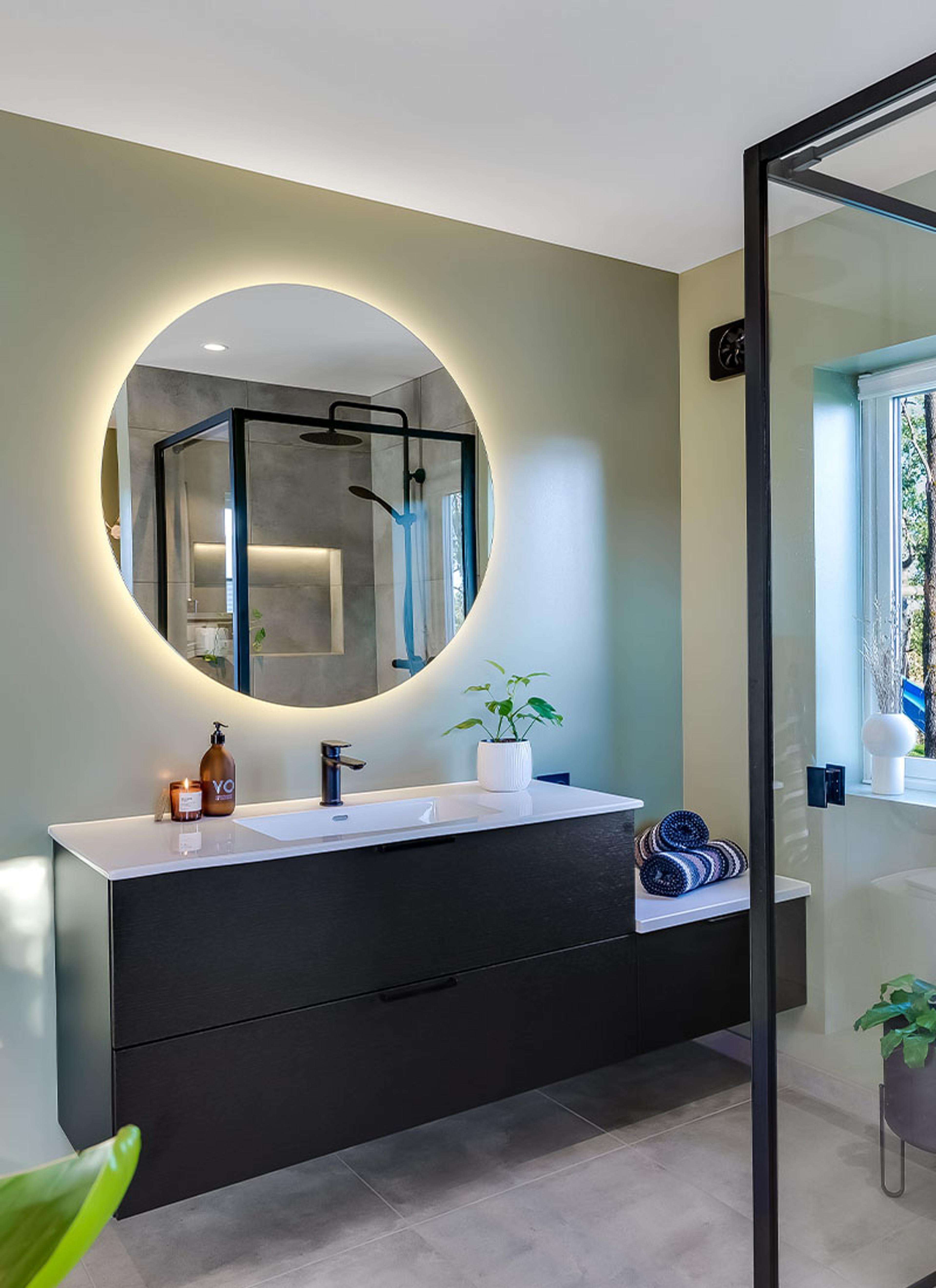 Flerfunksjonelt møbel: Et godt tips er å ha en benk eller en krakk på badet – på den måten har du et sted du virkelig kan roe ned før du møter verden igjen. | Fossbad Variant baderomsmøbel i sort eik med tilhørende sittebenk | Rundt Moon speil fra Fossbad med belysning.