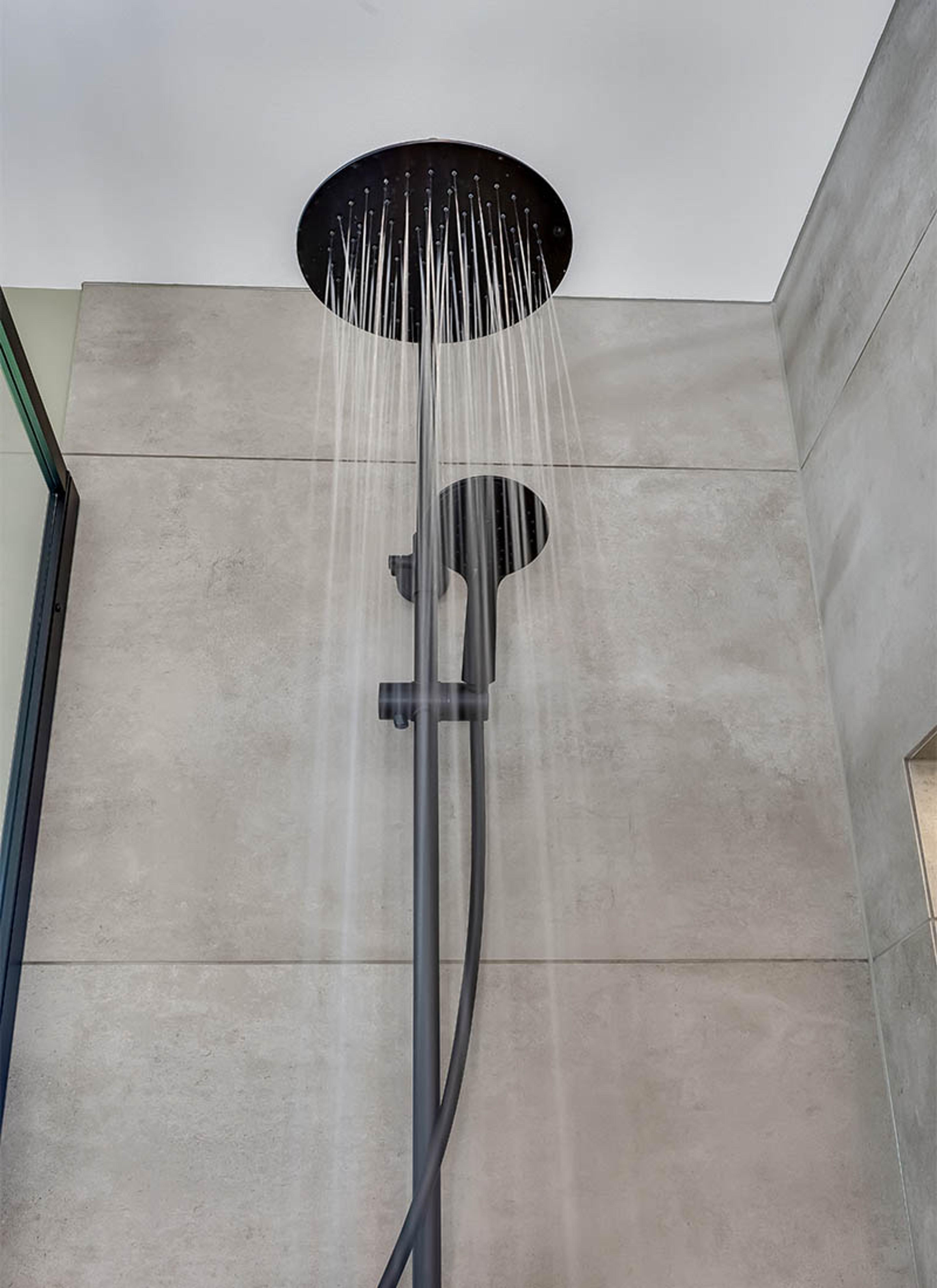 De matte sorte detaljene går igjen i dusj, dusjdører, kran og ved toalettet. De er alle nøye utvalgt, etter inspirasjon fra Bademiljøs fysiske utstillinger.