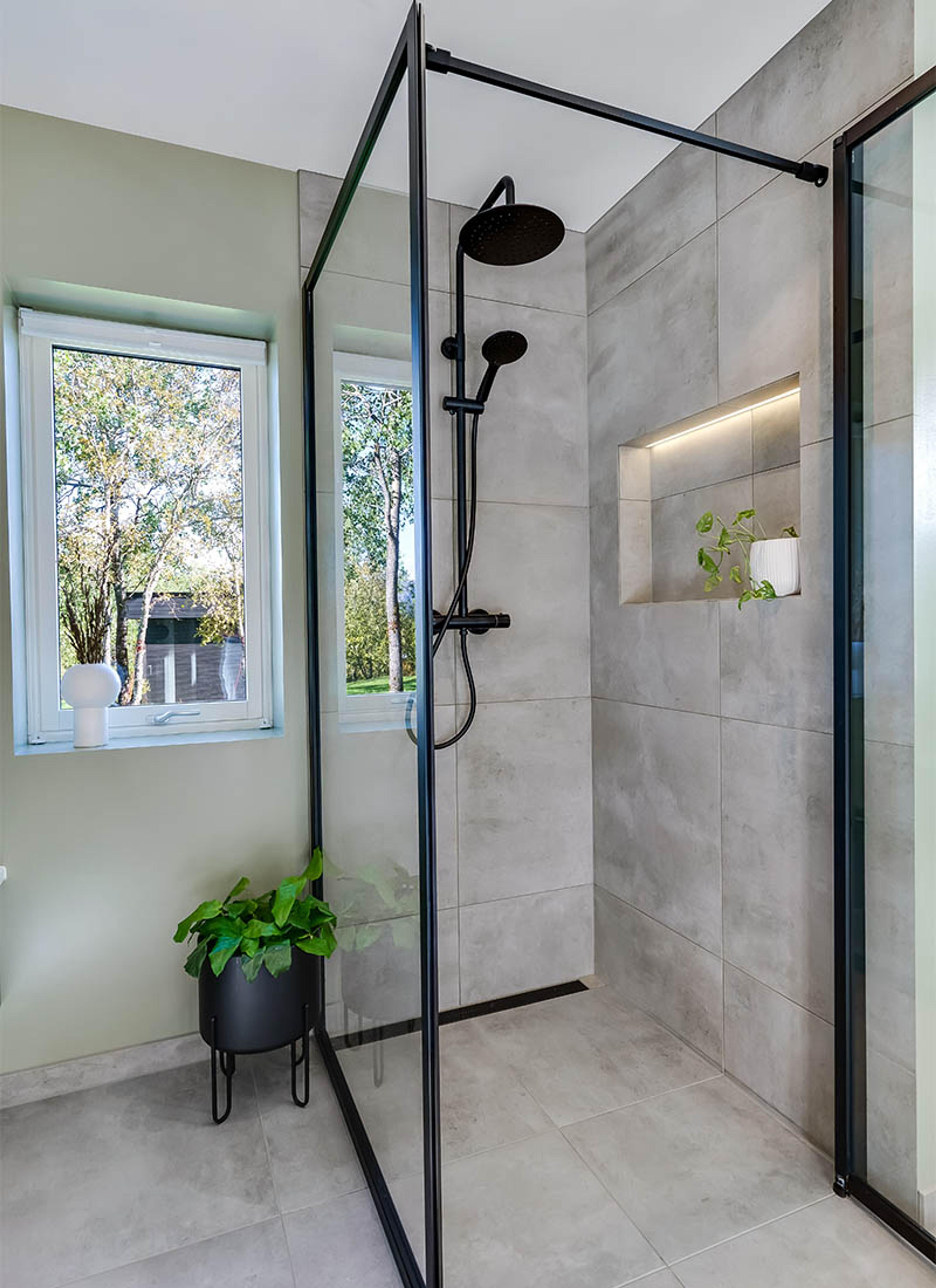 Grønn harmoni: Få en god start på dagen med grønne toner og idyllisk utsikt. | Macro Design Empire Swing dusjhjørne med sorte profiler | Tapwell TVM7200 takdusj i sort matt | Purus Line Chess linjesluk i sort matt.
