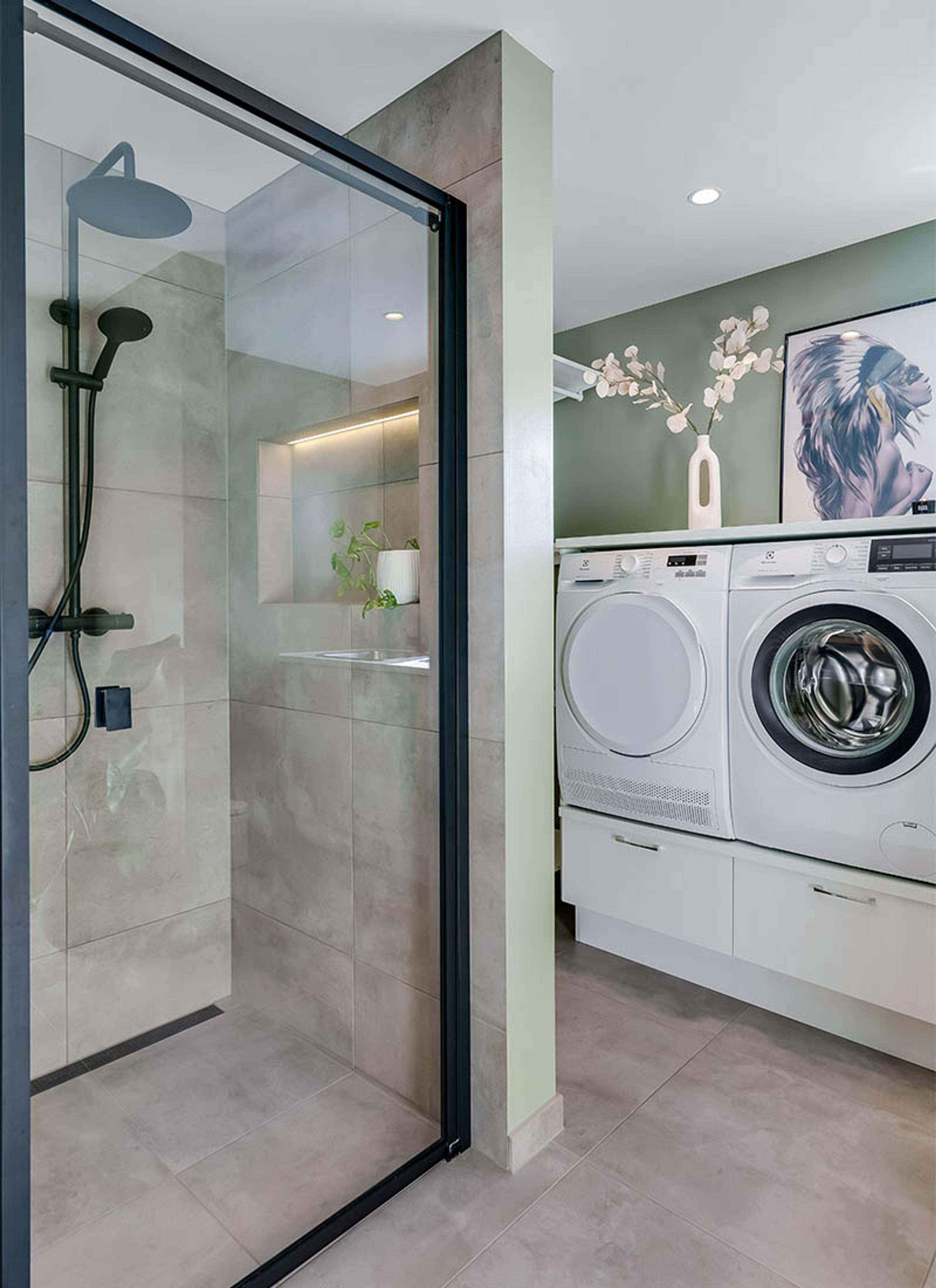 – Hvis du har mulighet, anbefaler vi en skyvedør eller en lettvegg mellom baderomsdelen og vaskeromsdelen. Da føles baderommet mer som et baderom og vaskerommet mer som et vaskerom, påpeker Louis.