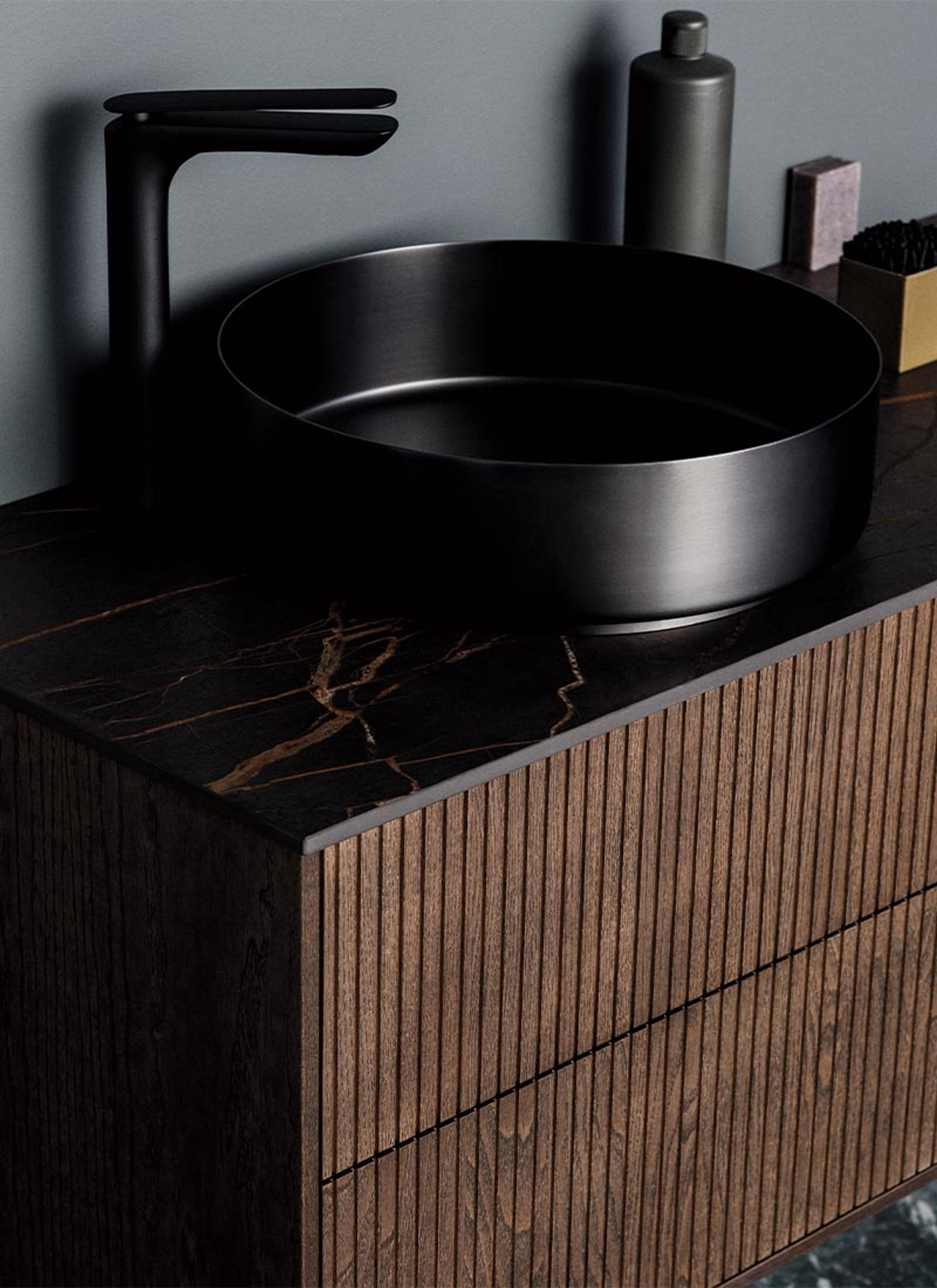 Svedbergs Stora bolleservant i rustfritt stål i fargen blyantpenn sort. Stålservanten kommer med en PVD-overflate som gjør servanten ekstra slitesterk. Baderomsmøbelet Epos er designet av Halvor Bakke.