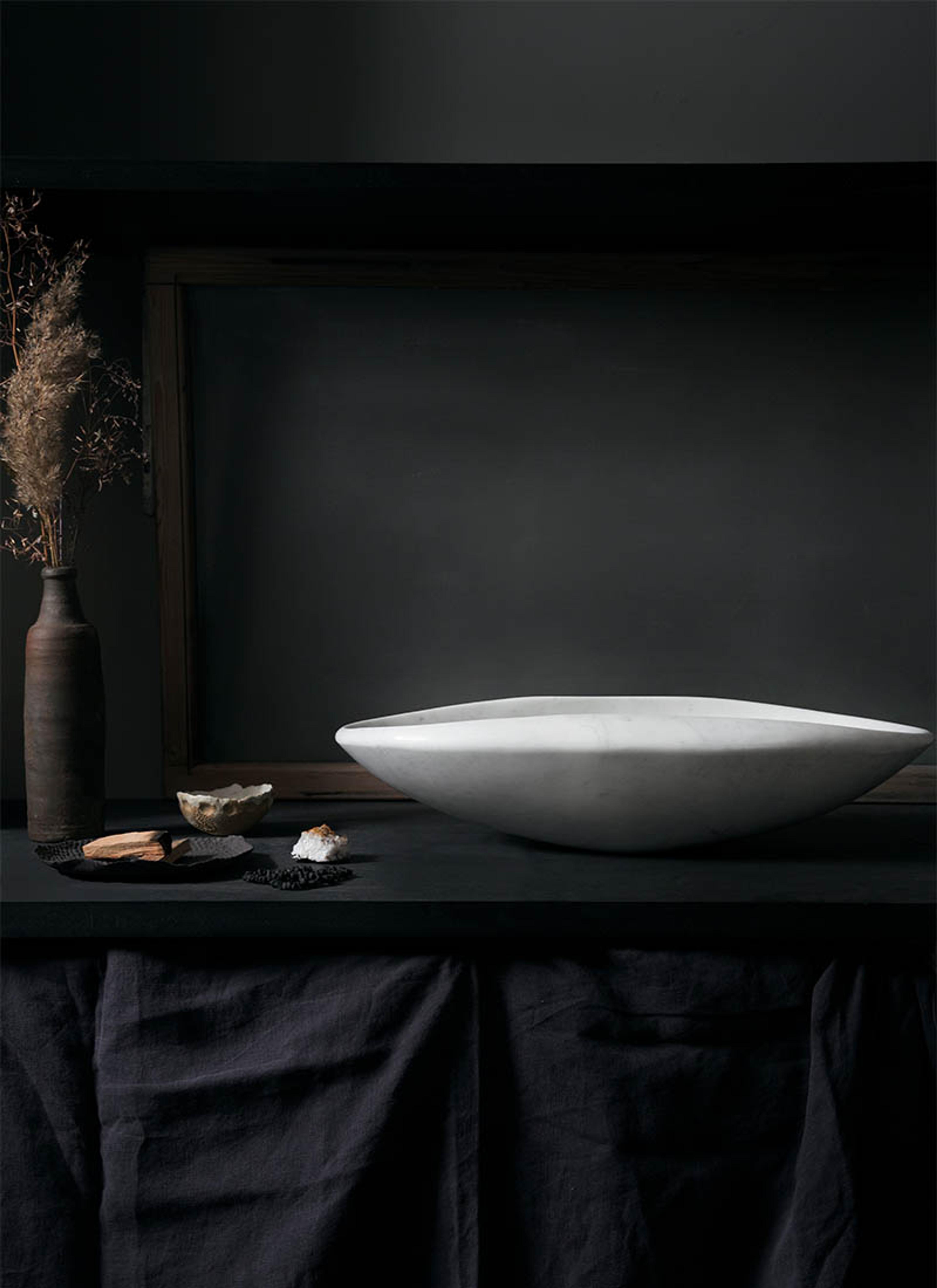 Klassisk skjønnhet!ELVV Juan bolleservant i hvit marmor med lysegrå tekstur. Marmor er en metamorf bergart, og har blitt et kulturelt symbol på tradisjon og raffinert smak.