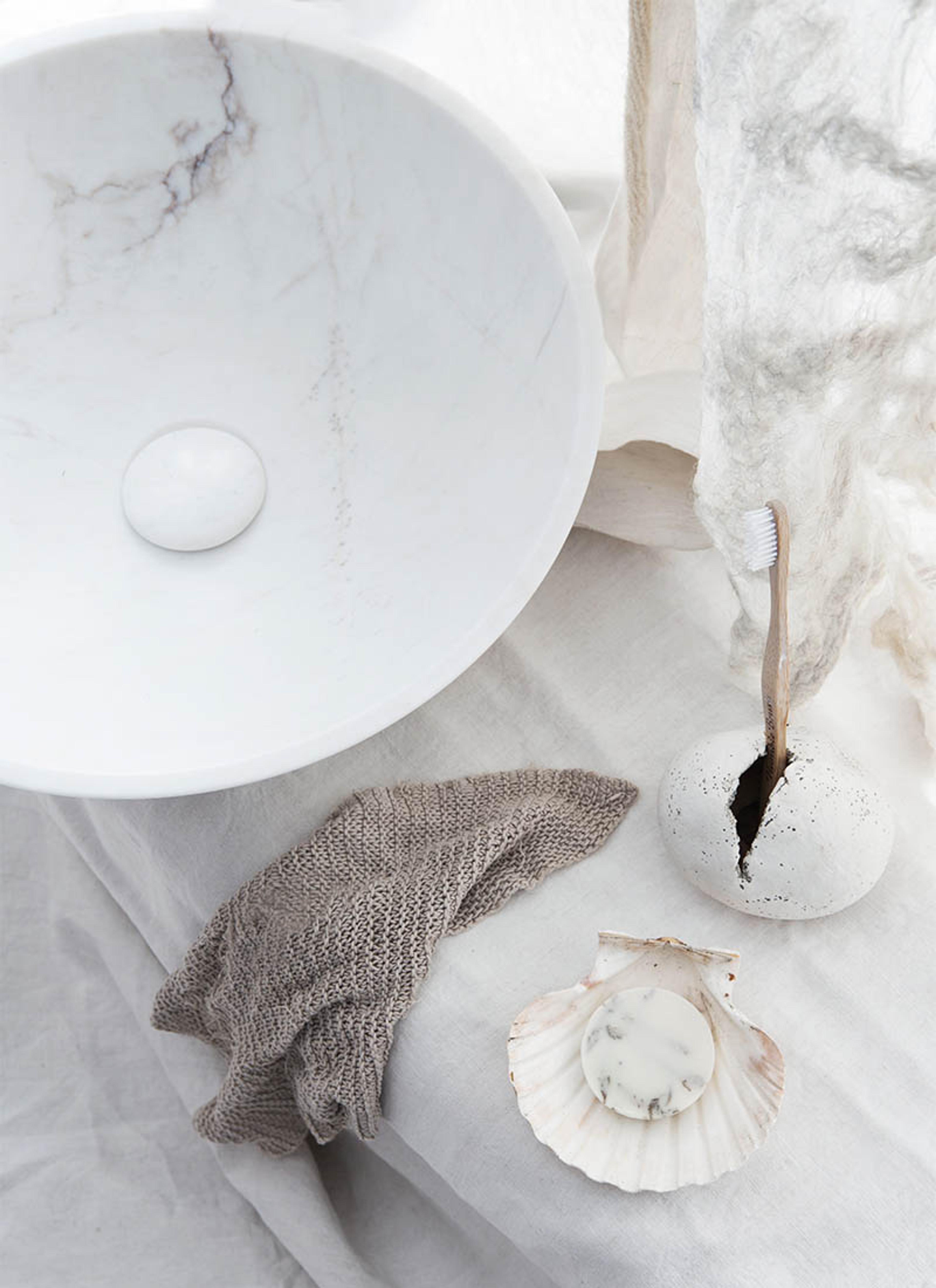 Eksklusiv marmor!ELVV White Rubi bolleservant i hvit marmor med partier i brunt og grått skjær. Fargetonene i marmoren gir en varm tone på baderommet.