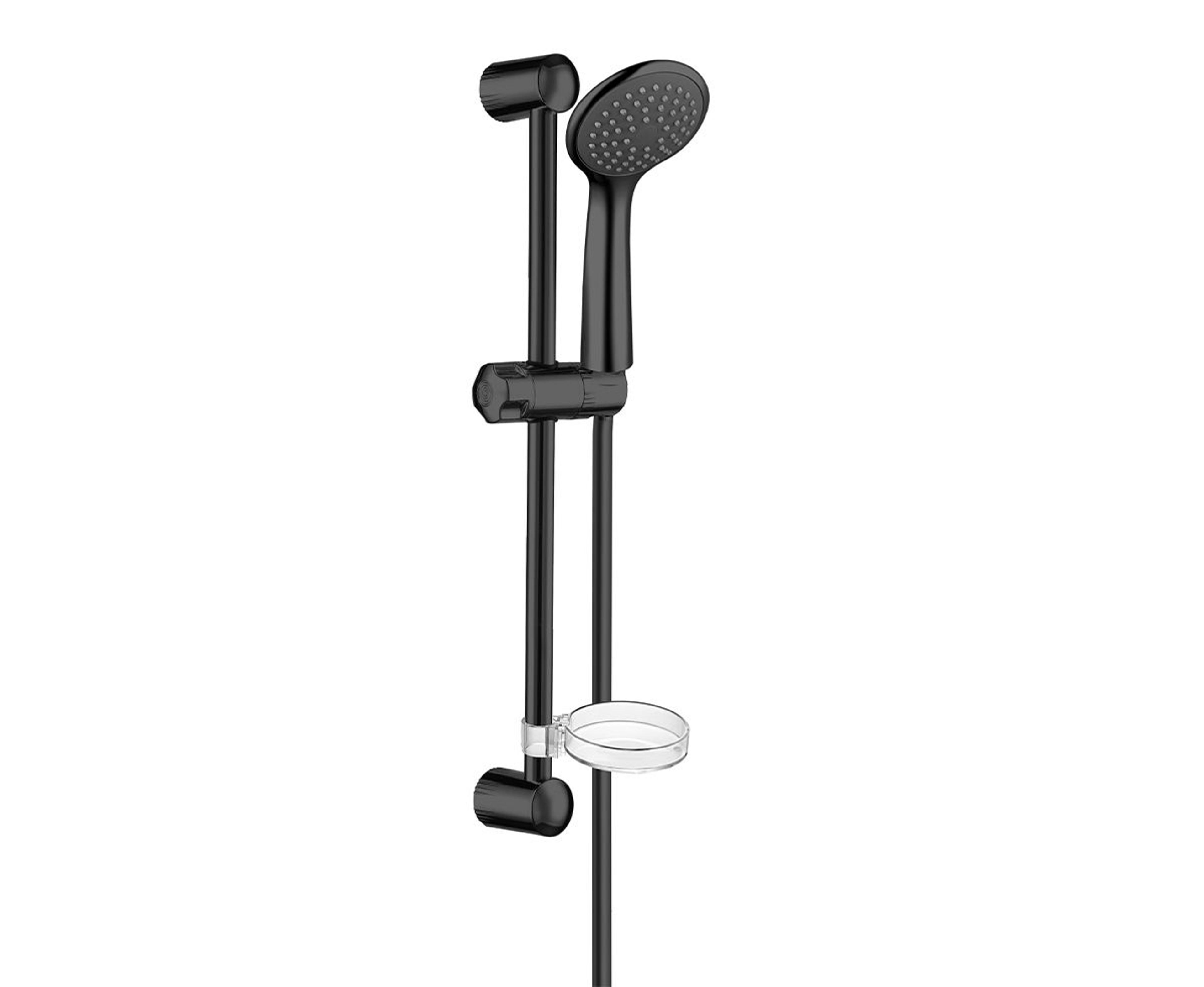 Dusjsett som inkluderer hånddusj, dusjstang, dusjslange og såpekopp. Praktisk og enkel hånddusj med én stråle. Farge: Sort Matt