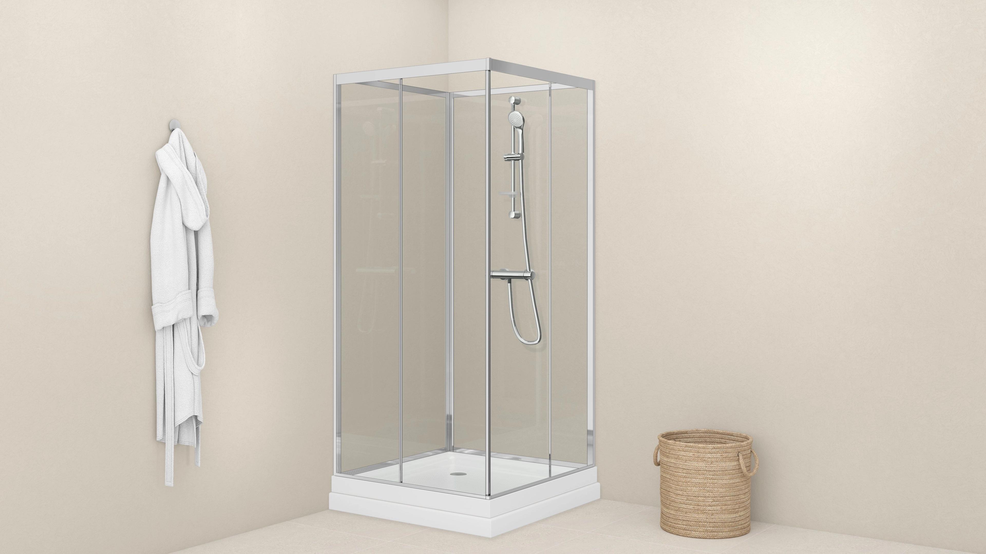 2 meter høyt, vendbart kabinett. Dørene har doble hjul oppe og nede. Dusjbatteri ikke inkludert. Mål: 90x90 cm.