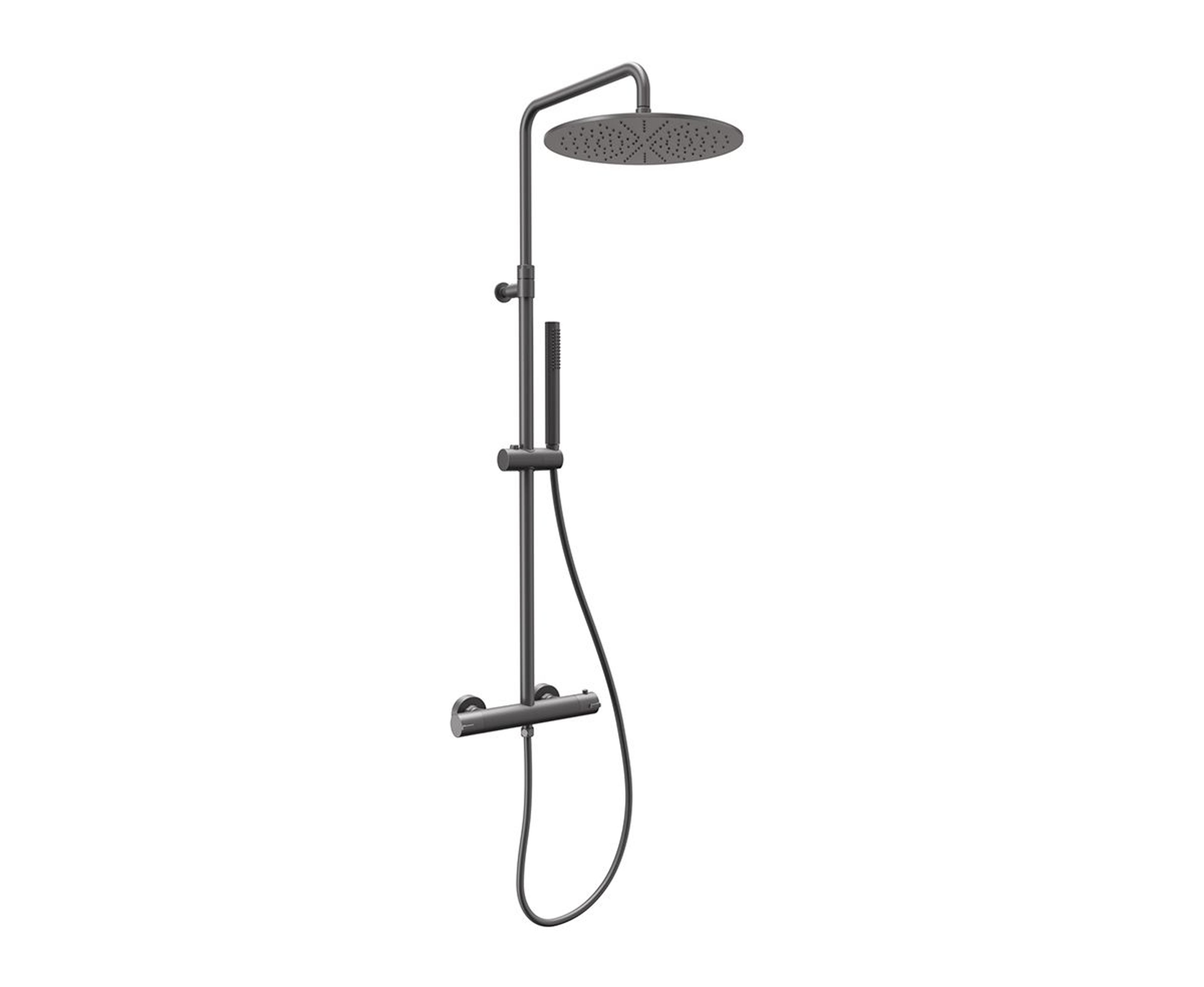 Takdusjsett med trykkbalansert dusjbatteri som sørger for rask tilpasning ved temperatur- og trykkendringer. Dusjhodet har en diameter på 30 cm. Takdusjen kan dreies og høydejusteres (med en standardmonteringshøyde på 110 cm). Farge: Blyantsvart