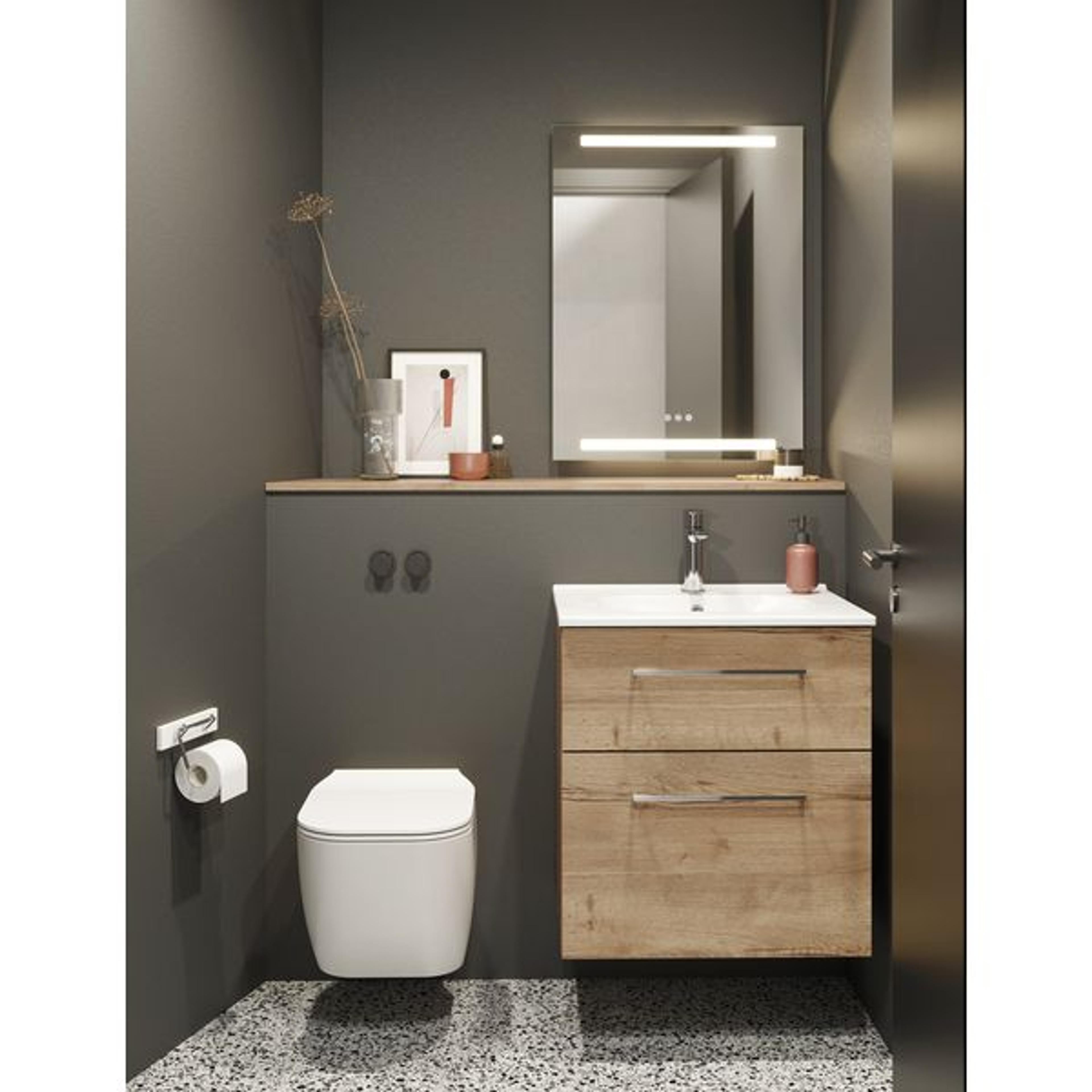 Baderomsmøbel i natur eik som inkluderer servantskapet (64x60x44 cm) med to skuffer og soft-close, Kantate porselensservant (61x45 cm) i hvit og Level speil (80x60 cm) med integrert LED-lys og lysstyring. Pris uten servantkran.