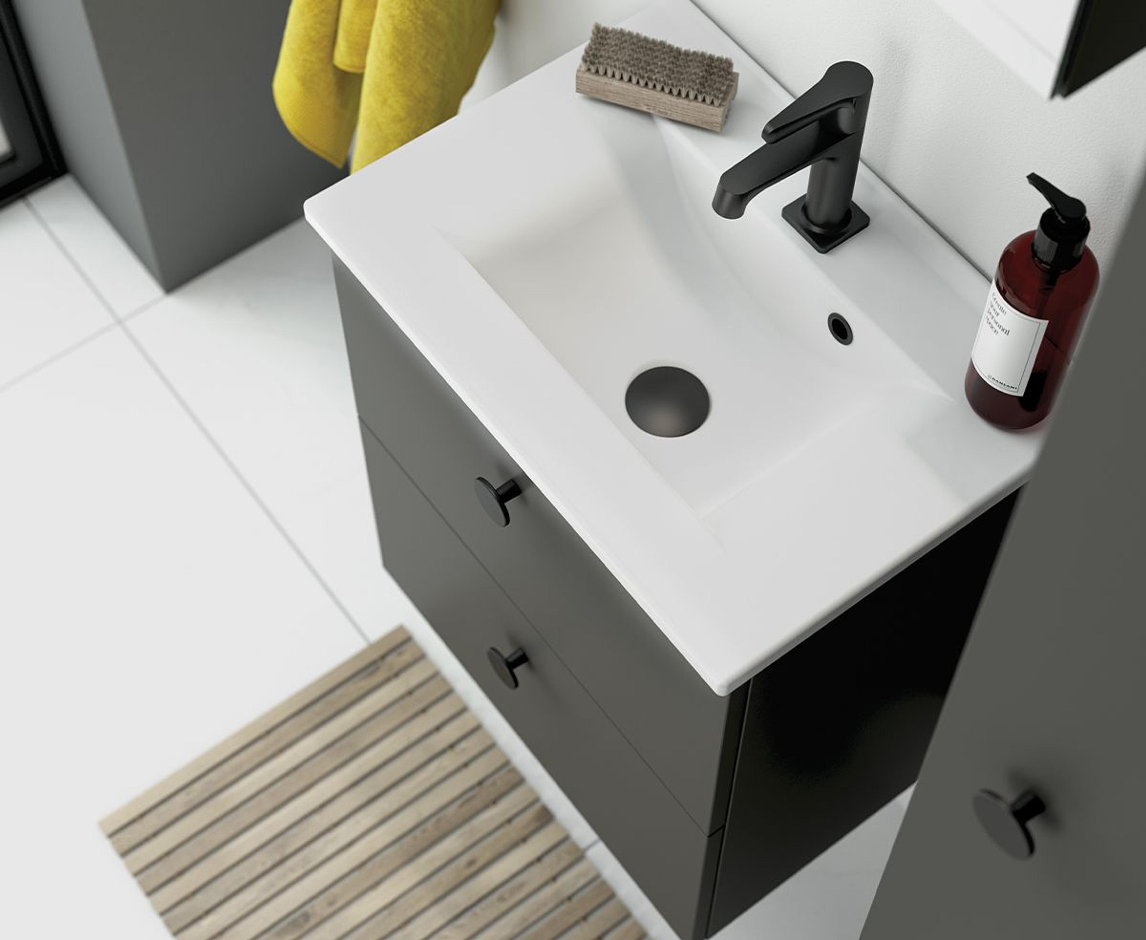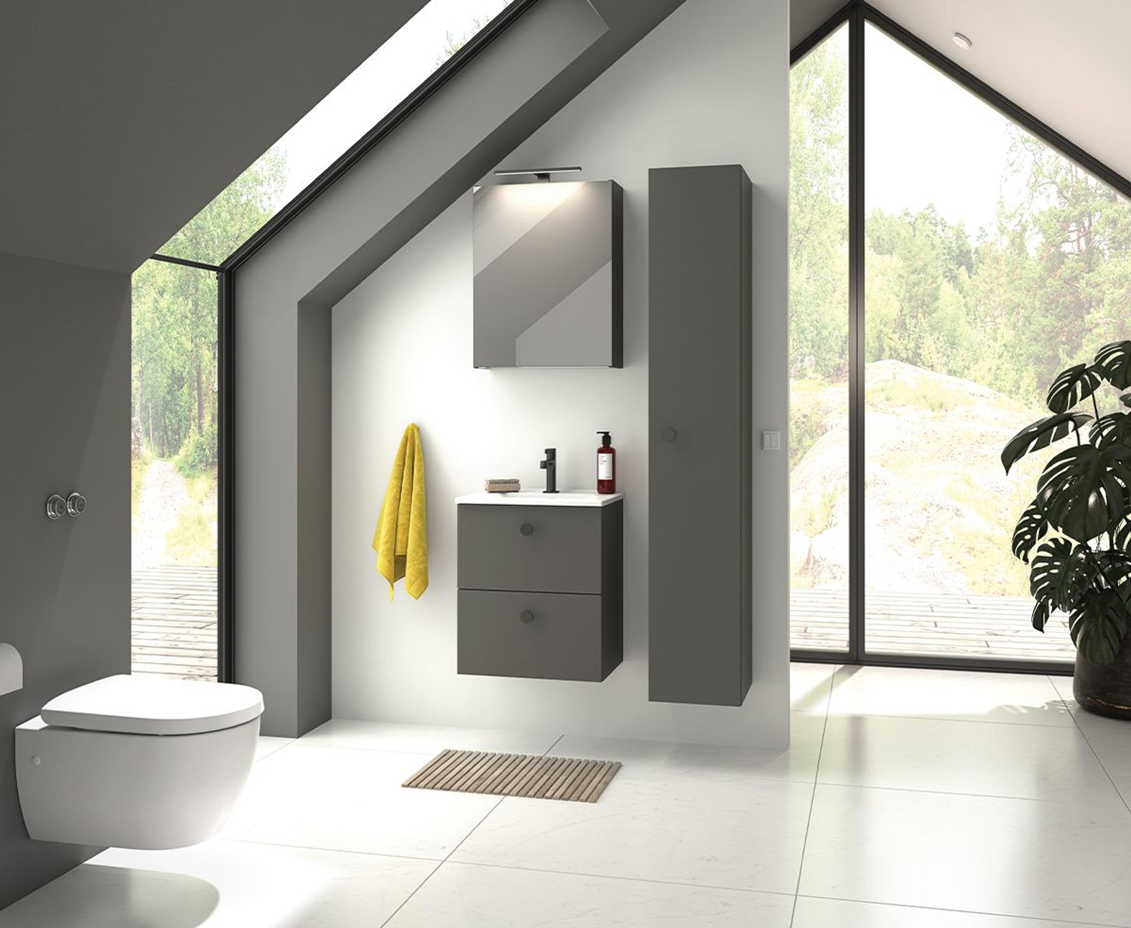Baderomsmøbelet inkluderer servantskap i grå matt (50x57,6x35 cm) med to myktlukkende skuffer og sort Button grep. Amber Mini porselensservant i hvit (51x1,8x36,5 cm) og Select speilskap (50x64x17 cm) med Libra LED-lampe. Pris uten høyskap og servantkran.