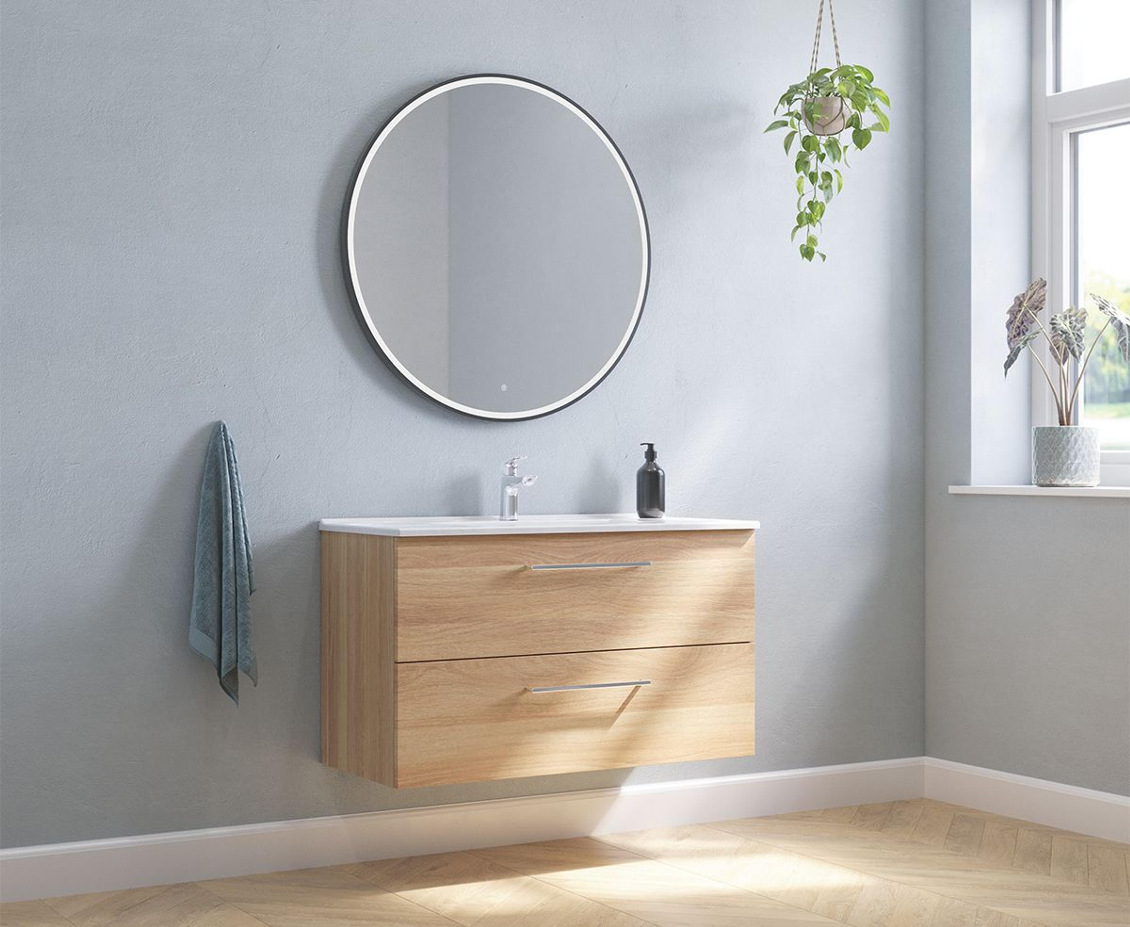 Baderomsmøbel i varm eik med som inkluderer servantskapet (100x57,6x44 cm) med to skuffer, soft-close og krom grep. Amber porselensservant (101x1,8x45,5 cm) i hvit blank og Shine speil (90x90x3,3 cm) med integrert LED-lys, bryter og dimmer. Pris uten servantkran.
