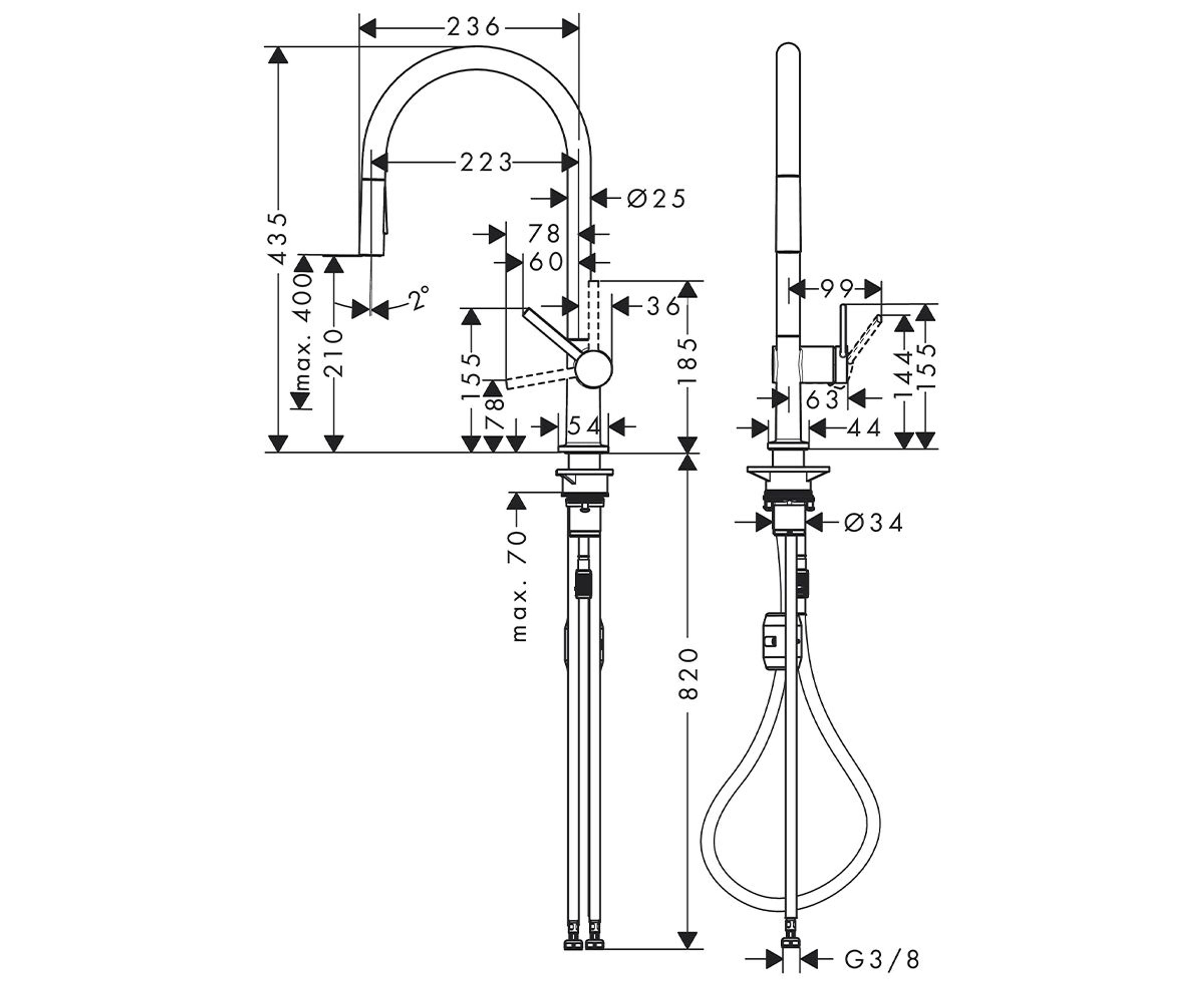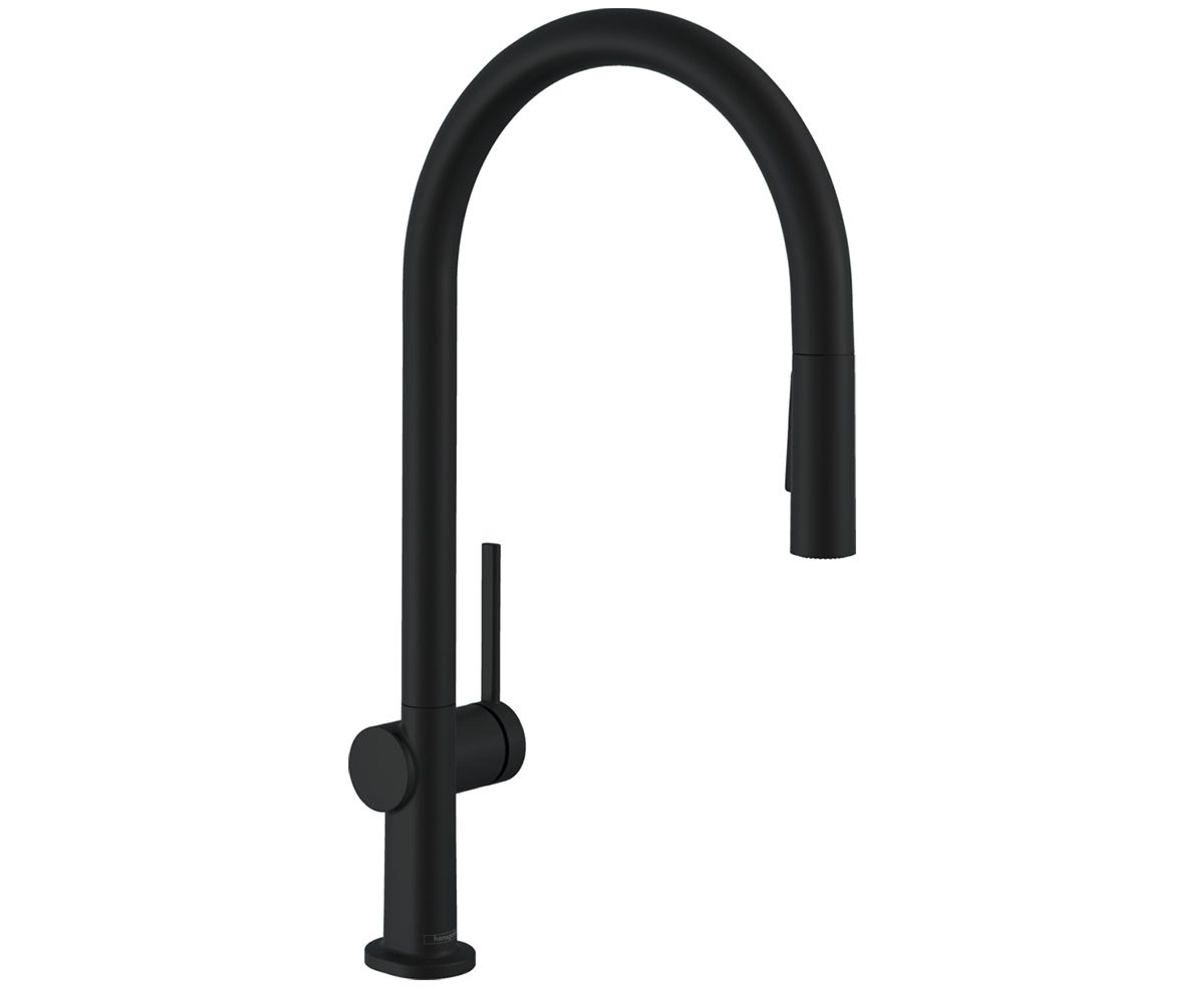 Elegant kjøkkenarmatur i matt sort fra Hansgrohe Talis M54-serien. Den har ComfortZone 210 og 2 stråletyper: laminærstråle og dusjstråle. Dusjstrålen er låsbar og stilles tilbake ved å trykke på venderknappen, og den stilles automatisk tilbake når grepet lukkes. Uttrekkslengden er opp til 50 cm. Svingområde kan stilles inn i 4 trinn på 60°, 110°, 150° eller 360°. Den har keramisk innmat og justerbar temperaturbegrensning. Maks gjennomstrømningsmengde ved 3 bar er 8 l/min. G 3/8 slangetilkoblinger. Kranhull Ø 35 mm kreves.