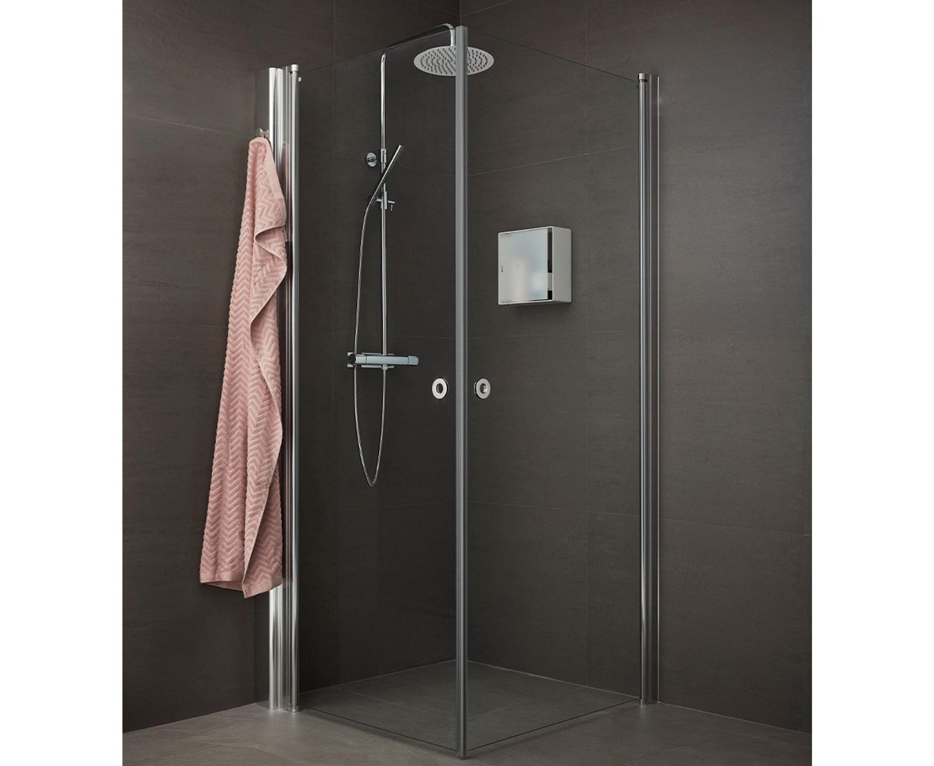 Dusjhjørne med to rette innsvingbare dører i 6 mm glass. Finnes i faste standardmål som du kan kombinere fritt, men også i måltilpasset utførelse. Kan kombineres med Pile.