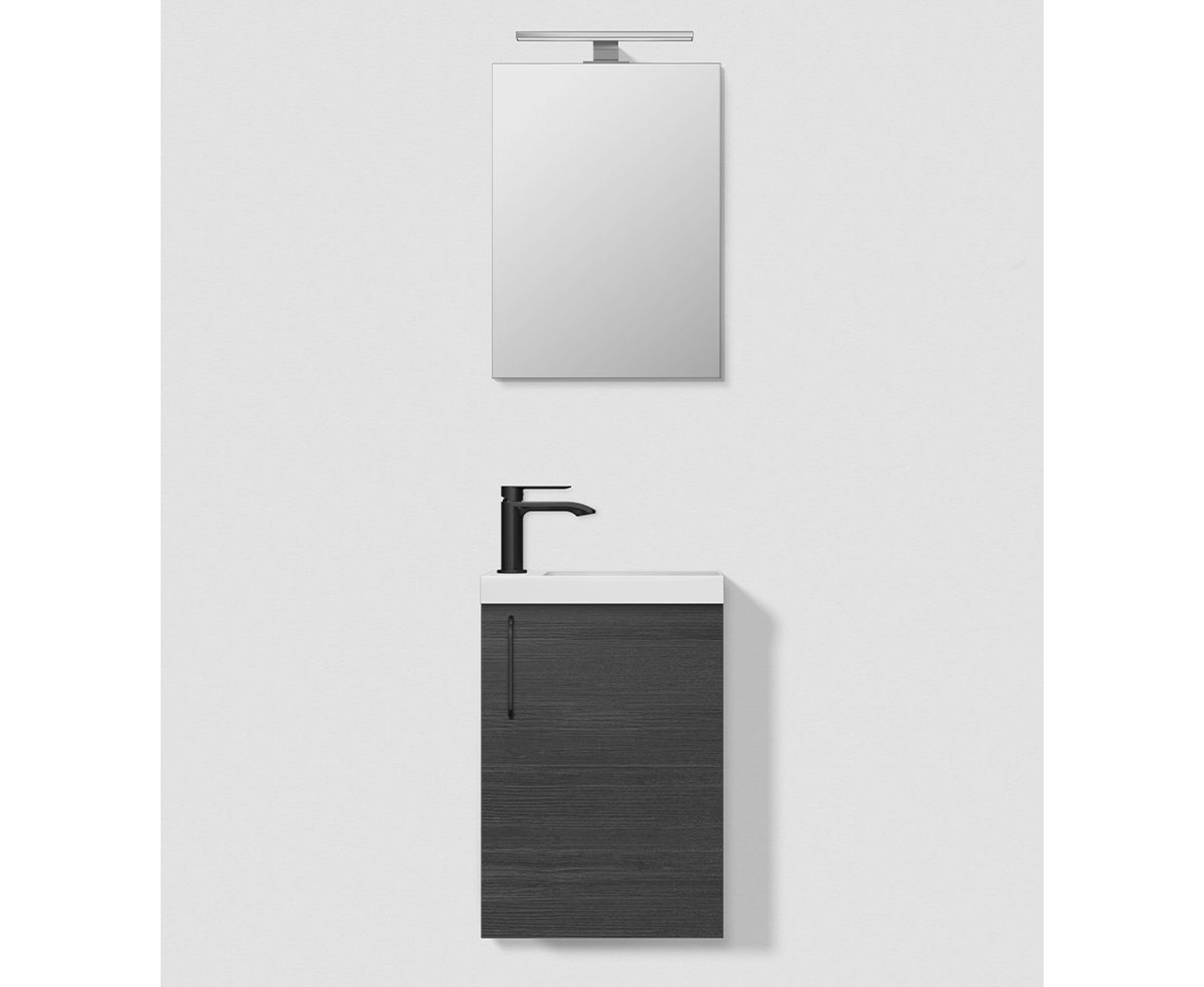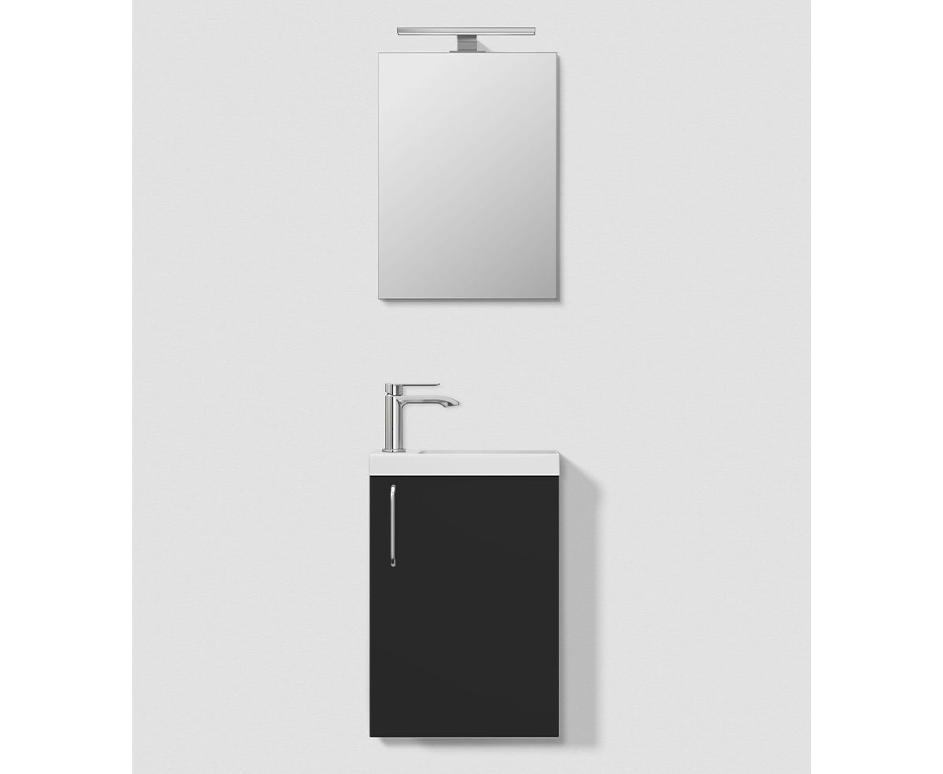 Baderomsmøbel i grå matt som inkluderer servantskapet (39,8x55x21,6 cm) med én dør og håndtak i krom. Enkel porselensservant (40x4,5x22,2 cm) i hvit og speil (40x55 cm) med toppmontert LED-lampe. Pris uten servantkran.