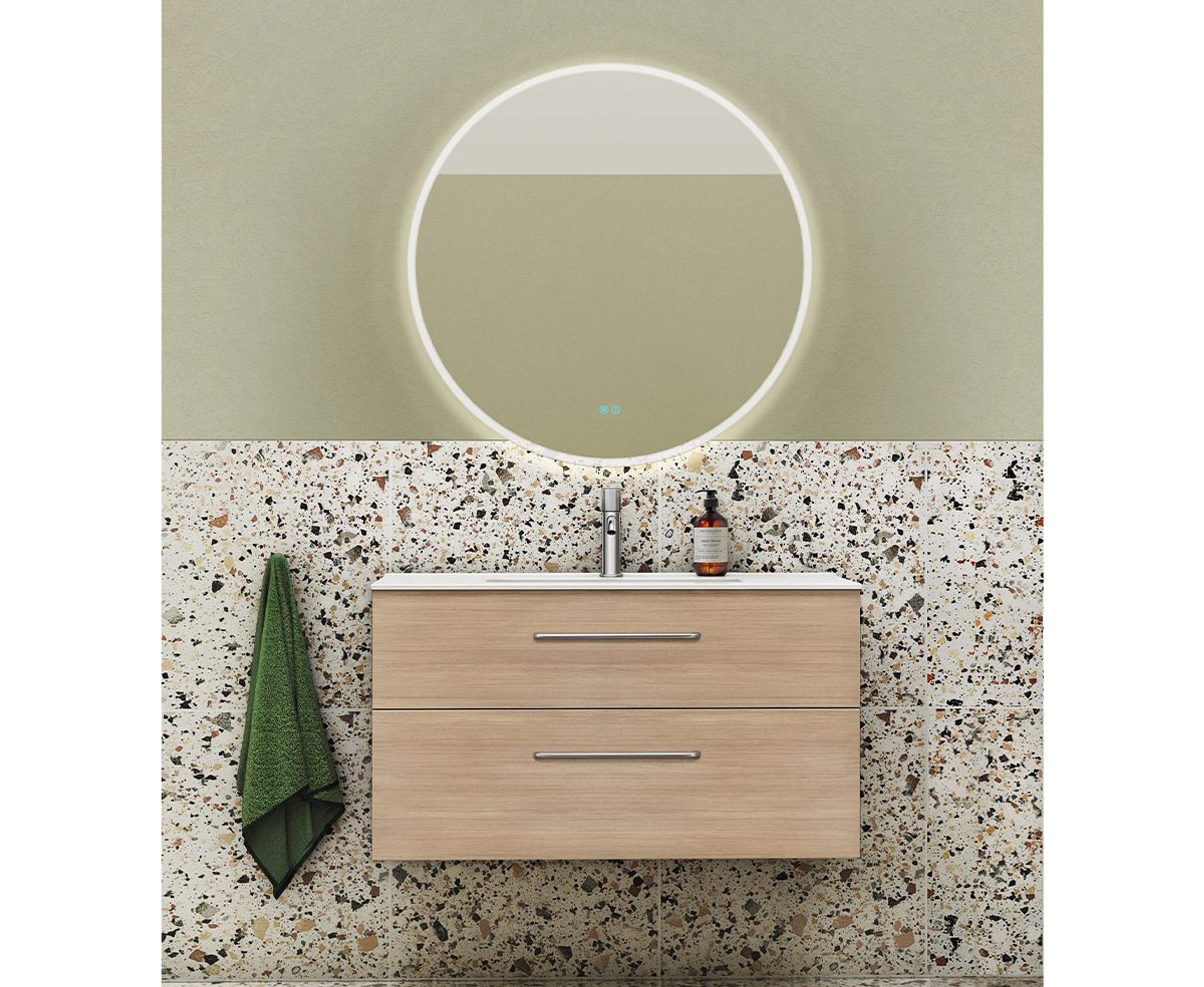 Baderomsmøbel i natur eik som inkluderer servantskapet (59,7x55x45,6 cm) med to skuffer og håndtak i krom. Heldekkende tynn porselensservant (61x17x46 cm) i hvit og firkantet speil (60x80x3,5 cm) med dimbart kaldt og varmt lys, og antidugg. Velg mellom flere ulike overflater og størrelser. Pris uten servantkran. Mål B x H x D: 61x56,8x46 cm