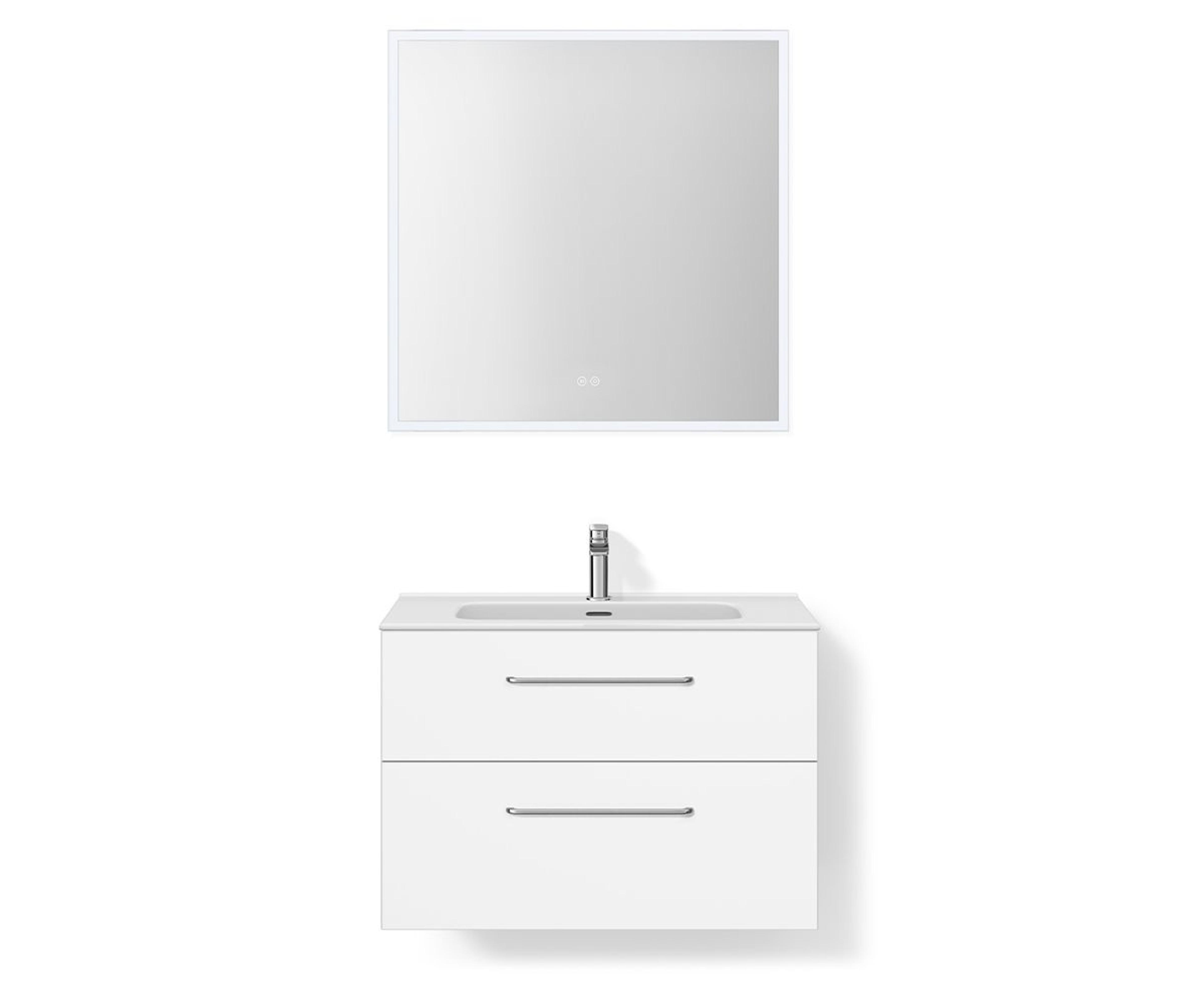 Baderomsmøbel i hvit matt som inkluderer servantskapet (79,7x55x45,6 cm) med to skuffer og håndtak i krom. Heldekkende tynn porselensservant (81x17x46 cm) i hvit og firkantet speil (80x80x3,5 cm) med dimbart kaldt og varmt lys, og antidugg. Velg mellom flere ulike overflater og størrelser. Pris uten servantkran. Mål B x H x D: 81x56,8x46 cm