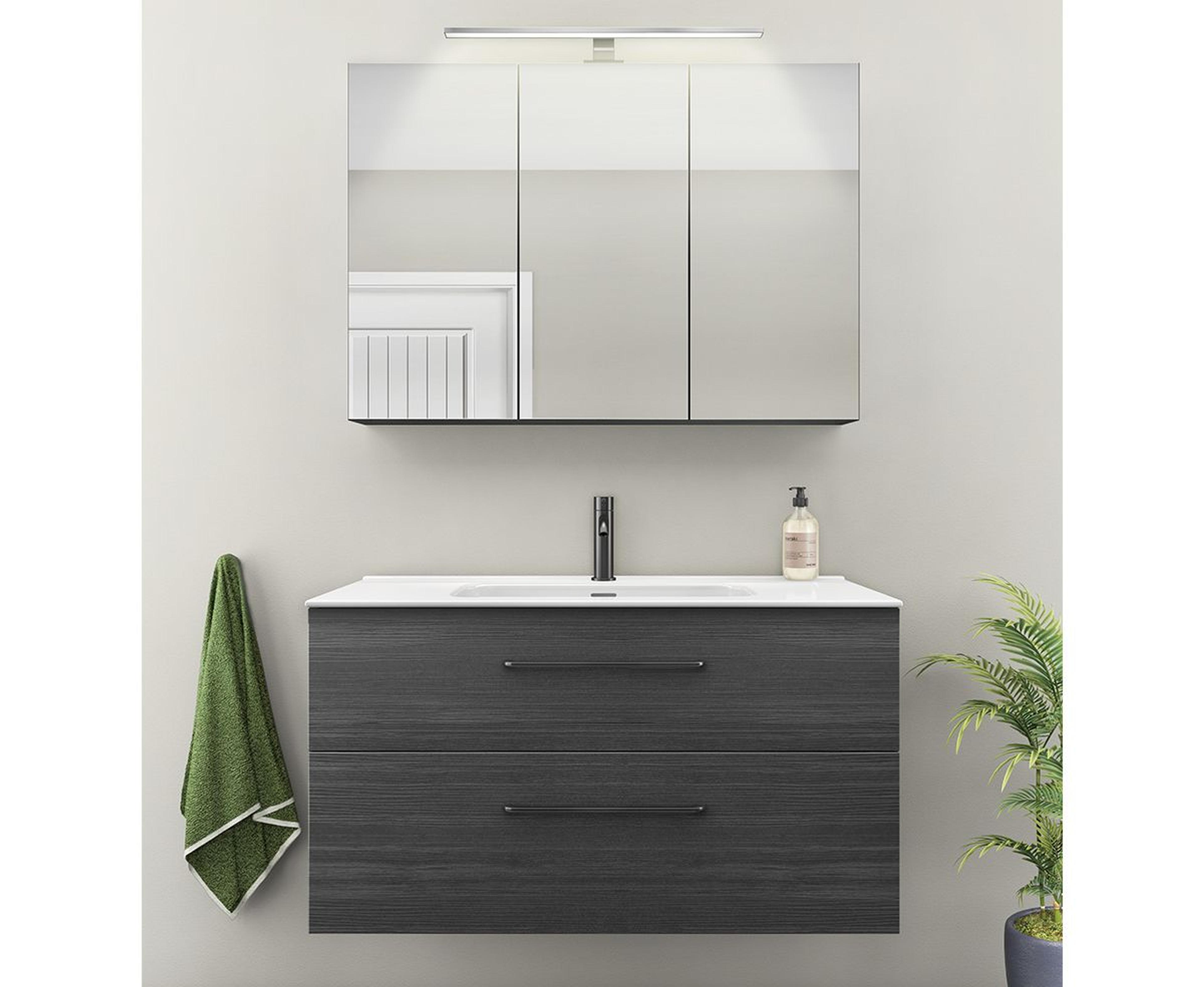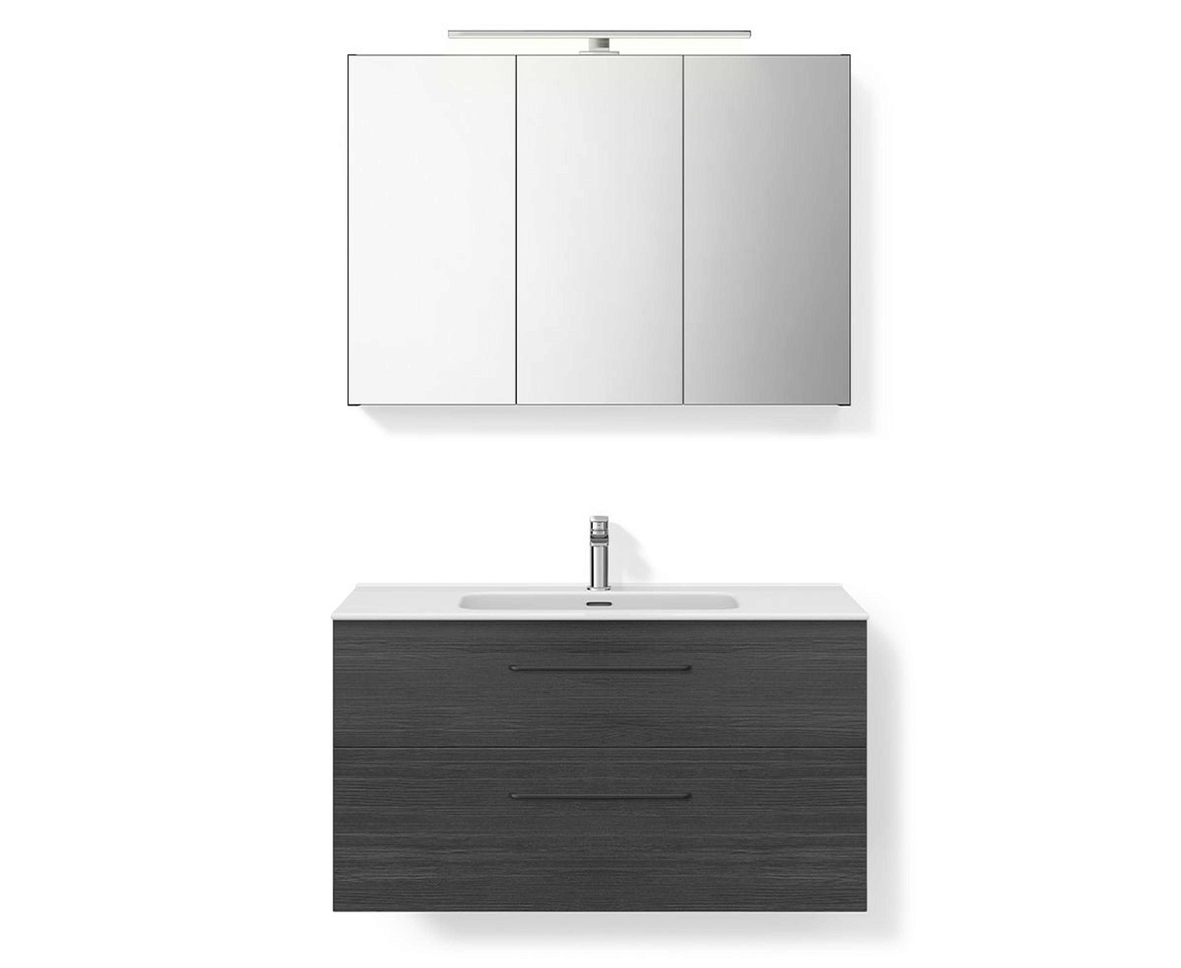 Baderomsmøbel i Sort Eik som inkluderer servantskapet (99,7x55x45,6 cm) med to skuffer og håndtak i krom. Heldekkende tynn porselensservant (101x17x46 cm) i hvit og speilskap (99,7x70x13,6 cm) med to-sidig speil, myktlukkende hengsler og toppmontert LED-lampe. Pris uten servantkran.