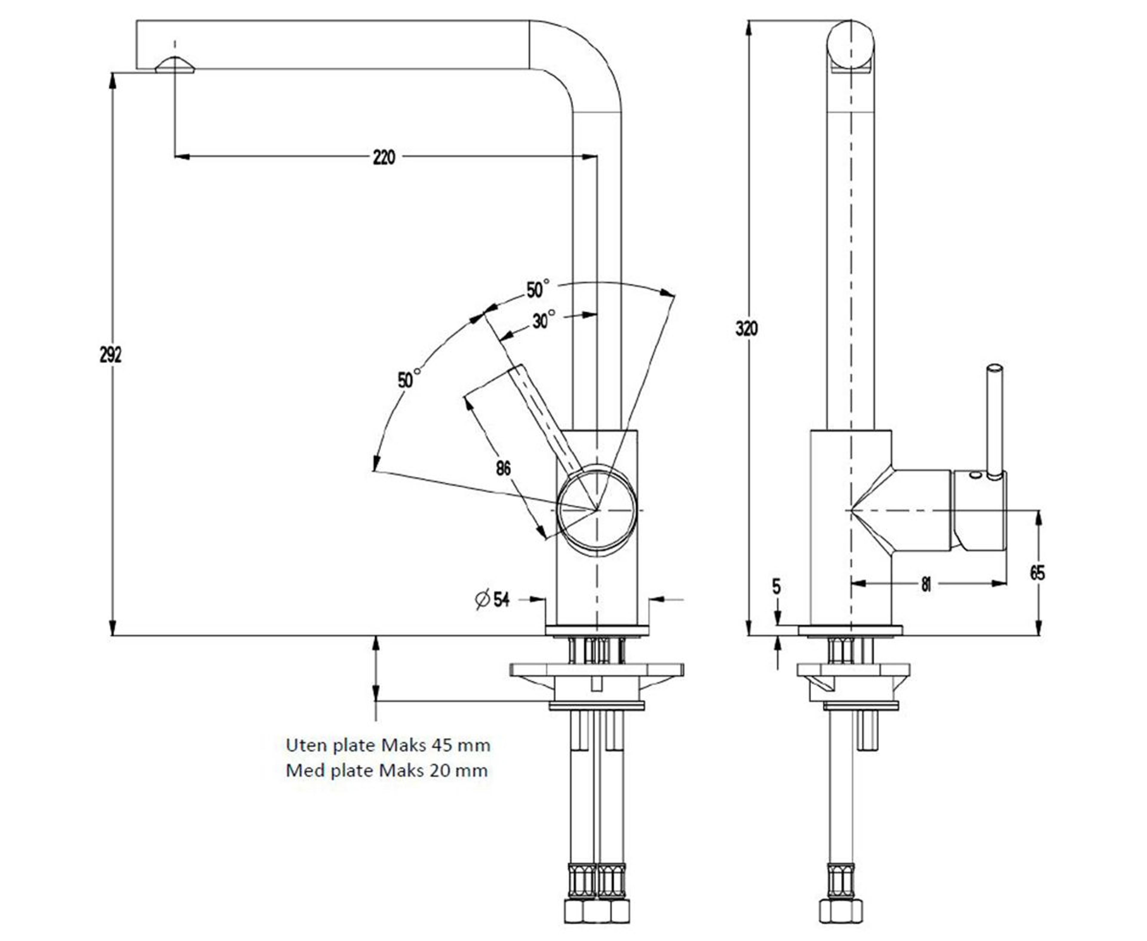 En elegant kjøkkenkran med ettgreps betjening, svingbar L-tut og fleksible slanger. Karakteristisk og stilsikker kran med rette, slanke og stramme linjer.