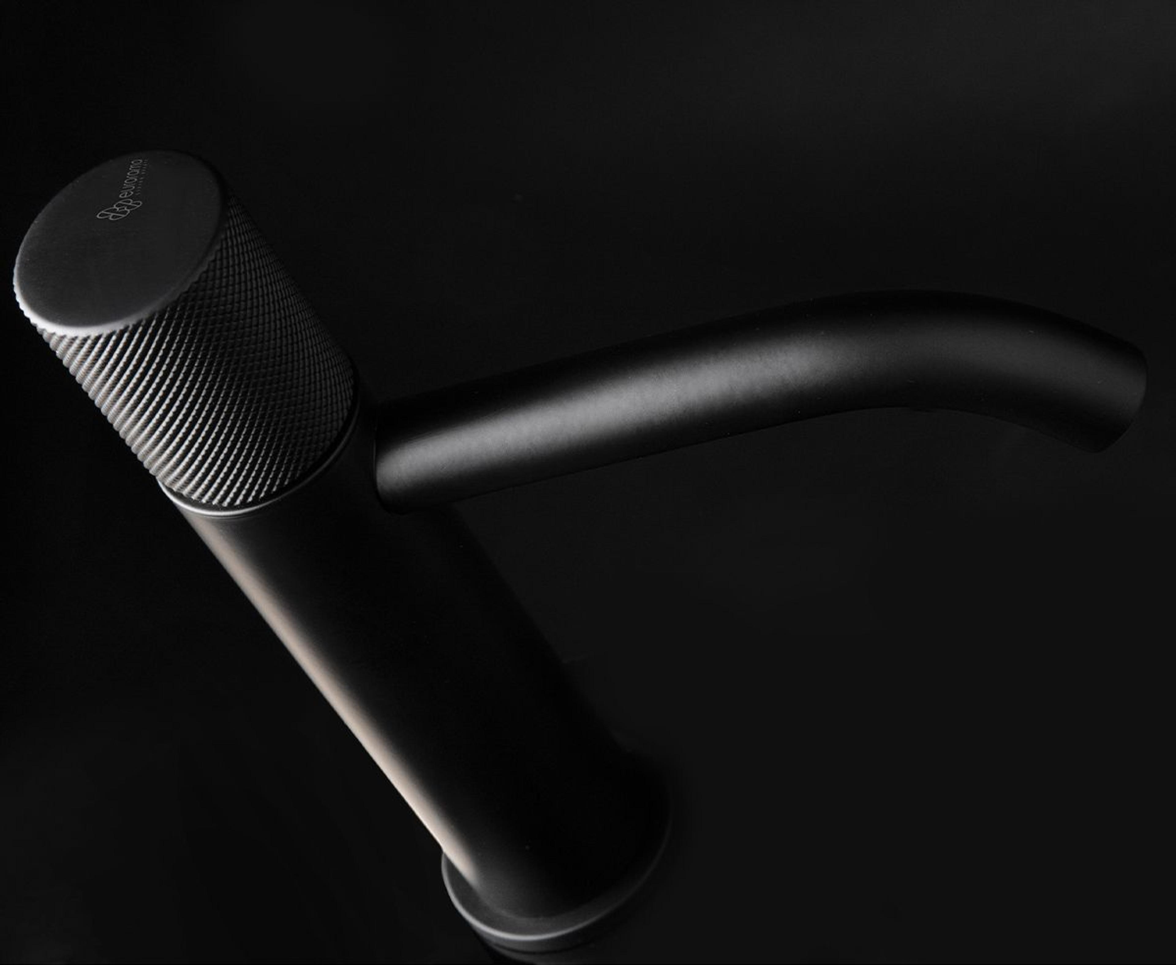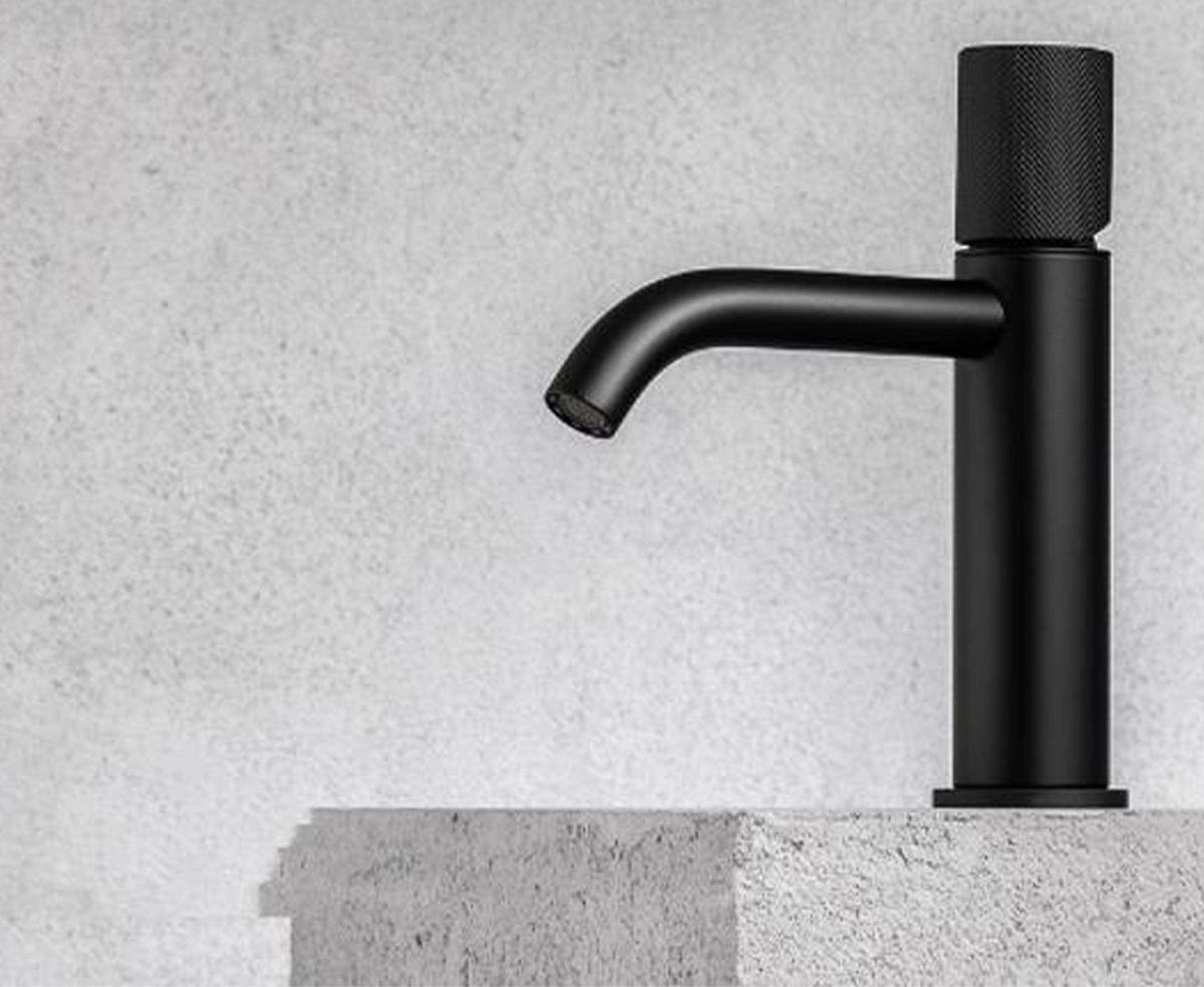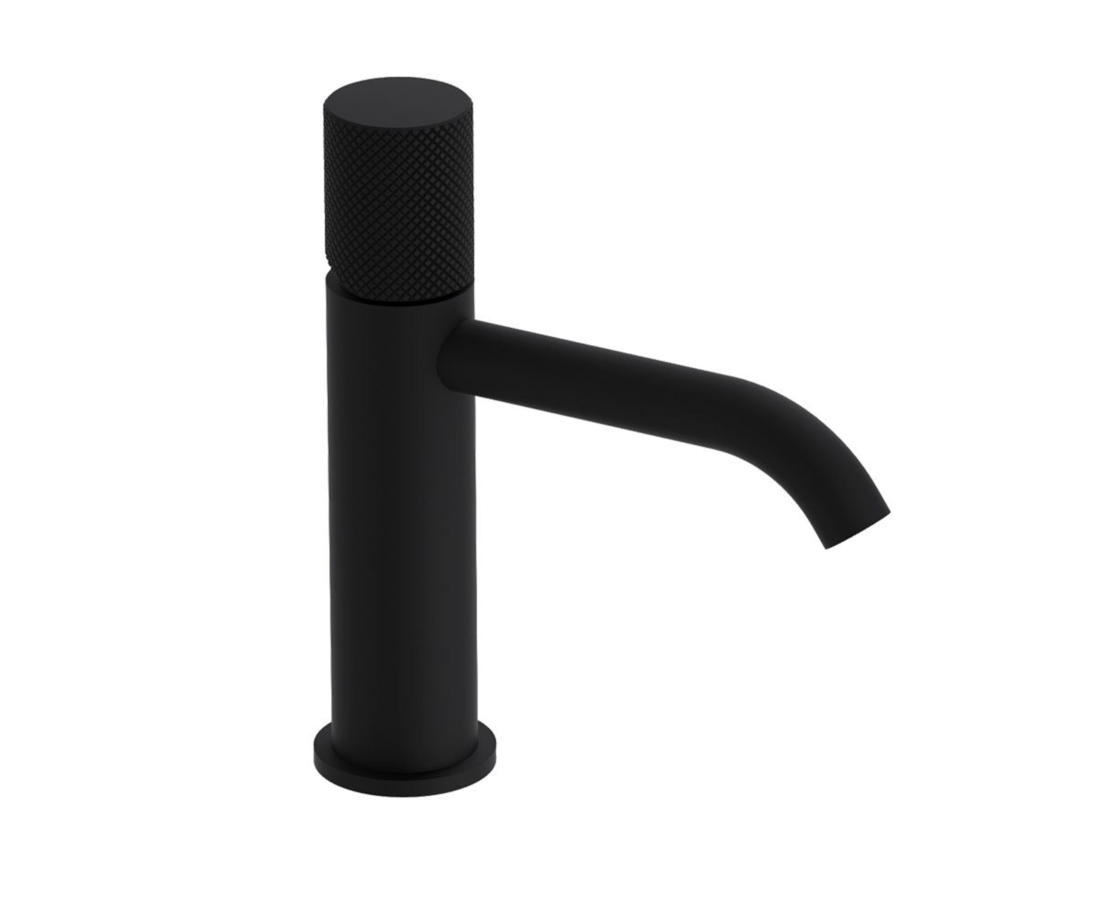 Servantkran med ettgreps betjening med toppmontert hendel i en strukturert overflate. Kranen er utstyrt med keramisk innmat og fleksible tilkoblingsslanger. Farge: Sort Matt