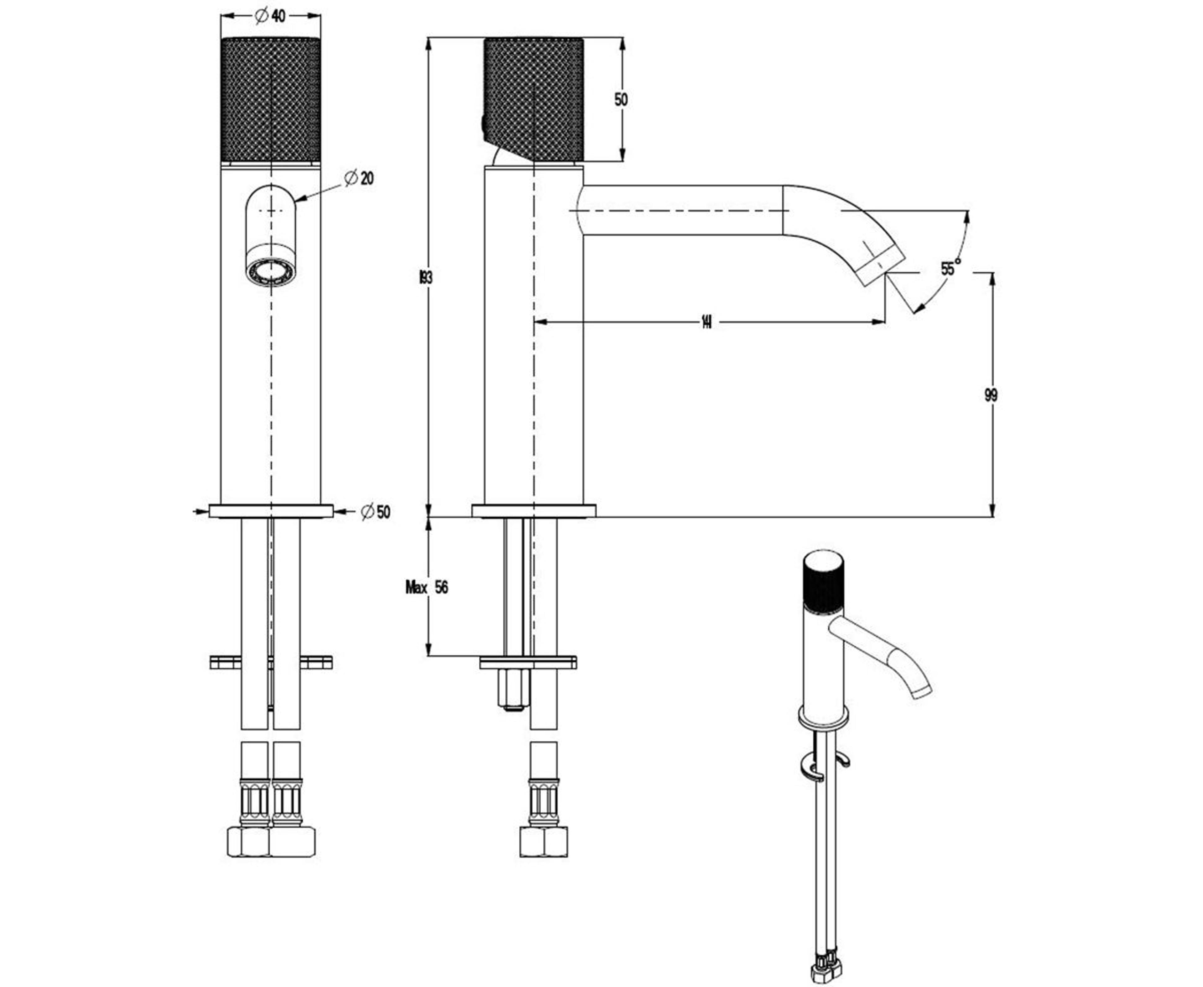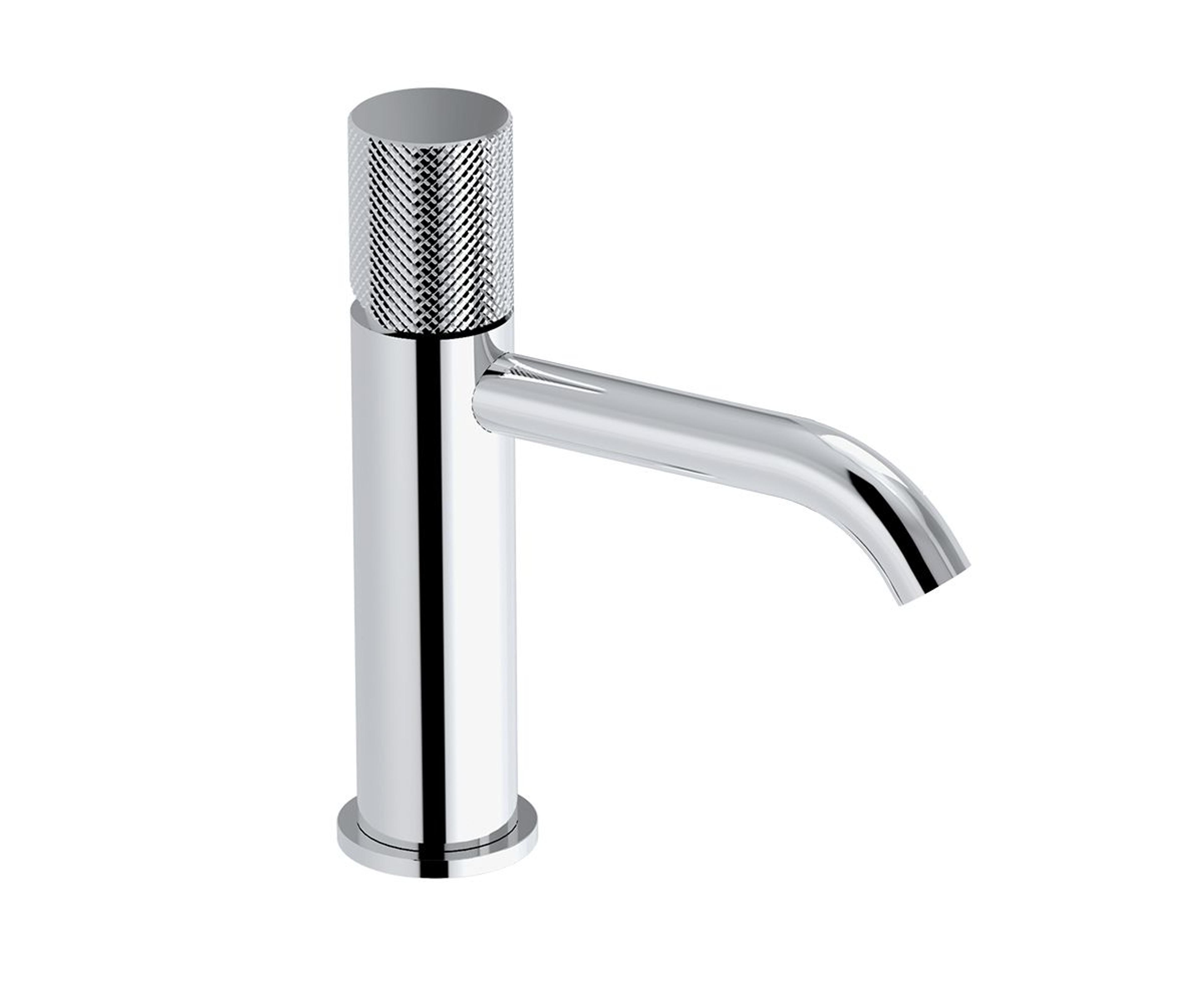 Servantkran med ettgreps betjening med toppmontert hendel i en strukturert overflate. Kranen er utstyrt med keramisk innmat og fleksible tilkoblingsslanger. Farge: Krom