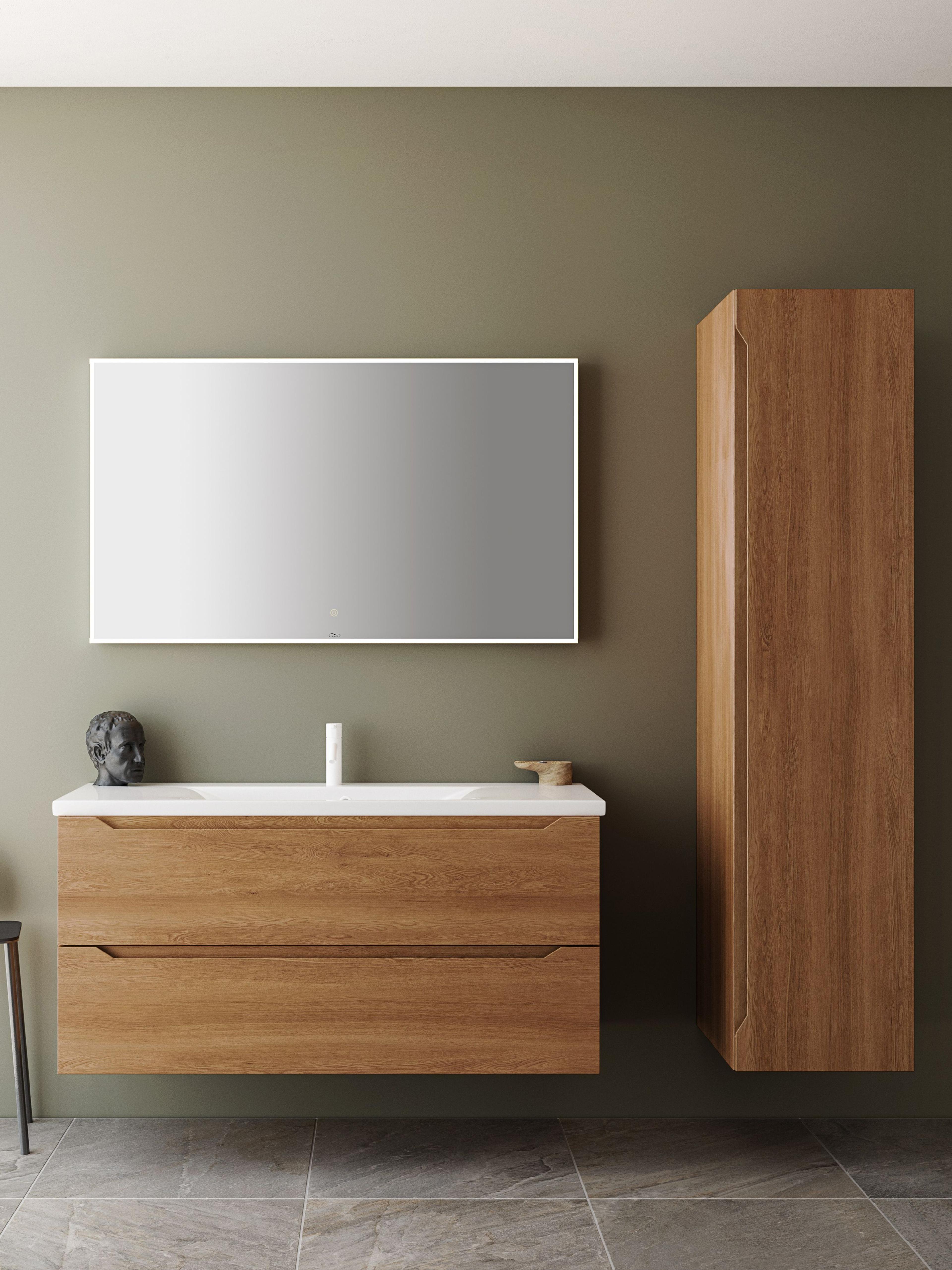 Baderomsmøbel i eik med to skuffer og integrerte grep. Bredde 120 cm. Inkludert Heine porselensservant og VANGE speil med hvit ramme. Pris uten blandebatteri. Mål B x H x D: 120x60,5x46 cm