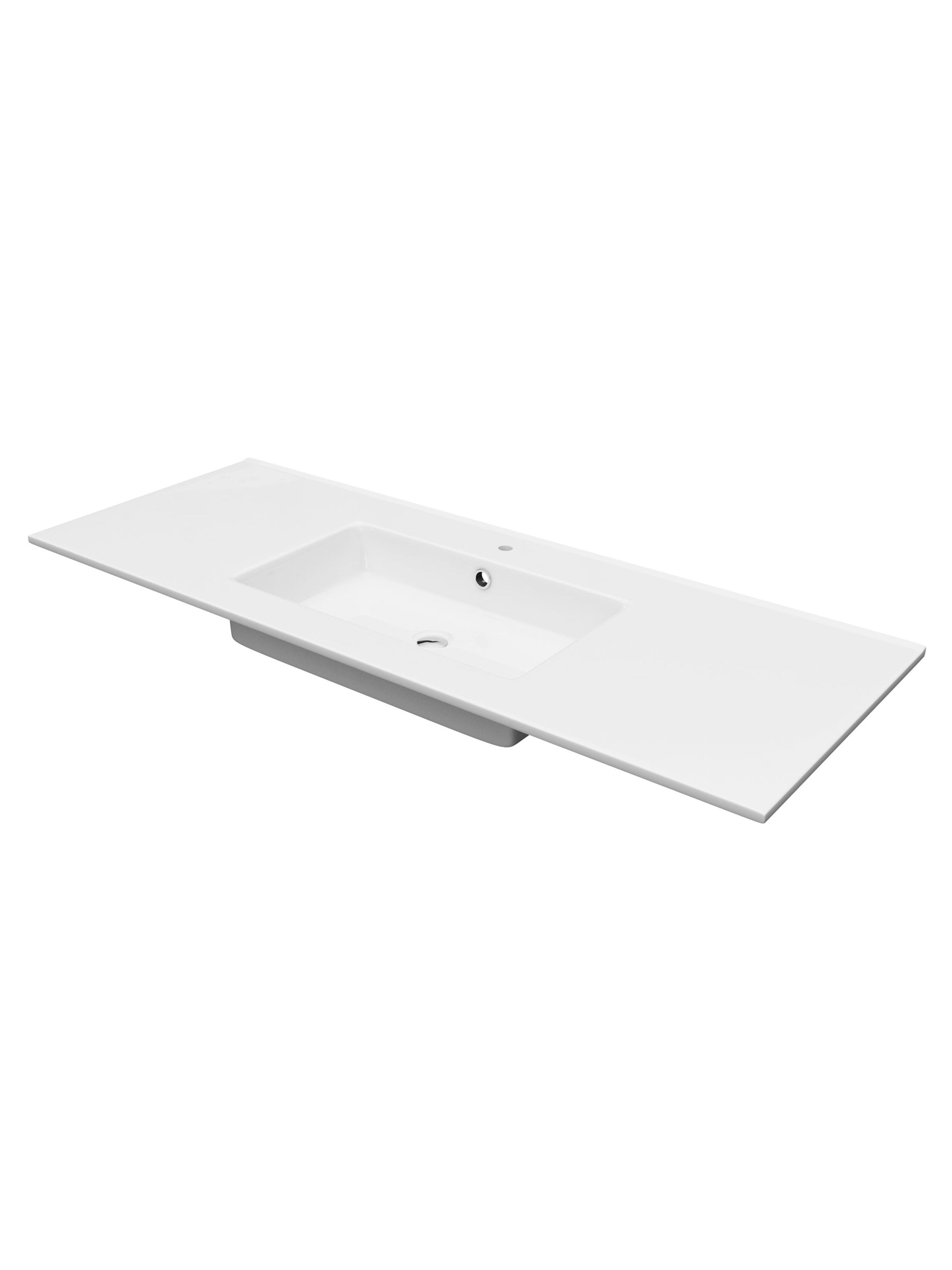 Baderomsmøbel i eik som inkluderer servantskapet (120x57x45,7 cm) med to skuffer og integrerte grep. FREYA porselensservant (121x1,5x46 cm) i hvit og VANGE speil (120x70x5 cm) med hvit ramme og dimmeknapp. Pris uten servantkran og høyskap. Mål B x H x D: 121x58,5x46 cm