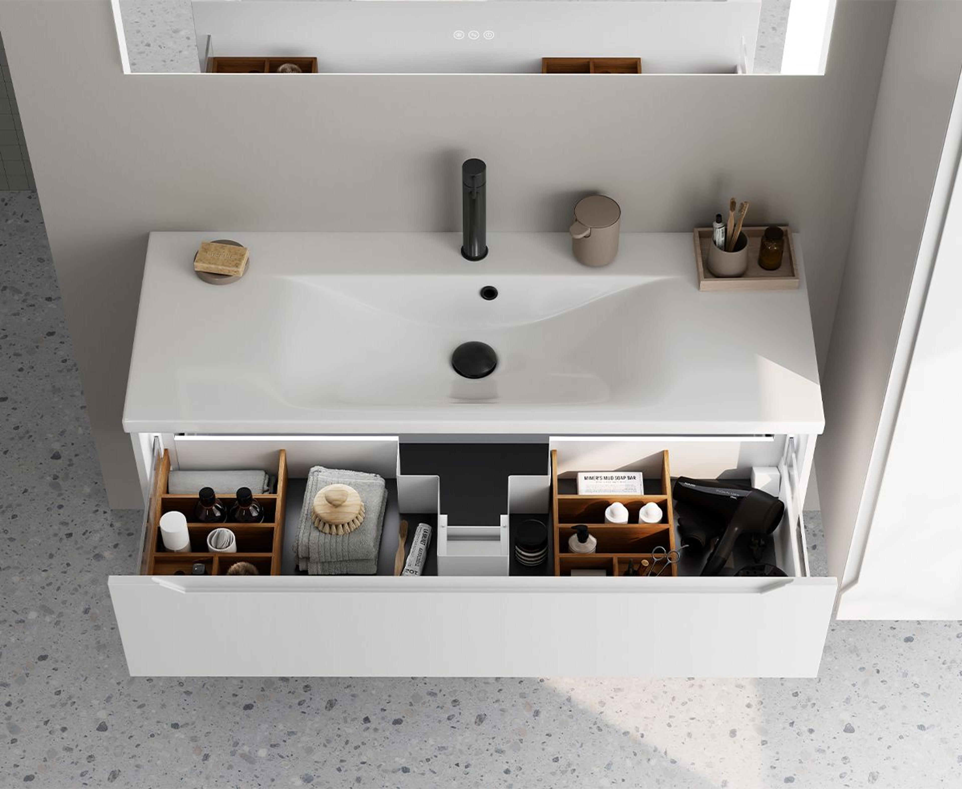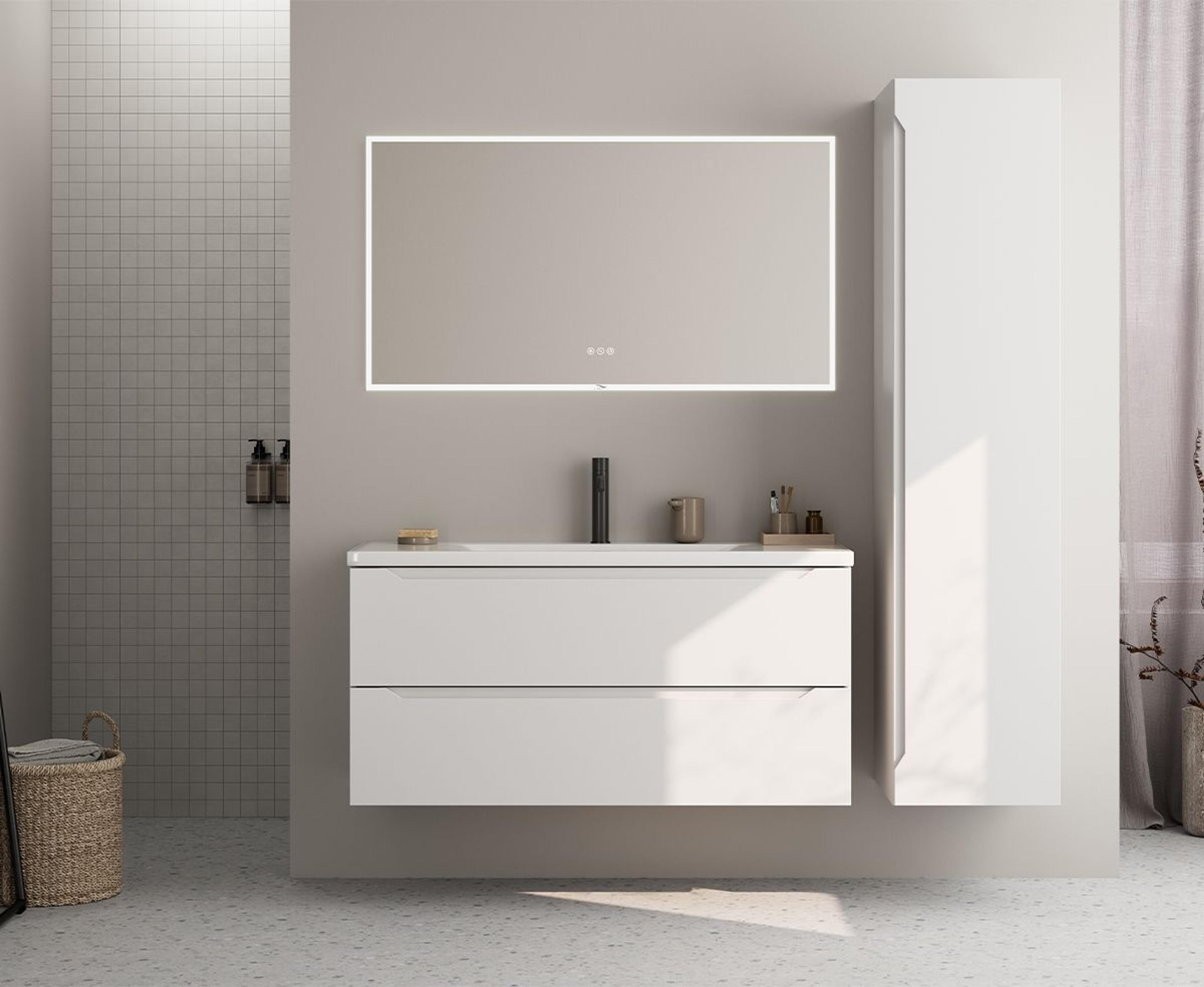 Baderomsmøbel i hvit matt som inkluderer servantskapet (120x57x45,7 cm) med to skuffer og integrerte grep. HEINE porselensservant (121x3,5x46 cm) i hvit og FRAMFJORD speil (120x65x2,5 cm) med frostet ramme og berøringspanel. Pris uten servantkran og høyskap. Mål B x H x D: 121x60,5x46 cm