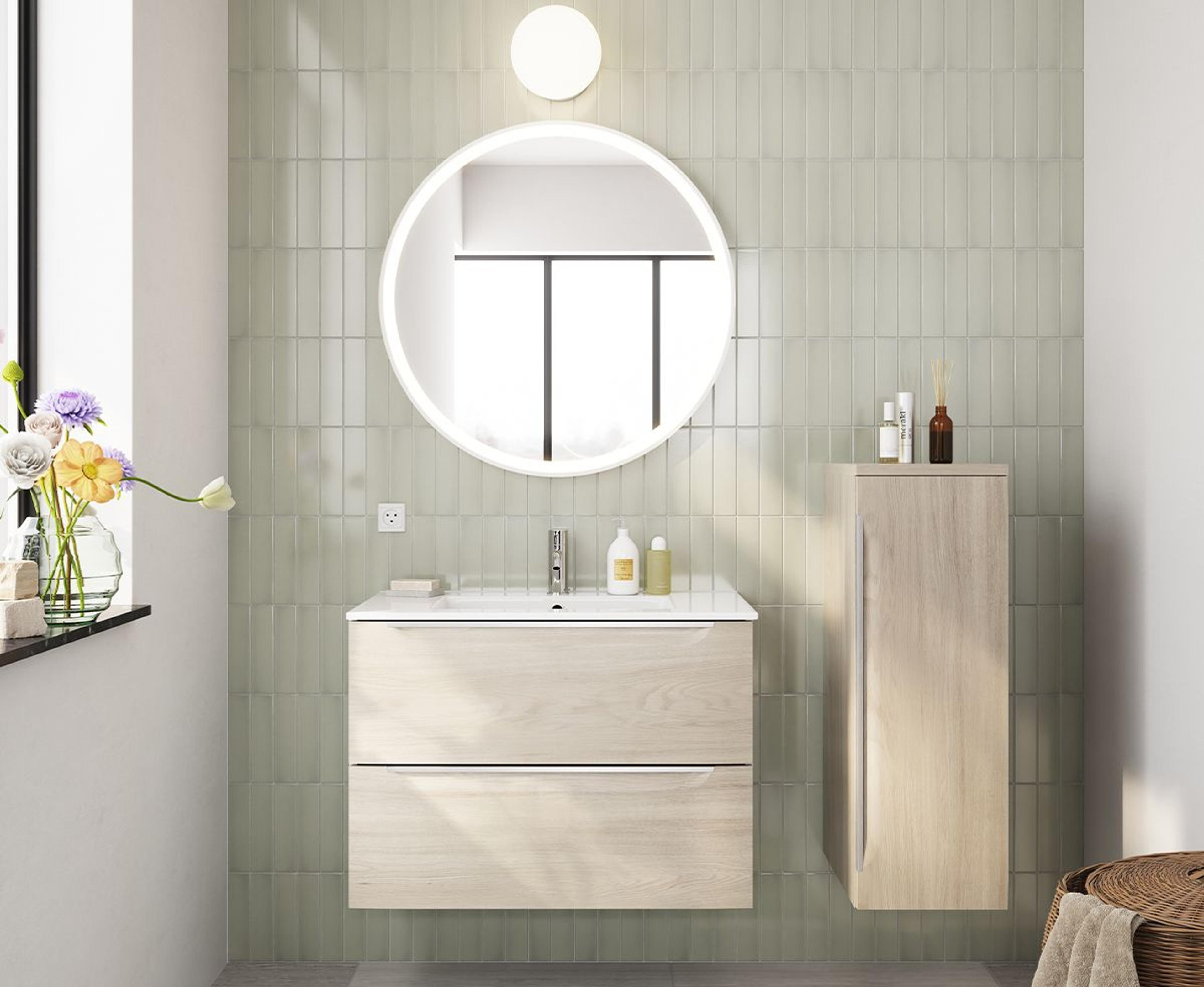Baderomsmøbel i lys eik som inkluderer servantskapet (80x57x35 cm) med to skuffer og innfelte håndtak. FREYA SMAL porselensservant (81x1,5x36,5 cm) og STEIM rundt speil (Ø80 cm) med lysramme. Pris uten servantkran og sideskap.