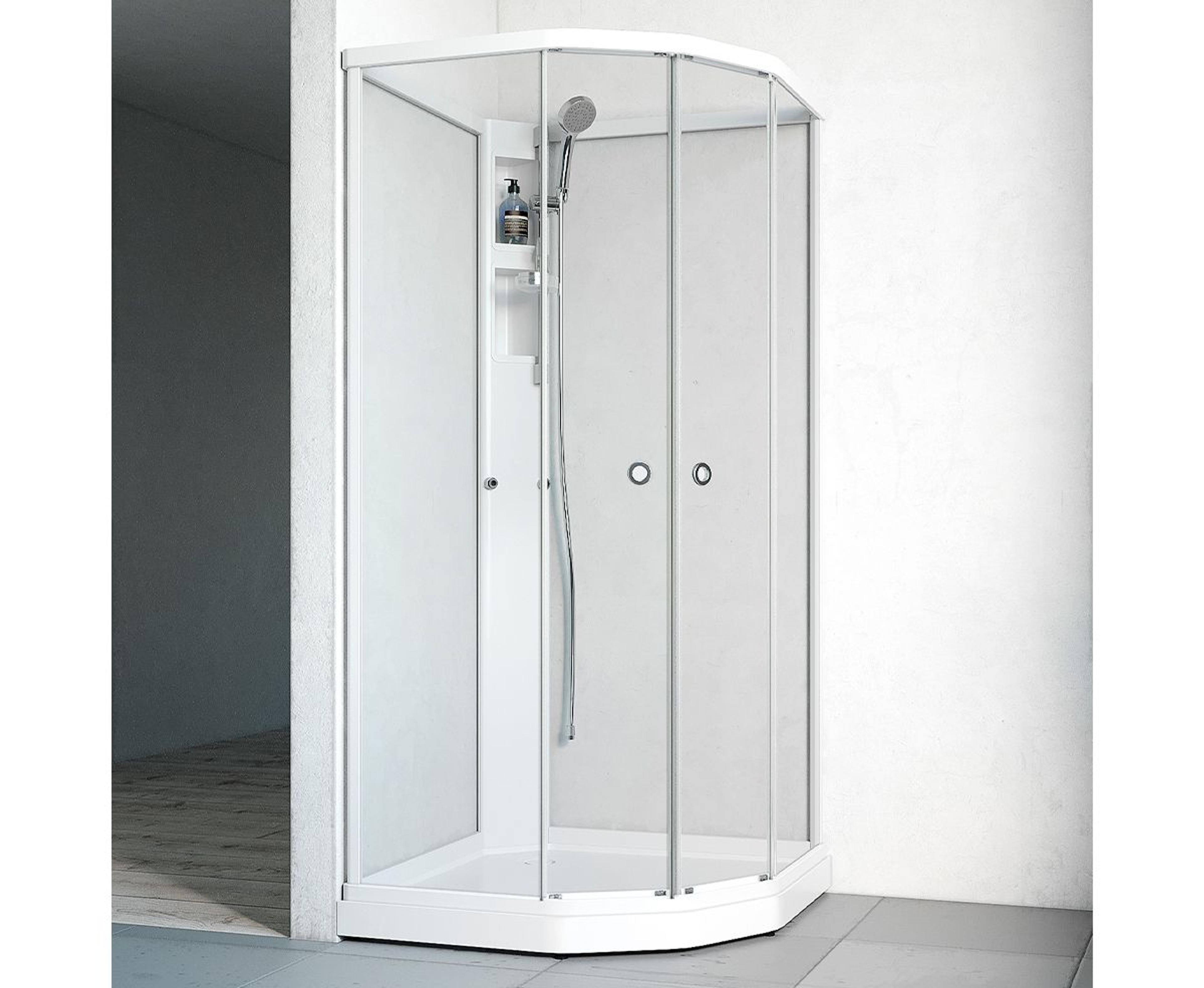 Flow Semi Kabinett har et moderne uttrykk med slanke profiler i hvit, klarglass, støpemarmorkar og skjult avløp. Enkel å montere med minimalt med skruer da mange av delene har klemfunksjon. Servicehylle for utenpåliggende blandebatteri. Dusjsett Nifty inngår. Mål: 81x81x198 cm.
