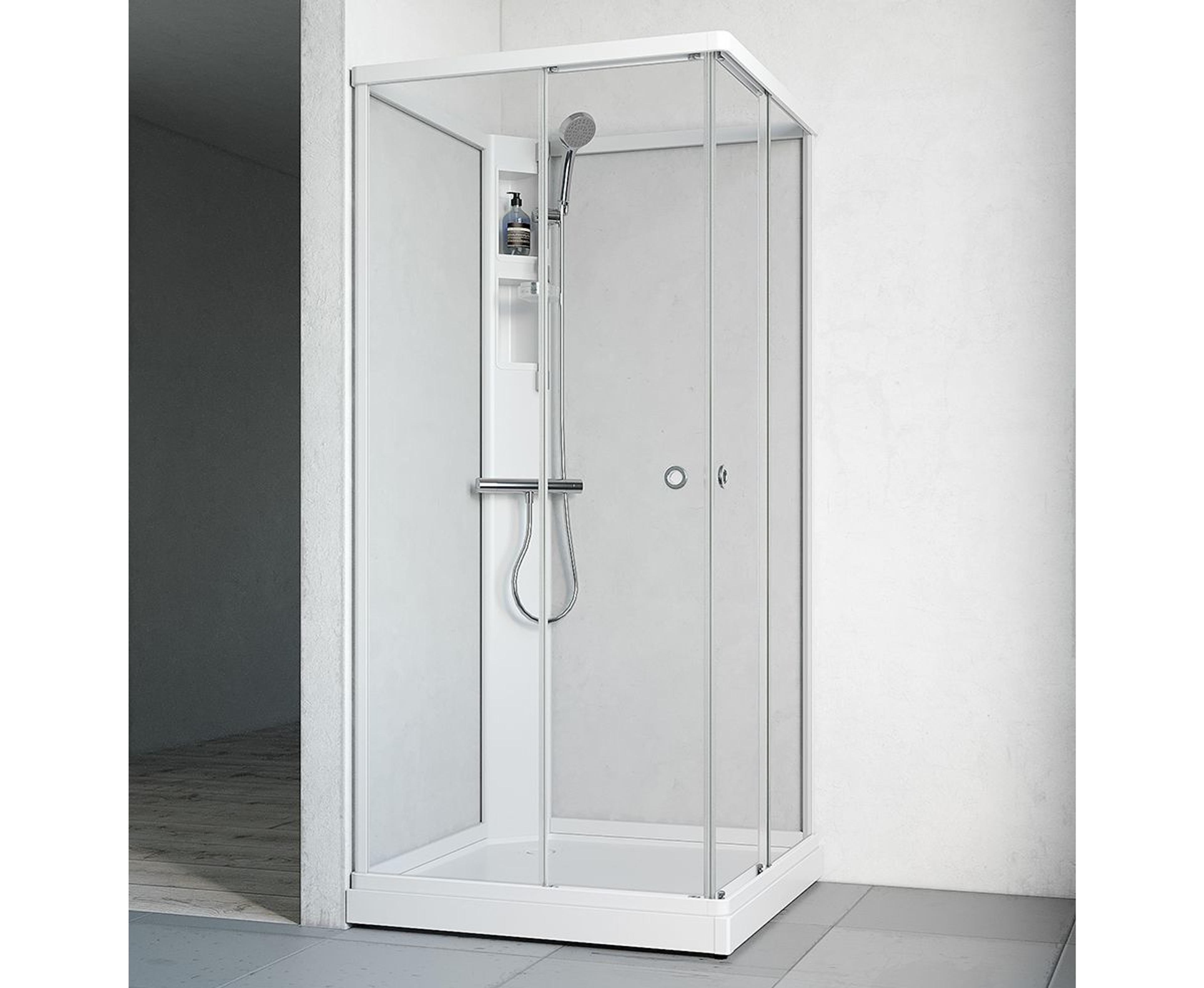 Flow Rett Kabinett har et moderne uttrykk med slanke profiler i hvit, klarglass, støpemarmorkar og skjult avløp. Finnes i flere farger og størrelser. Størrelsen på veggene kan kombineres. Enkel å montere med minimalt med skruer da mange av delene har klemfunksjon. Servicehylle for utenpåliggende blandebatteri. Dusjsett Nifty inngår. Pris uten dusjkran.