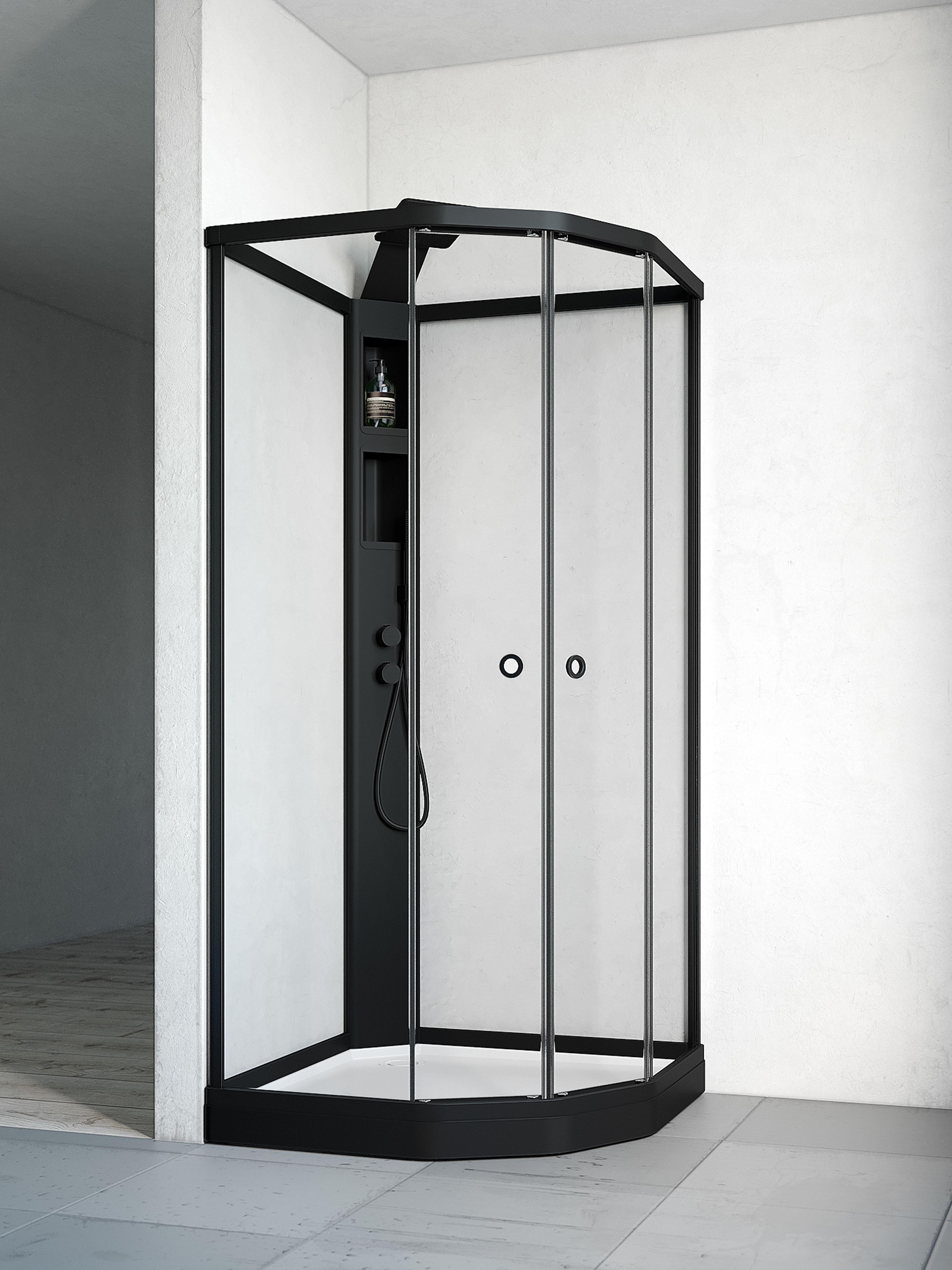 Dusjkabinett med sorte profiler og klart glass. Med integrert blandebatteri, dusjsett og takdusj. Mål: 91x91x215 cm.