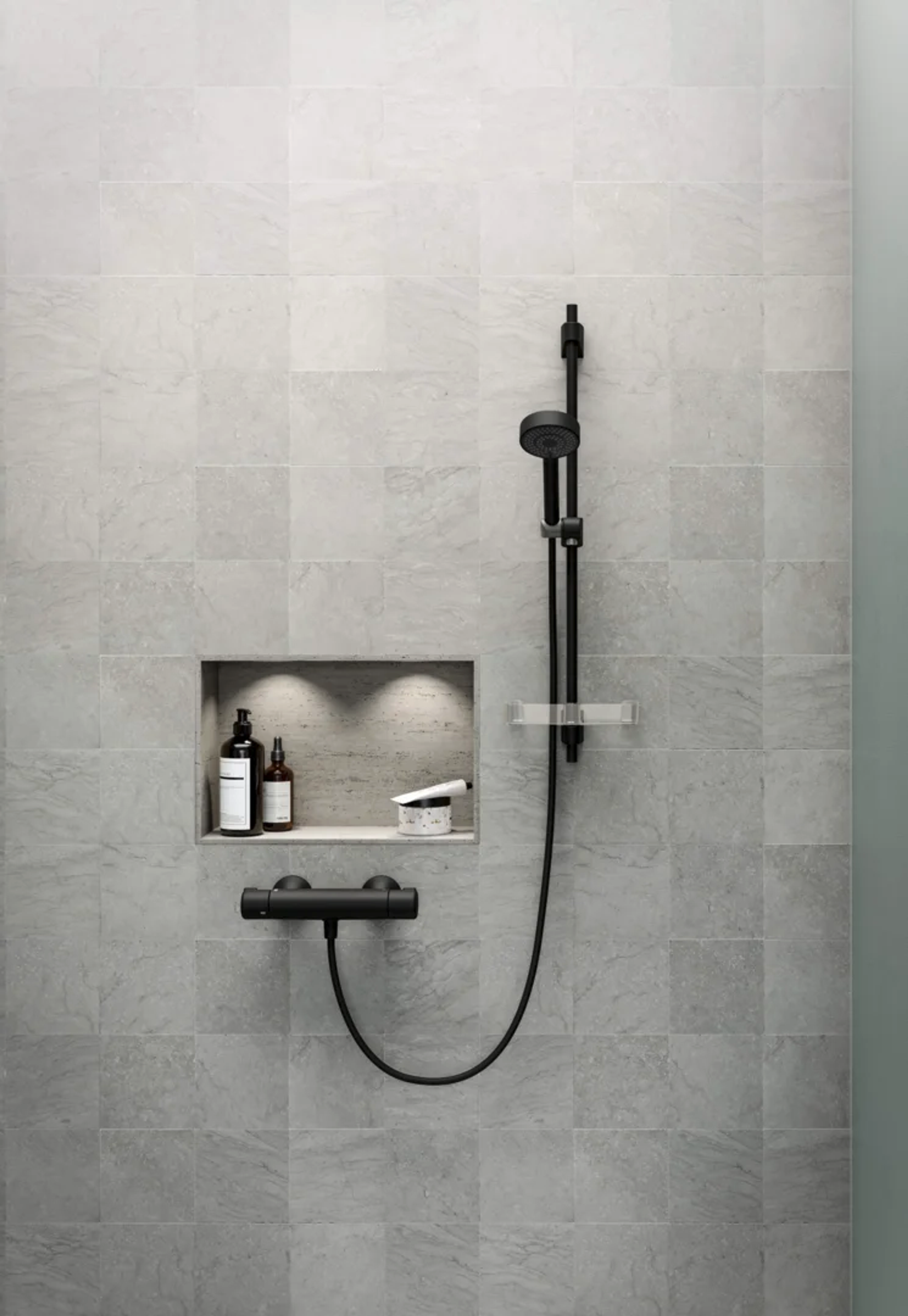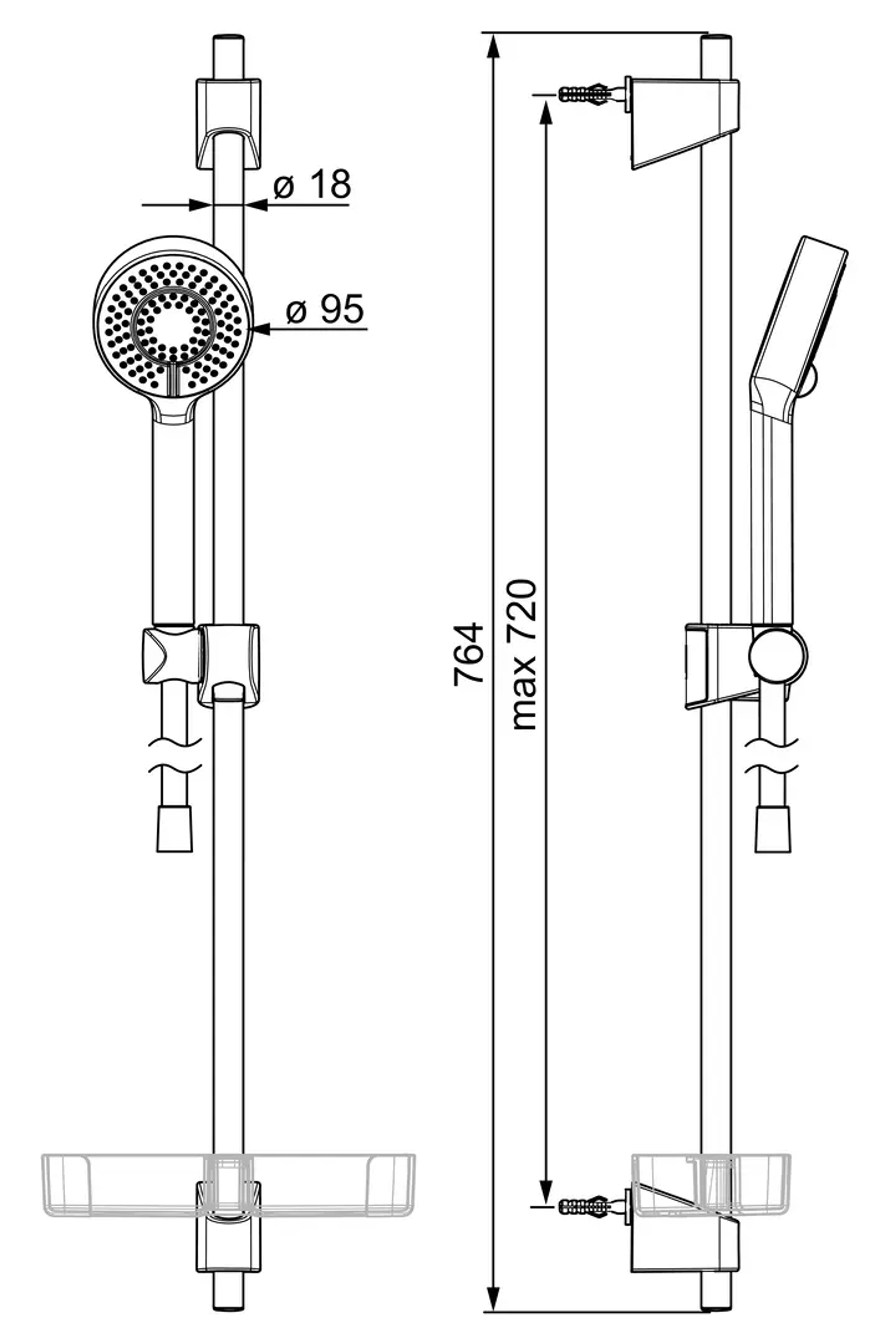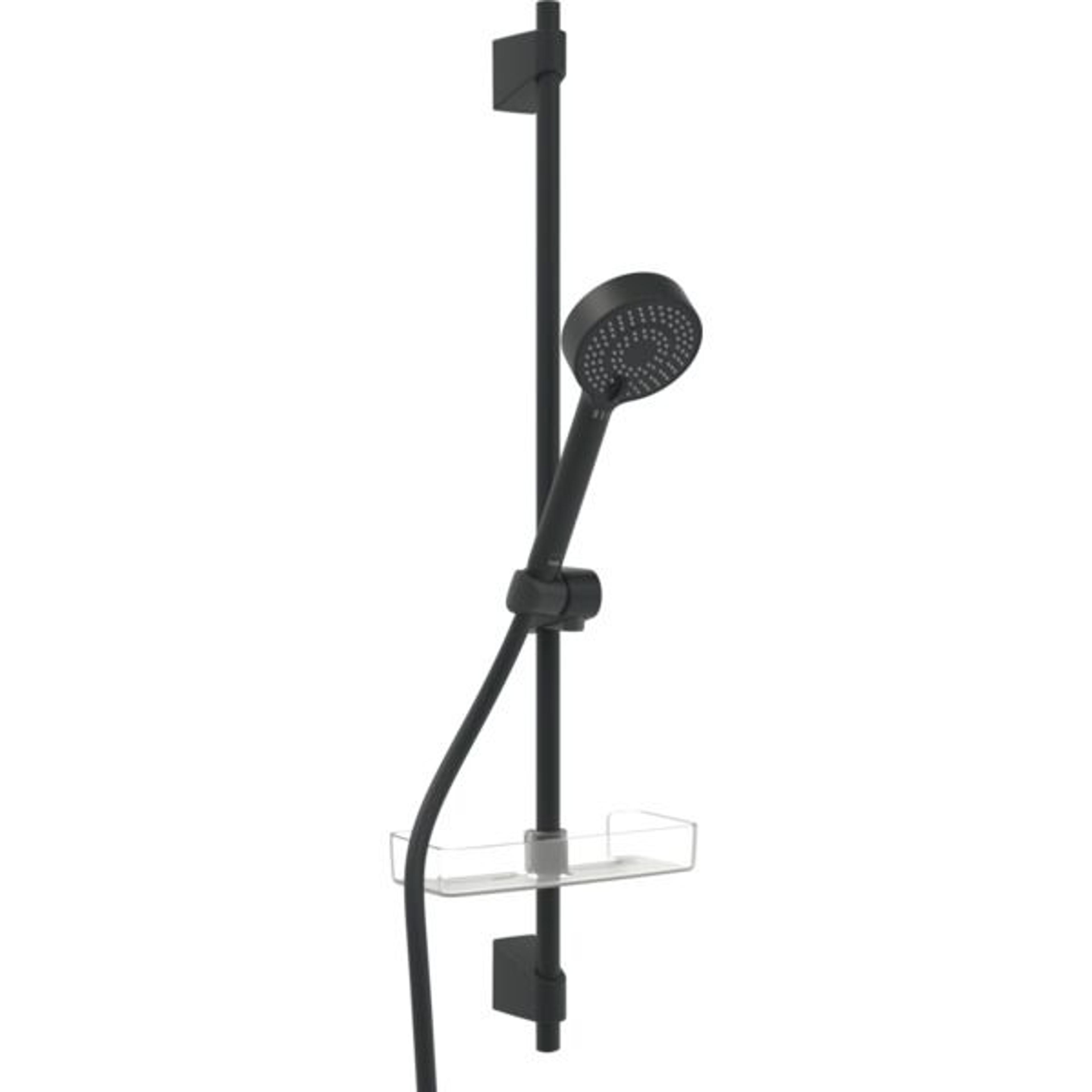 Oras Apollo dusjsett i matt sort, inkludert hånddusj (ø95 mm) med tre innstillinger samt EcoFlow kontroll, justerbar dusjstang til maks 720 mm, 1750 mm dusjslange og såpekopp.