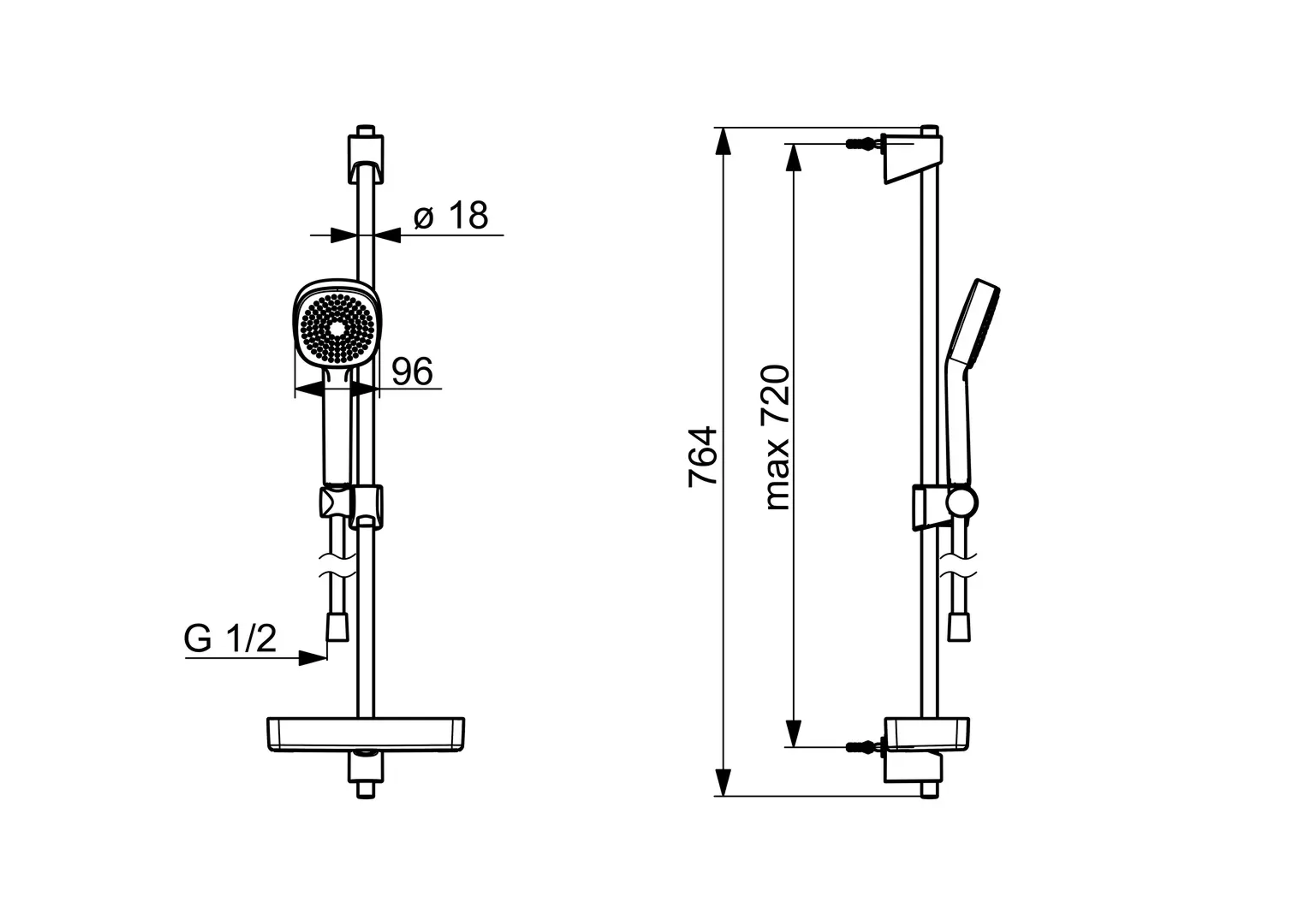 Hånddusj (Ø95) med 1 sprayfunksjon, justerbar maks. Justerbar dusjstang (maks 720 mm), 1750 mm dusjslange og såpebrett. Vannforbruk begrenset til 9 l / min.