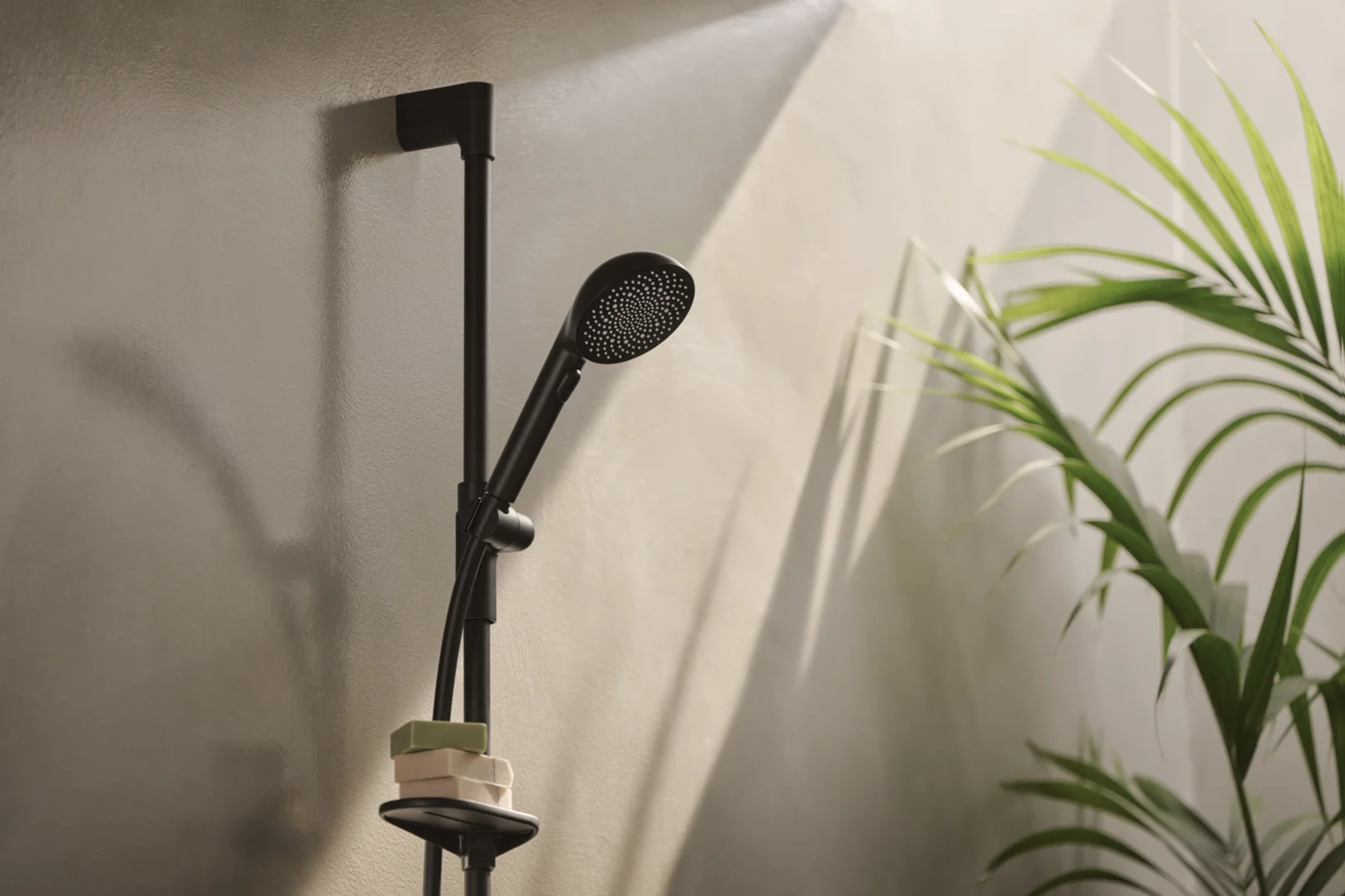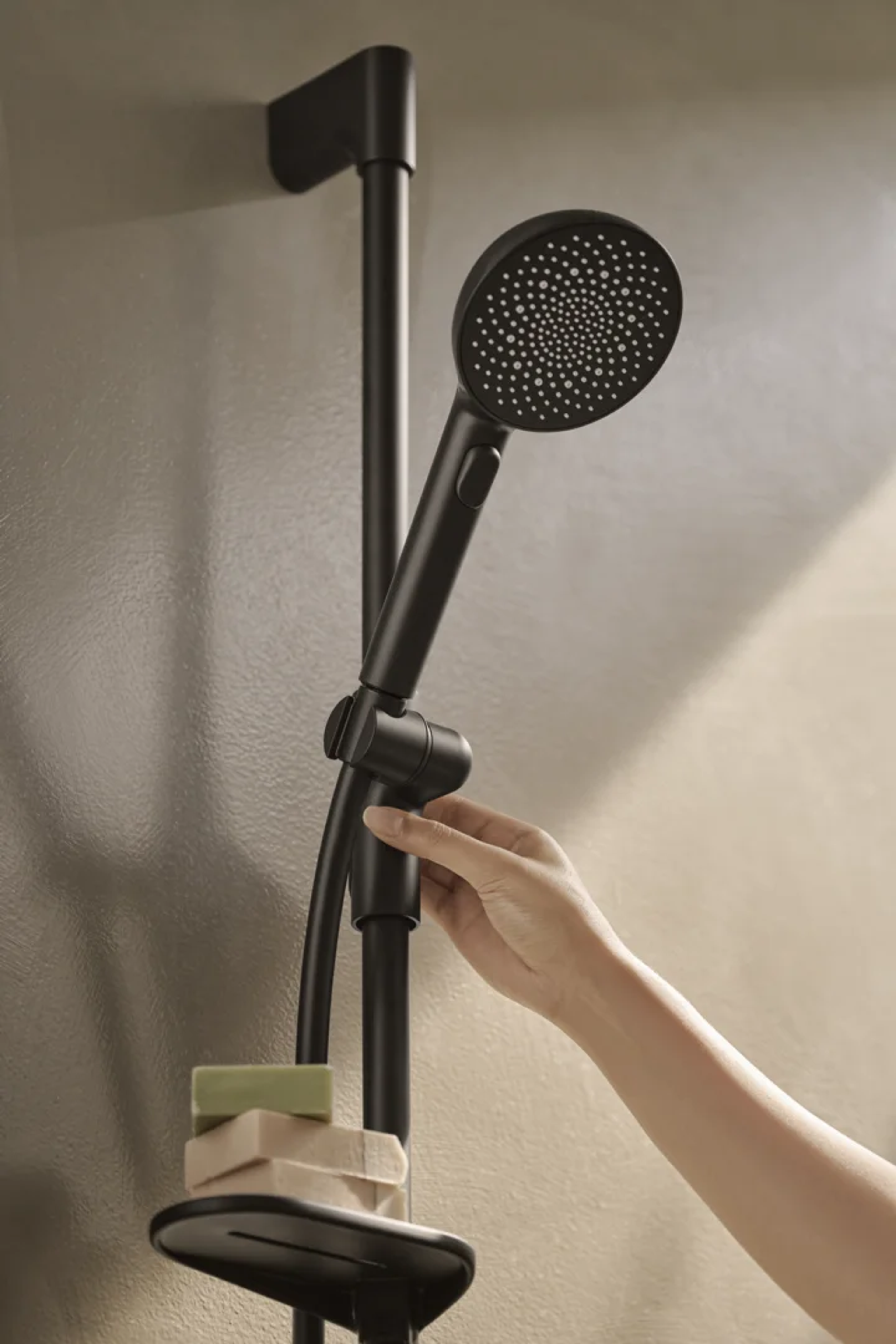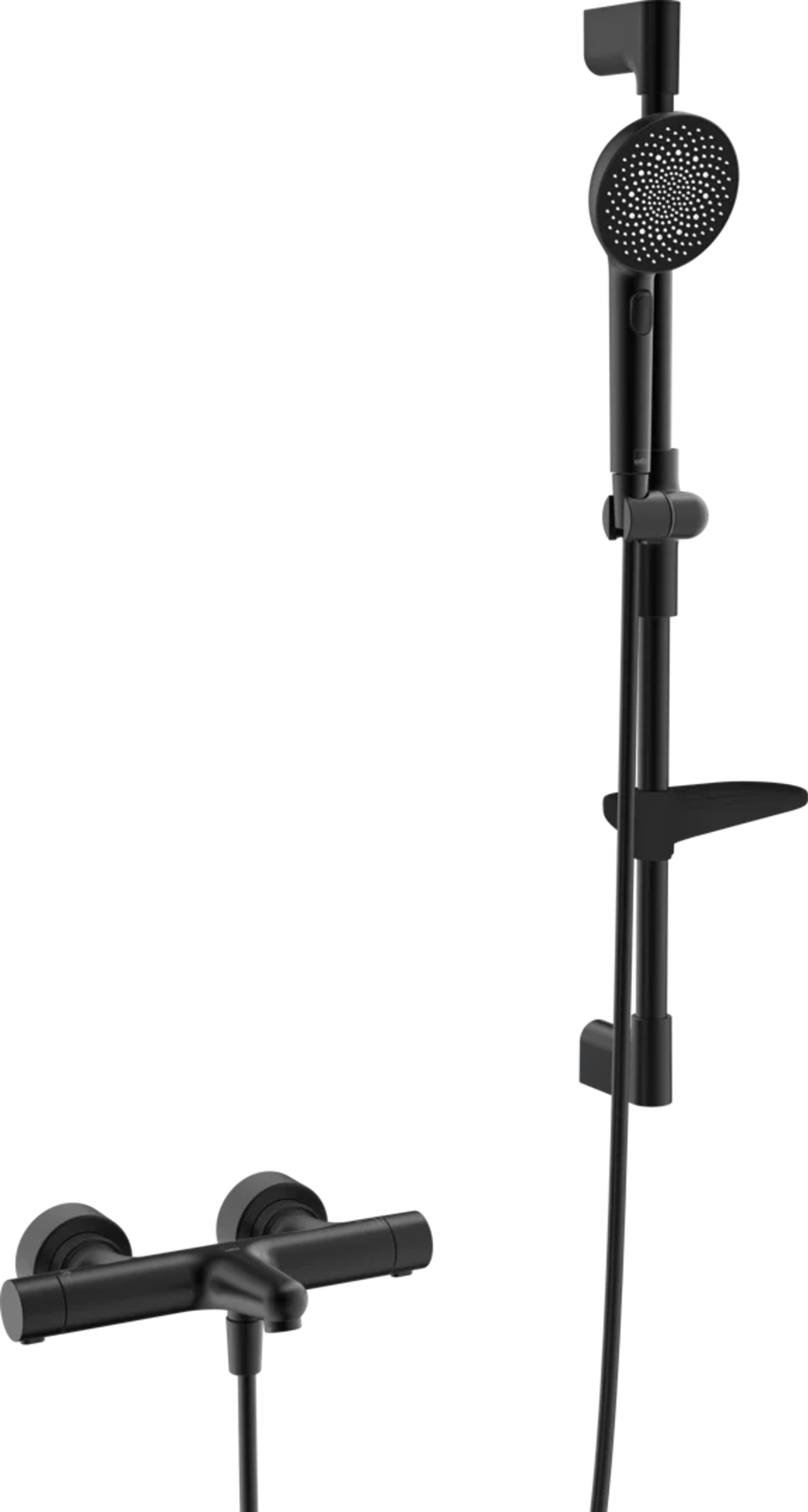 Enkelhet og eleganse i harmoni. En elegant sylindrisk termostat med badekartut. Aurelia henter designinspirasjonen fra elementer i naturen. Badekar- og dusjkran med dusjsett i svart matt 110mm - tre stråletyper hånddusj trykknapp for enkelt valg av stråletype Dusjholder som er lett å justere