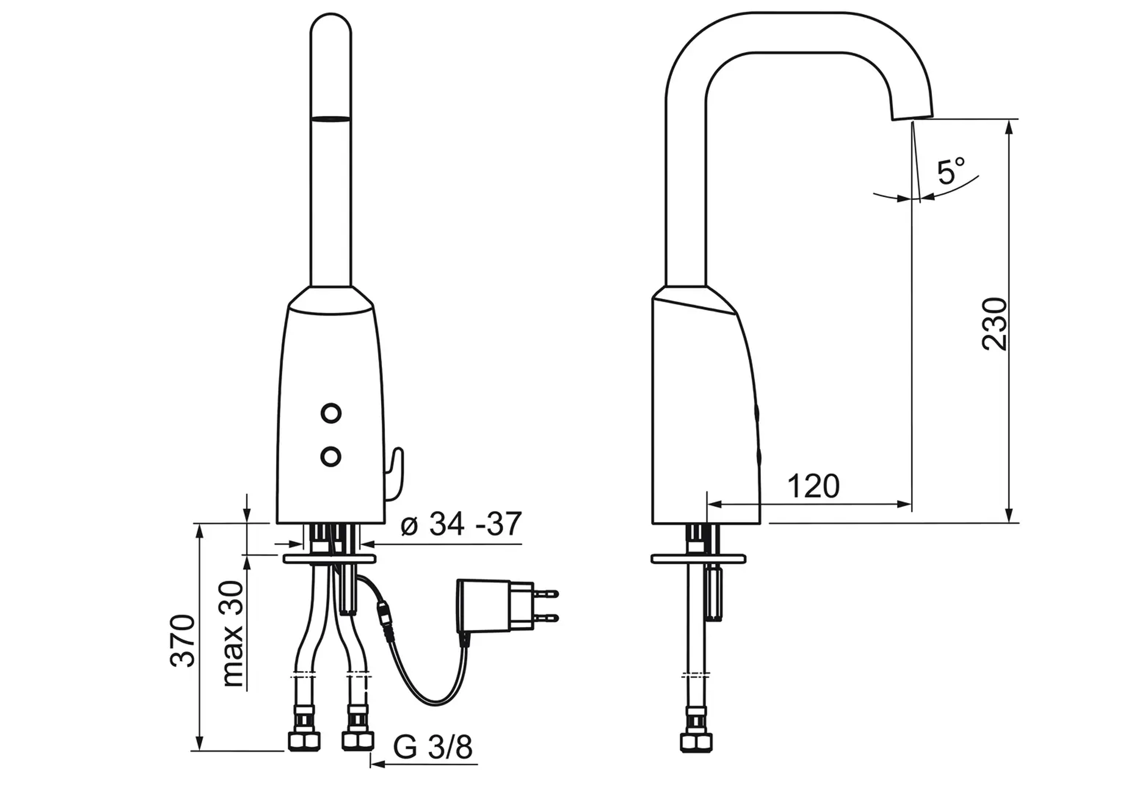 Berøringsfri servantkran med temperaturratt. Lengden på tuten er 120 mm. Kranen er utstyrt med smussfilter og tilbakeslagsventiler. Det kreves ingen justeringer ved installasjon takket være Oras Autofokus sensor. Bluetooth-tilkobling gjør det enkelt å overvåke og justere kranen. Vannbegrenser (6 l/min) gir lavt vannforbruk. Elektrisk tilkobling via adapter 230/9 V (stikkontakt). Alternativt kan man koble inntil 5 kraner på omformer 199275. F = fleksible slanger
