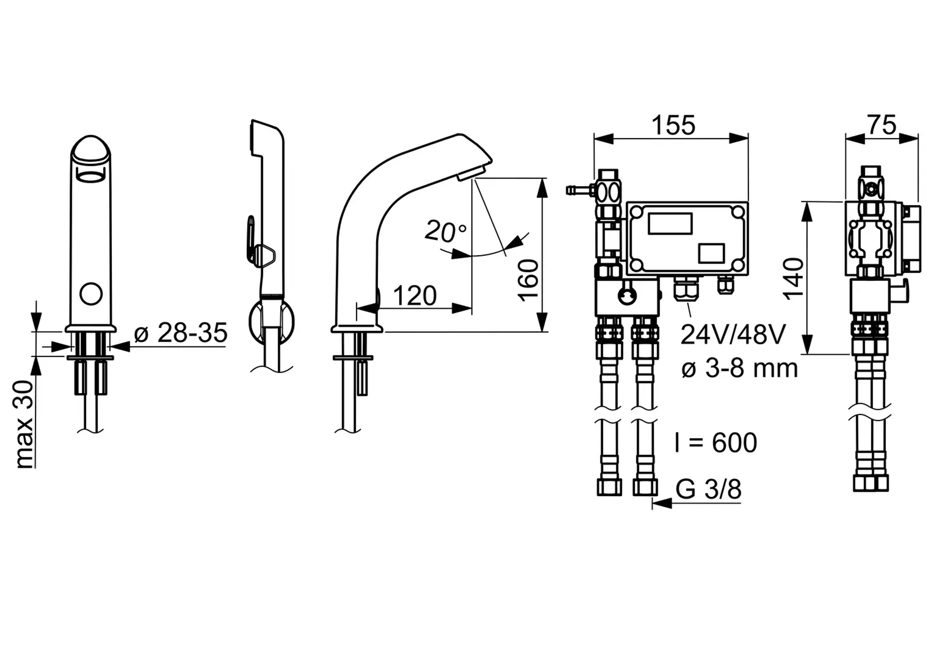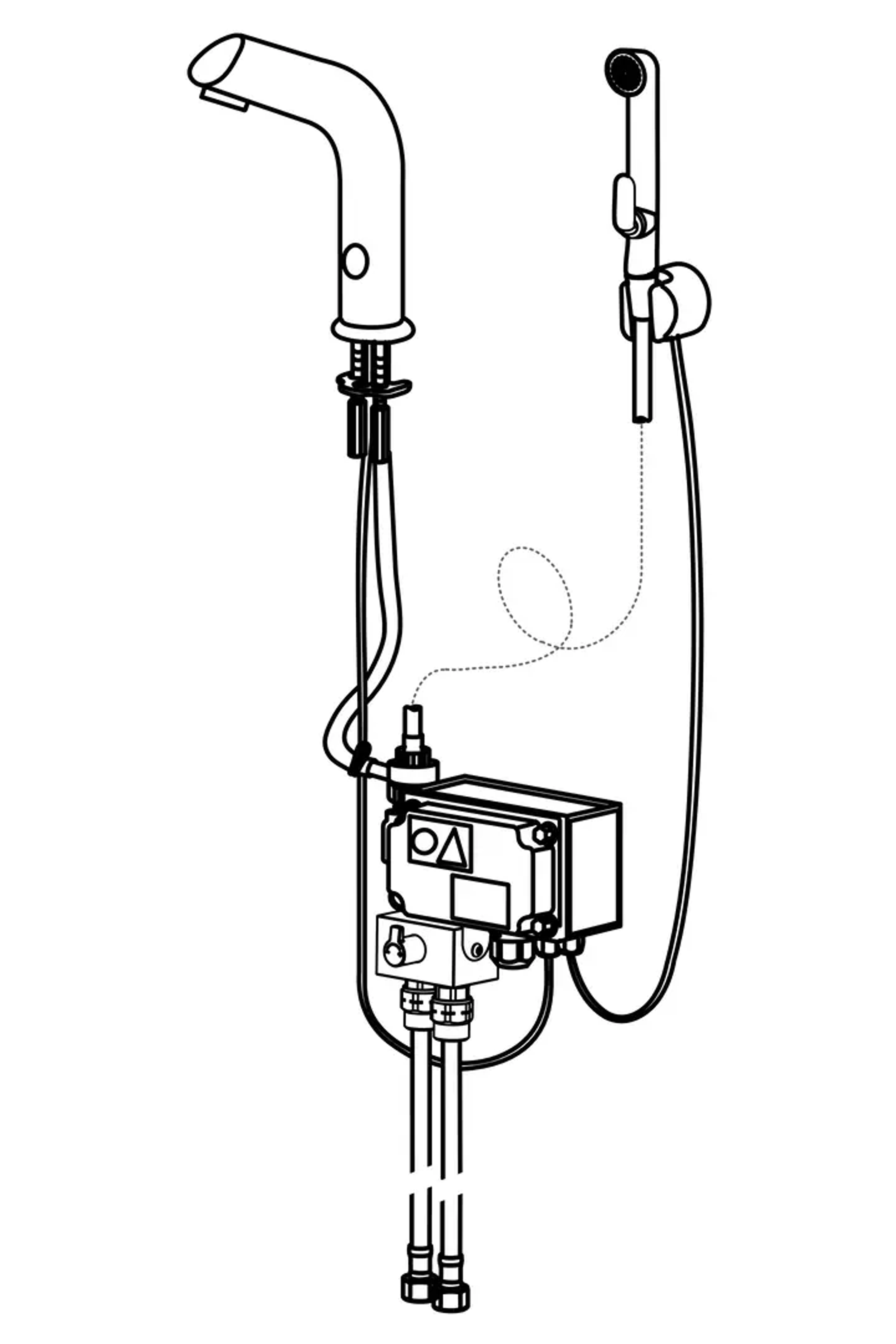 Berøringsfri servantkran med Bidetta hånddusj. Denne modellen er uten Bluetooth tilkobling. Kraftig modell i IP klasse 67. Elektrisk tilkobling 24/48 V. Tilbehør: Omformer Oras nr 290004 24V Omformer med stikkontakt Oras nr 290005 24V 3/8'' tilkobling, tilbakeslagsventil og smussfilter. Bidetta, løft hånddusj ut av holder og vannet vil renne ut av kranen, trykk inn knappen på hånddusj og vannet renner ut av hånddusjen. Vannet renner inntil man setter hånddusj tilbake i holderen