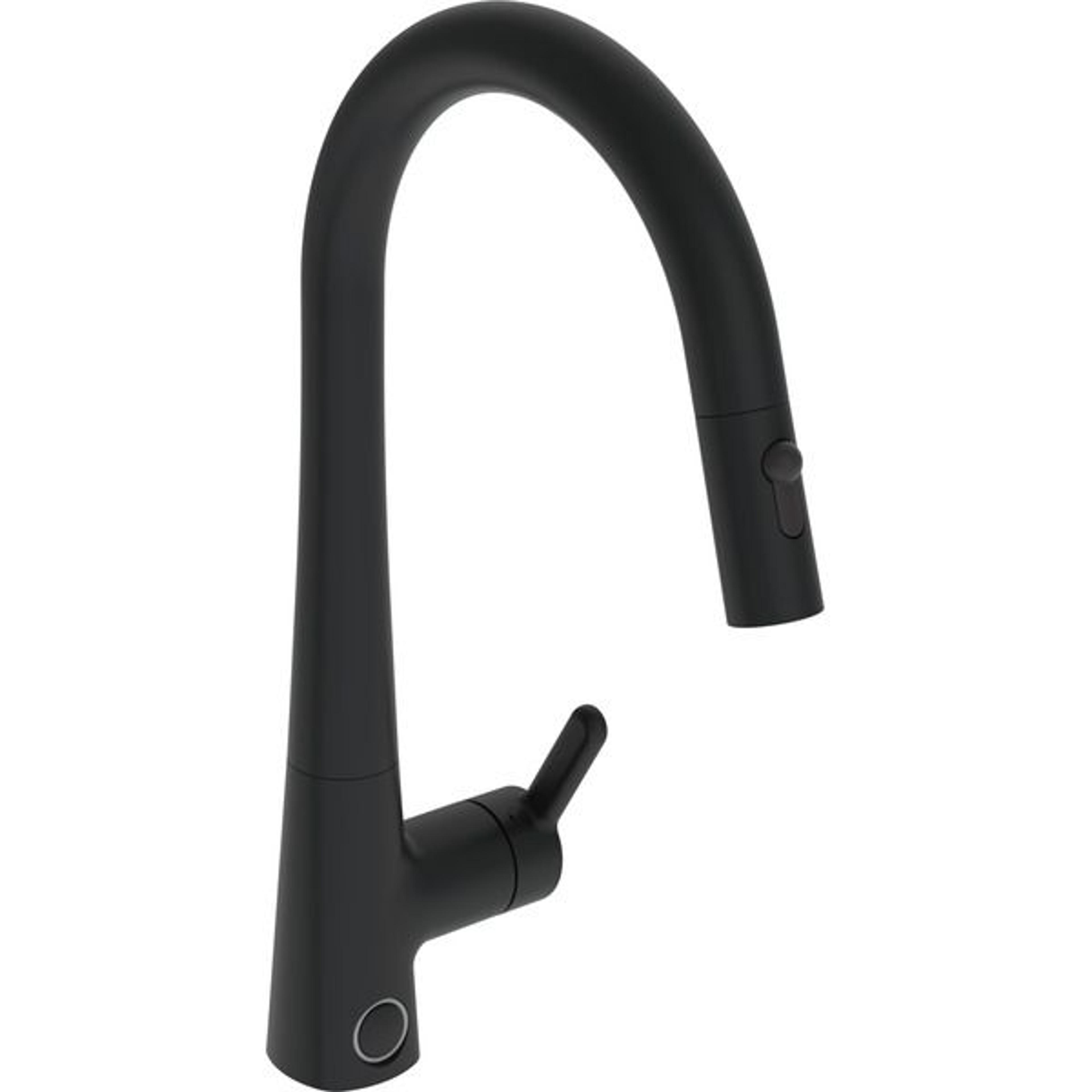 Stilren kjøkkenkran i svart matt for kjøkkenet i dag og for fremtiden. Uttrekkbar tut gjør renhold av oppvaskkum til en enkel sak. Ved bruk har du mulighet til å variere mellom to stråletyper. Elektronisk avstengning til oppvaskmaskin, stenger automatisk etter 4 eller 12 timer. Mulighet for å sette en fast skoldesperre i hendelen, og en maksimal vannmengde