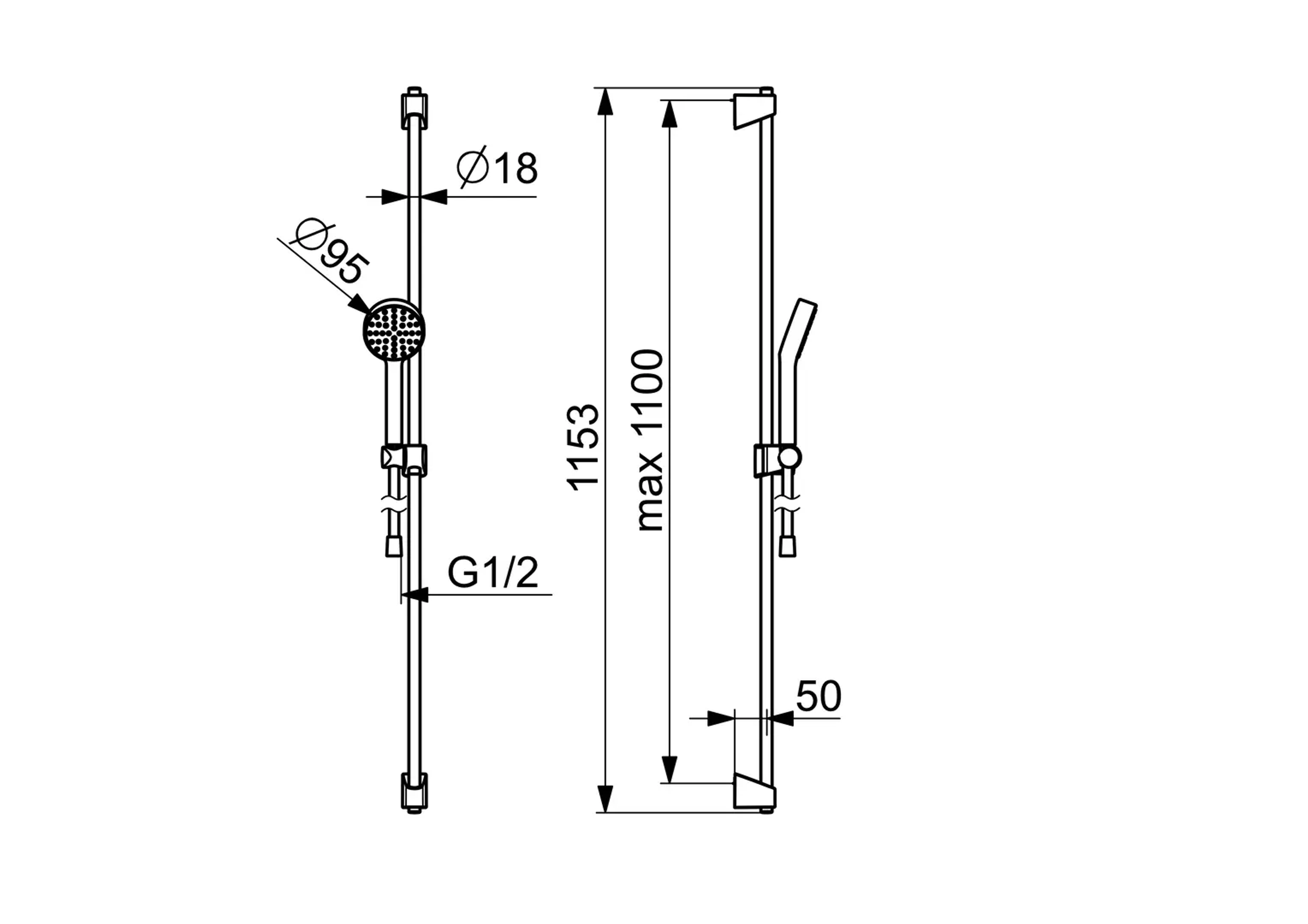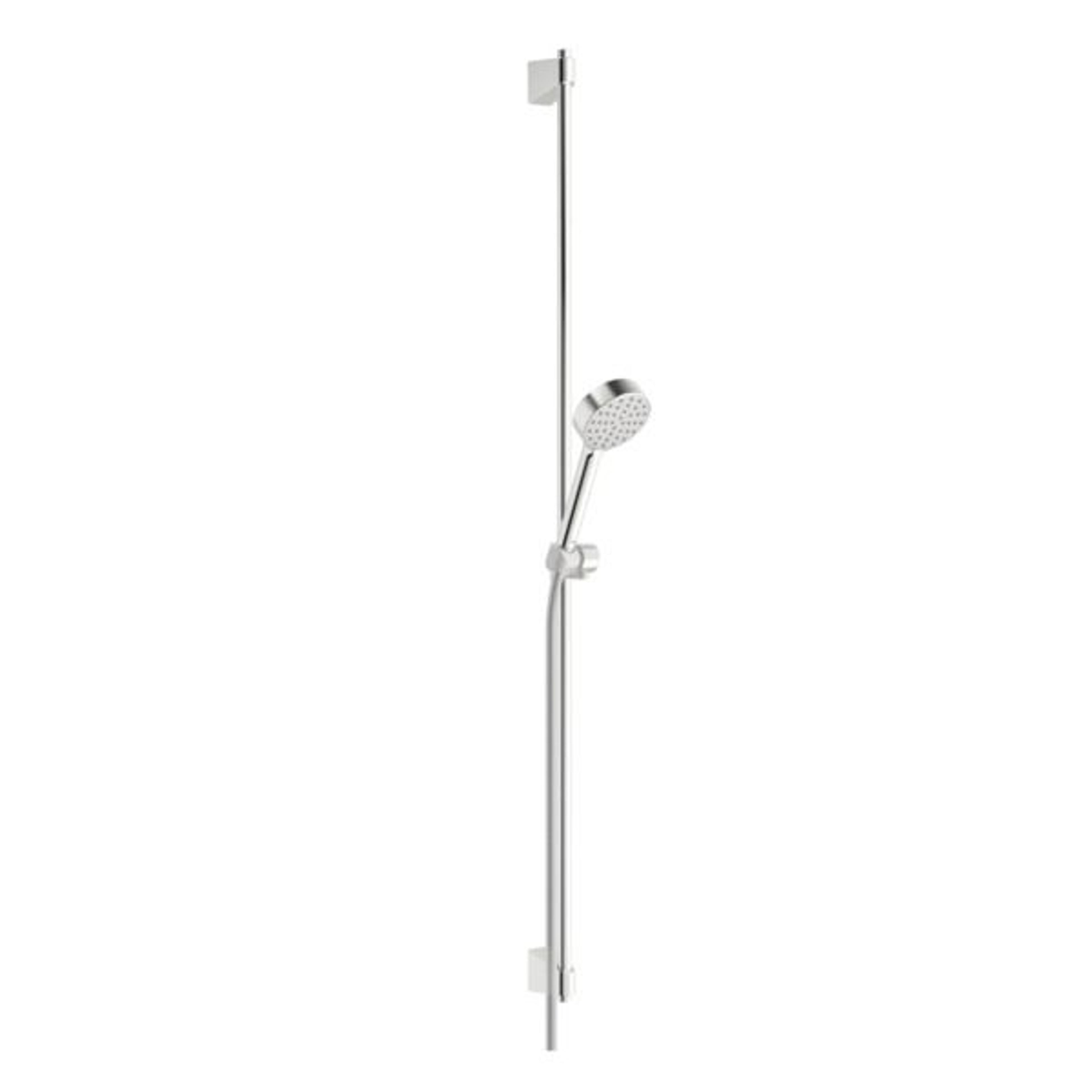 Dusjgarnityr, hånddusj Ø95mm - silplate med større dyser, som gir større vannstråler. Derfor dannes det mindre aerosoler i omgivelseslufta. Dusjstang 1153 mm lang, maks 1100 mm cc veggfeste.