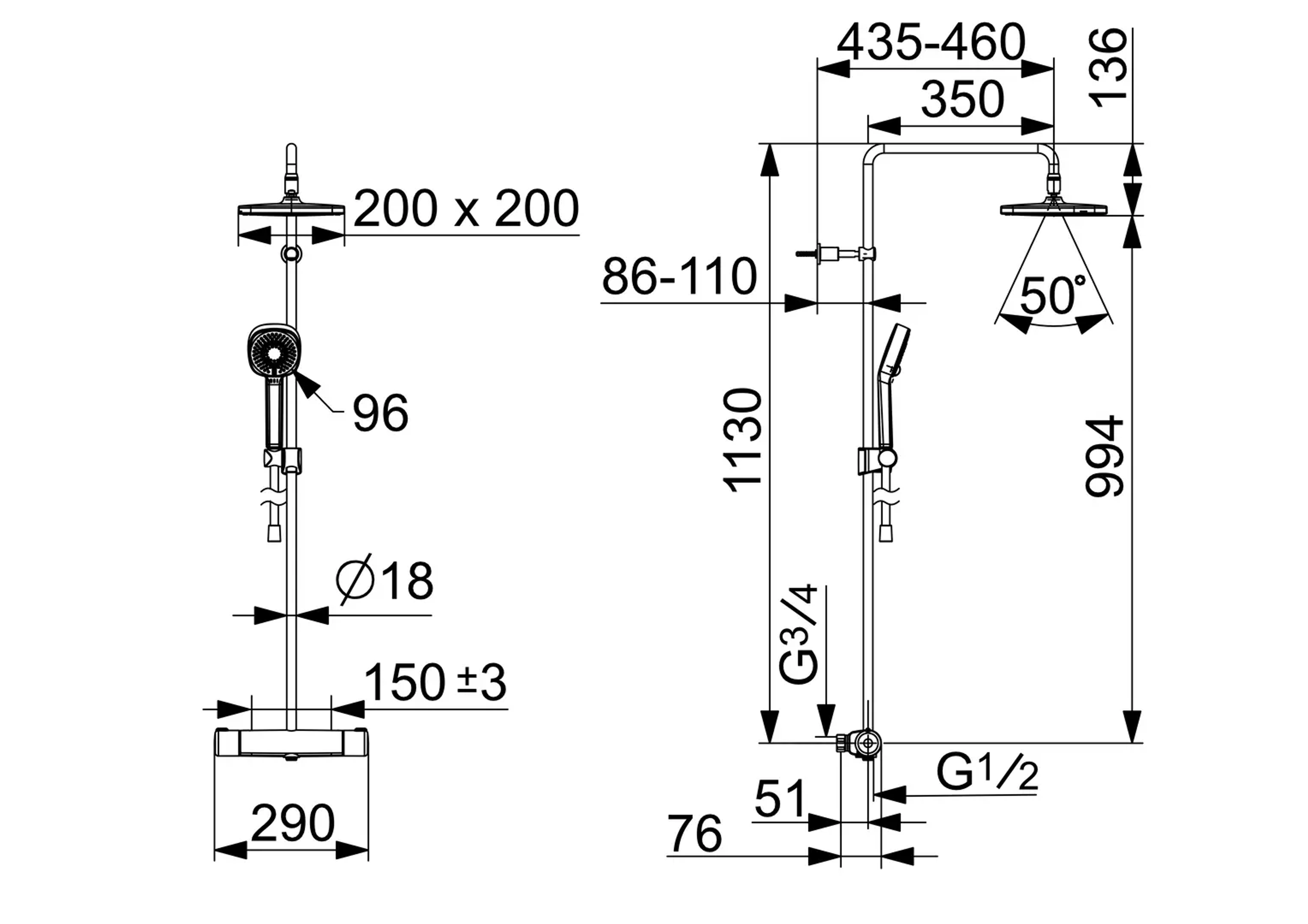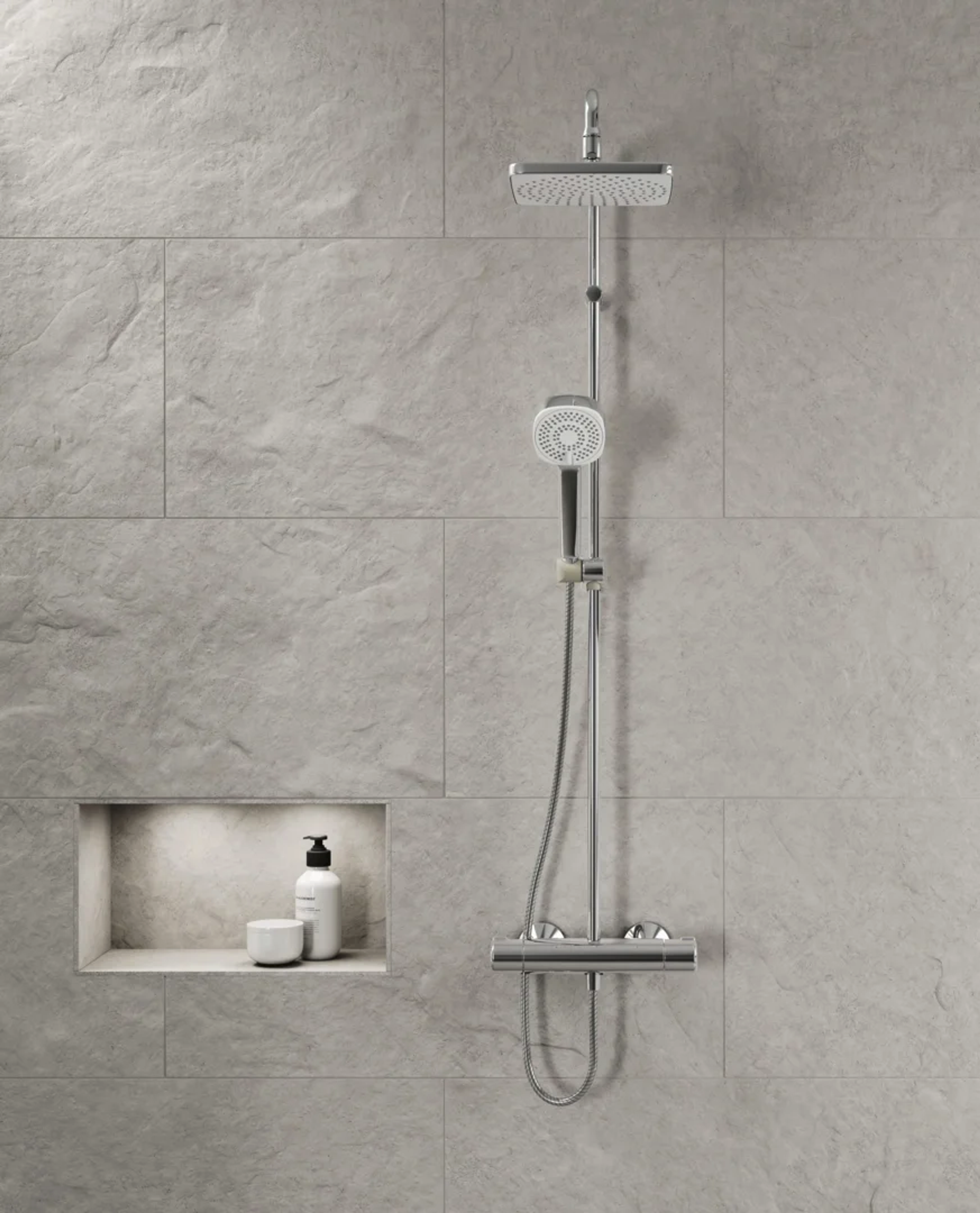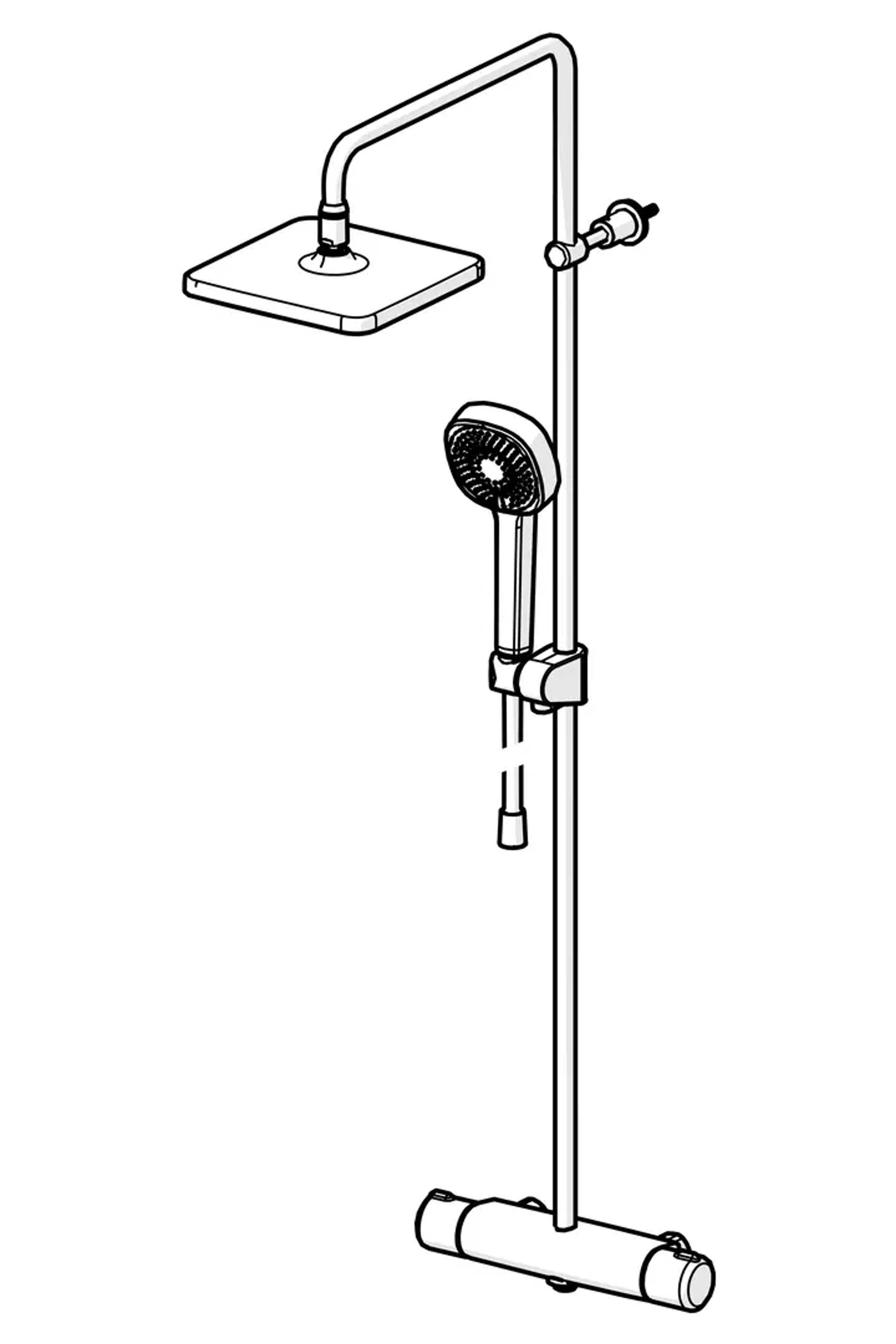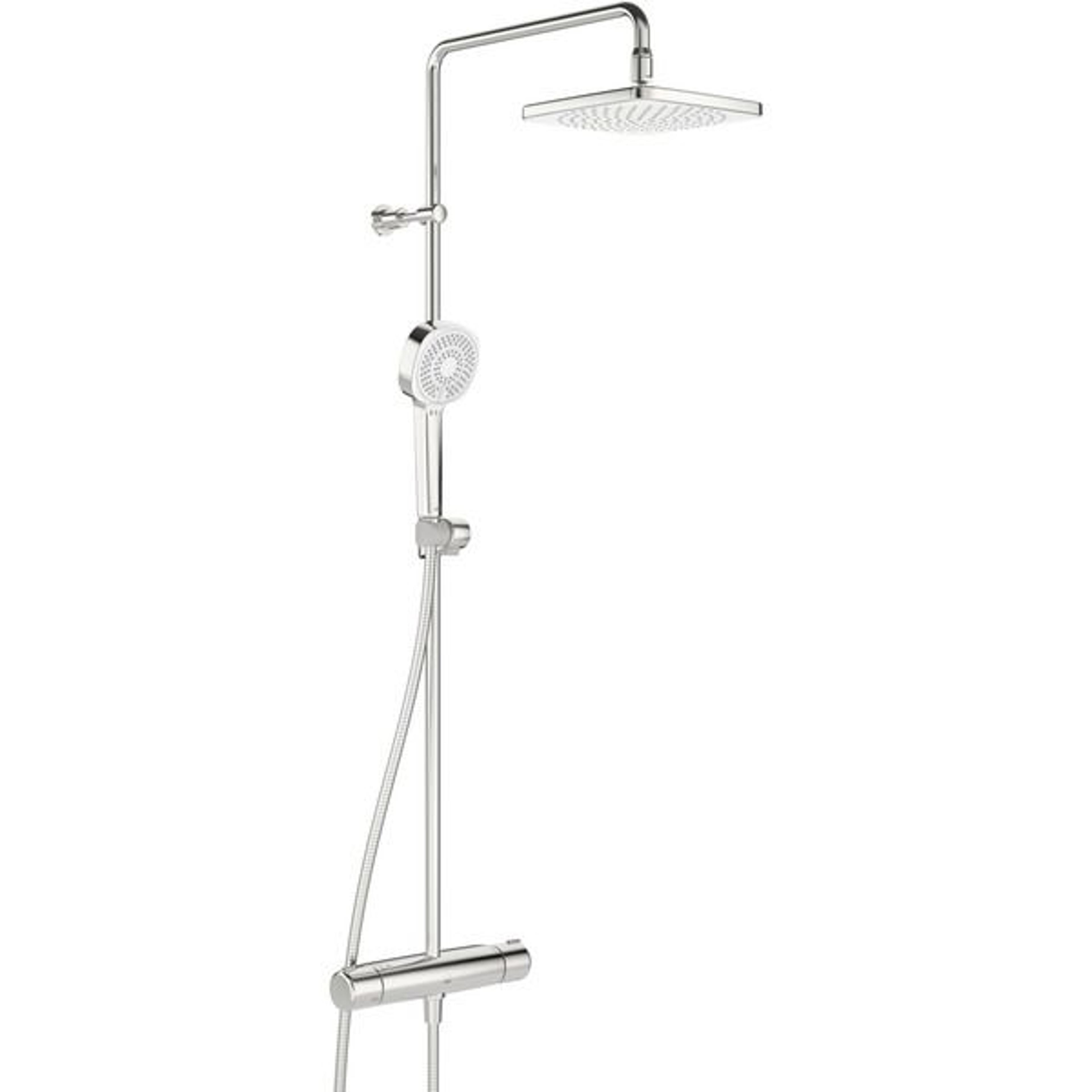 Dusjsystem med termostat. Dusjkranen er utstyrt med skåldesperre 38°C på temperaturratt samt mengderegulering med EcoFlow. Tak- og hånddusj er utstyrt med silikondyser, som er enkle å holde rene på grunn av anti-kalk teknologi. Kranen er utstyrt med smussfilter og tilbakeslagsventiler. Takdusj 200x200 mm og hånddusj 95 mm.