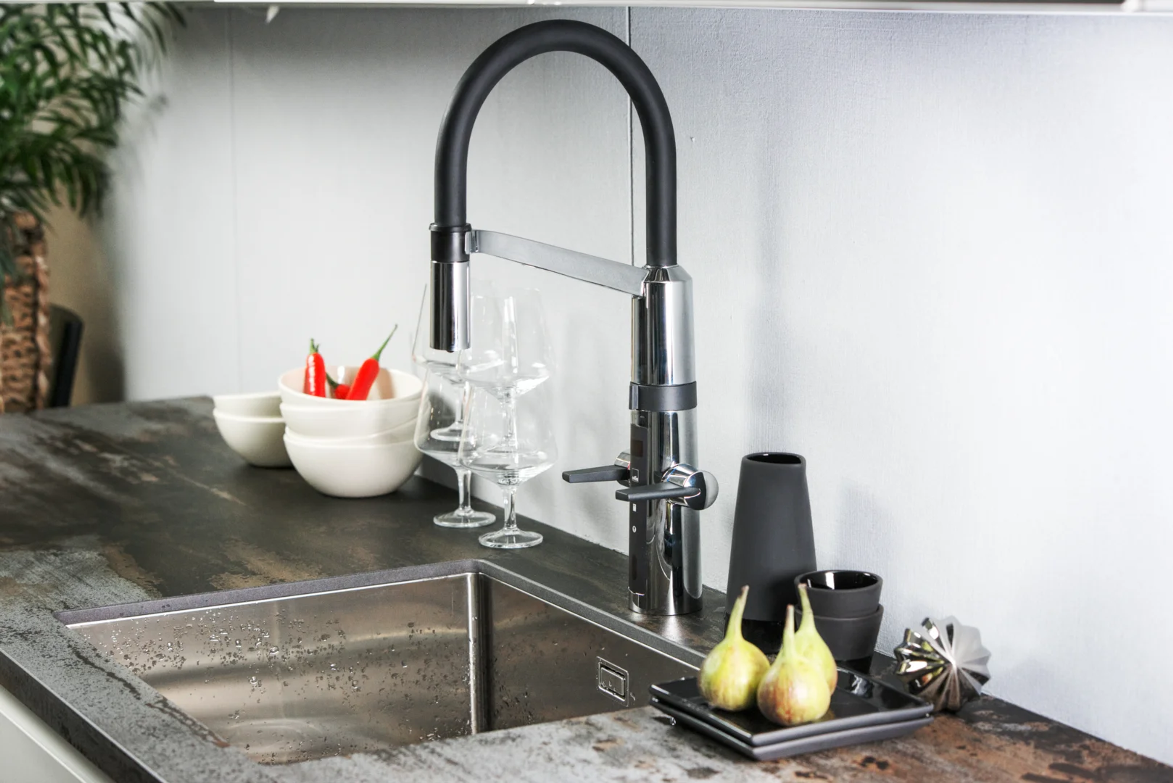Kjøkkenkran med grepsvennlige hendler for varmt- og kaldtvann, berøringsfri funksjon, temperaturdisplay med varselindikator for varmt vann, fleksibel høy svingbar tut og elektronisk avstegningskran for oppvaskmaskin. Vannmengde og temperatur reguleres med separate hendler.
