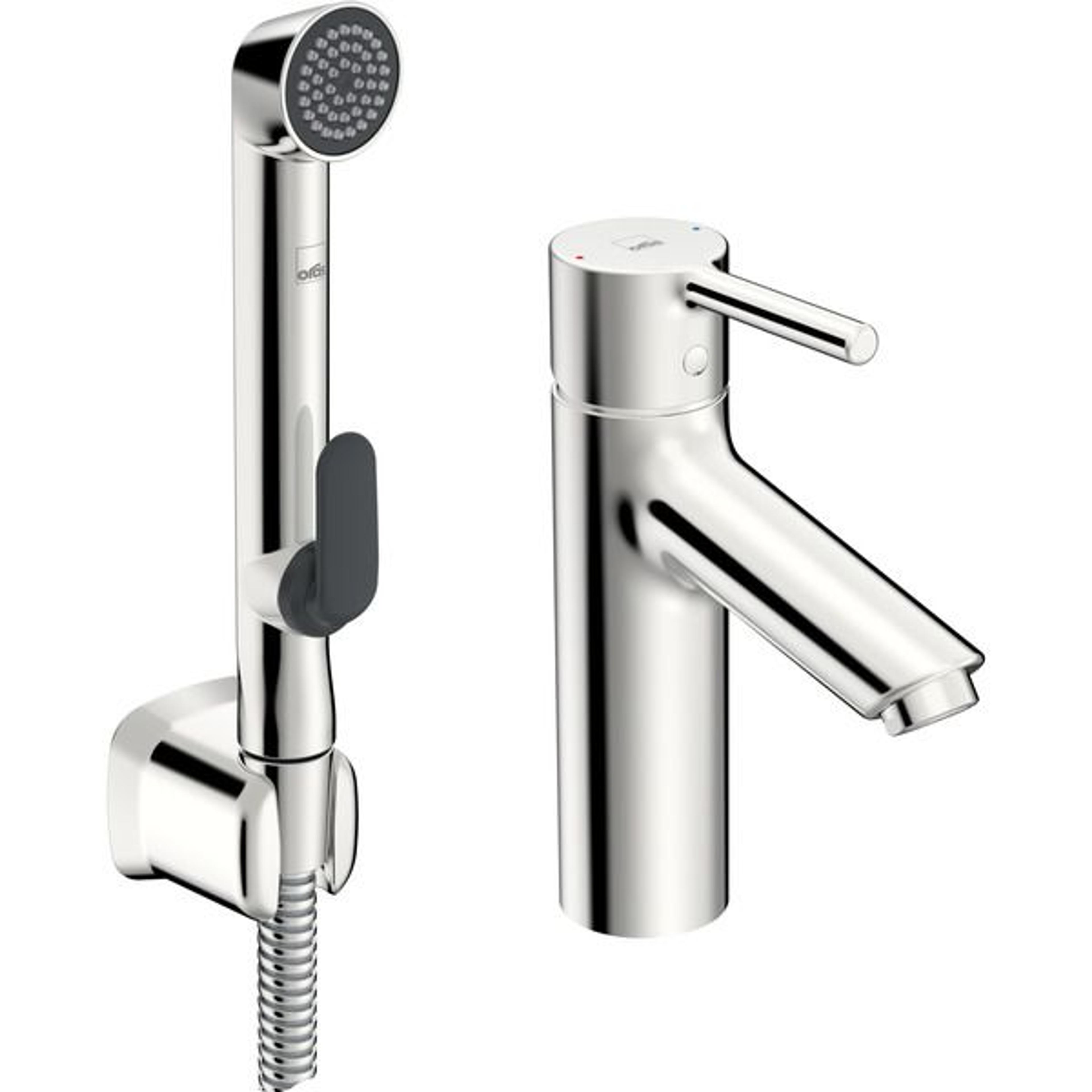 Optima XL servantkran i stilig slank design med pinnehendel og Bidetta hånddusj. En klassiker som passer inn på ethvert baderom. Servantkranen gir 6 l/m. Enkel installasjon med 3S Installation System.