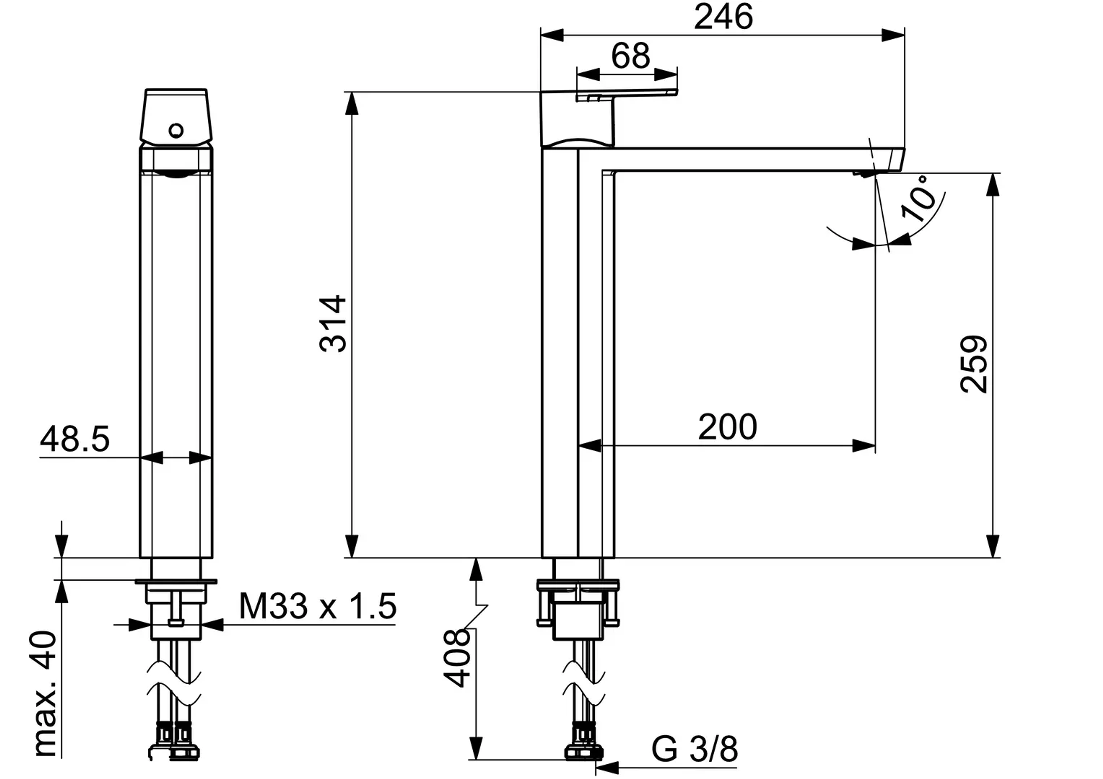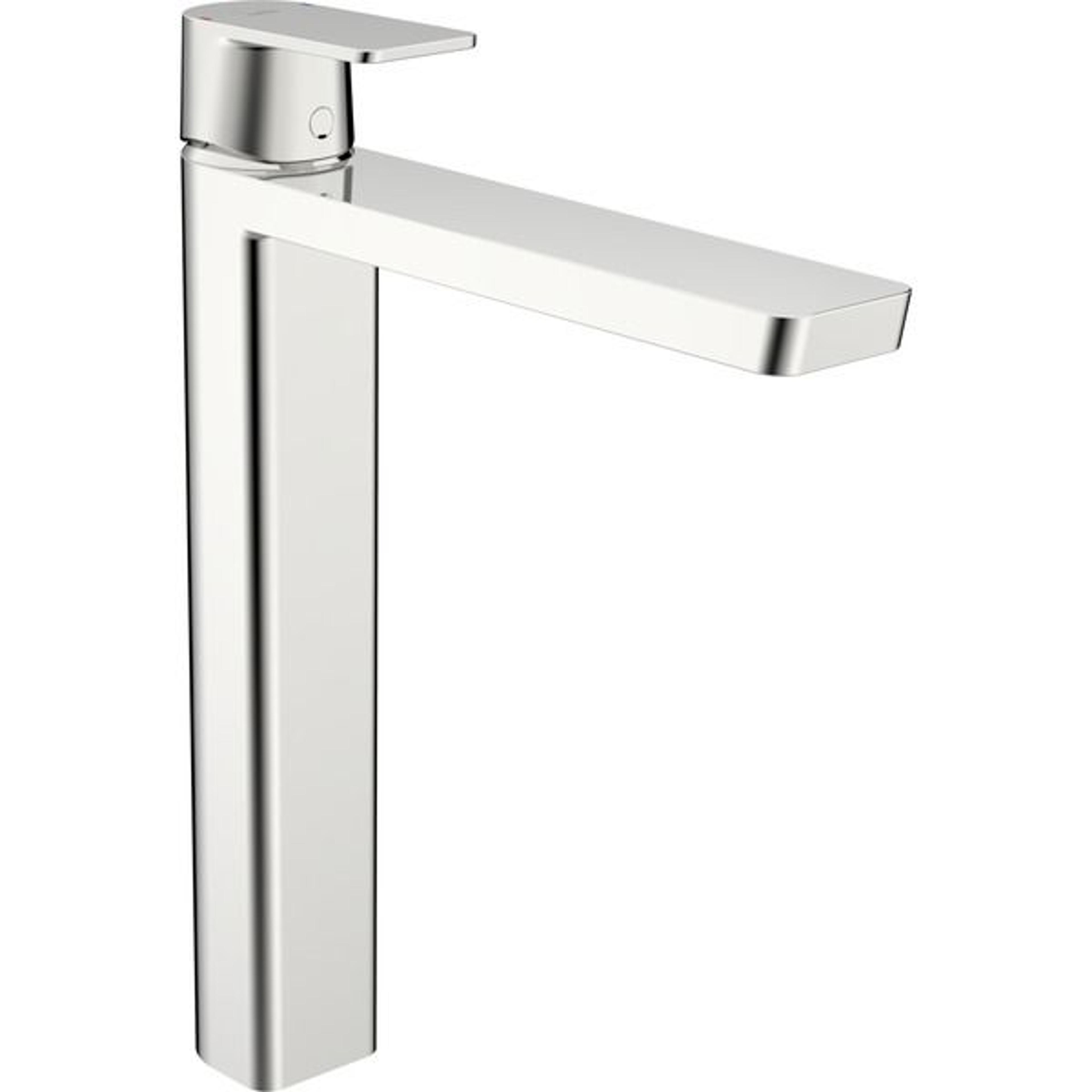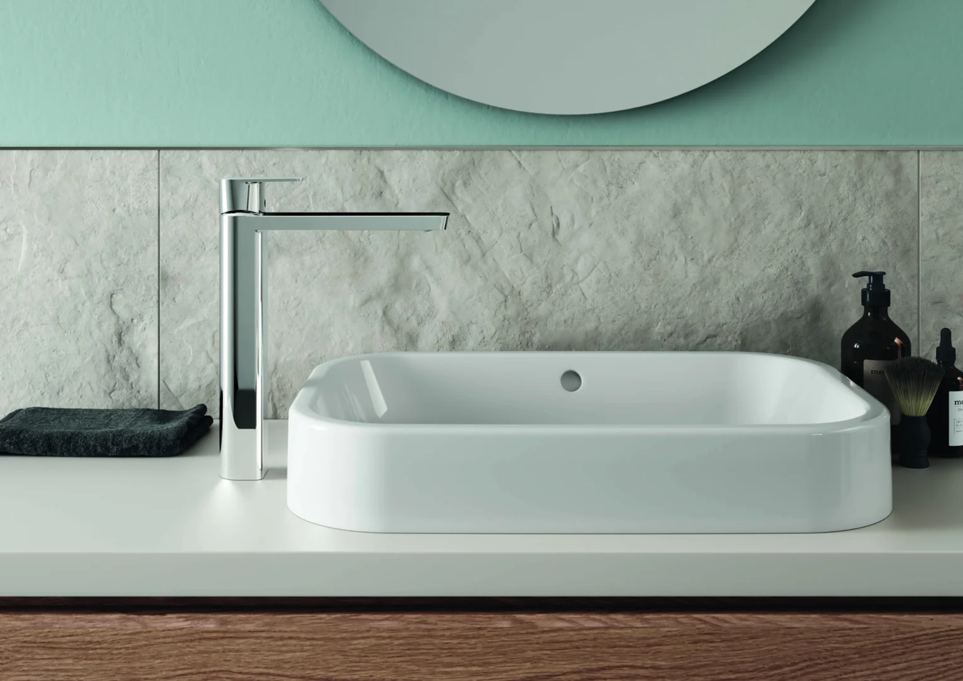 Oras Stela - med rene geometriske former, for å se moderne ut i årene som kommer. Skjult strålesamler som ikke forstyrrer det rene designet, som kan vinkles for å unngå vannsprut. Høy servantkran som er velegnet til bolleservanter. Med fleksible slanger