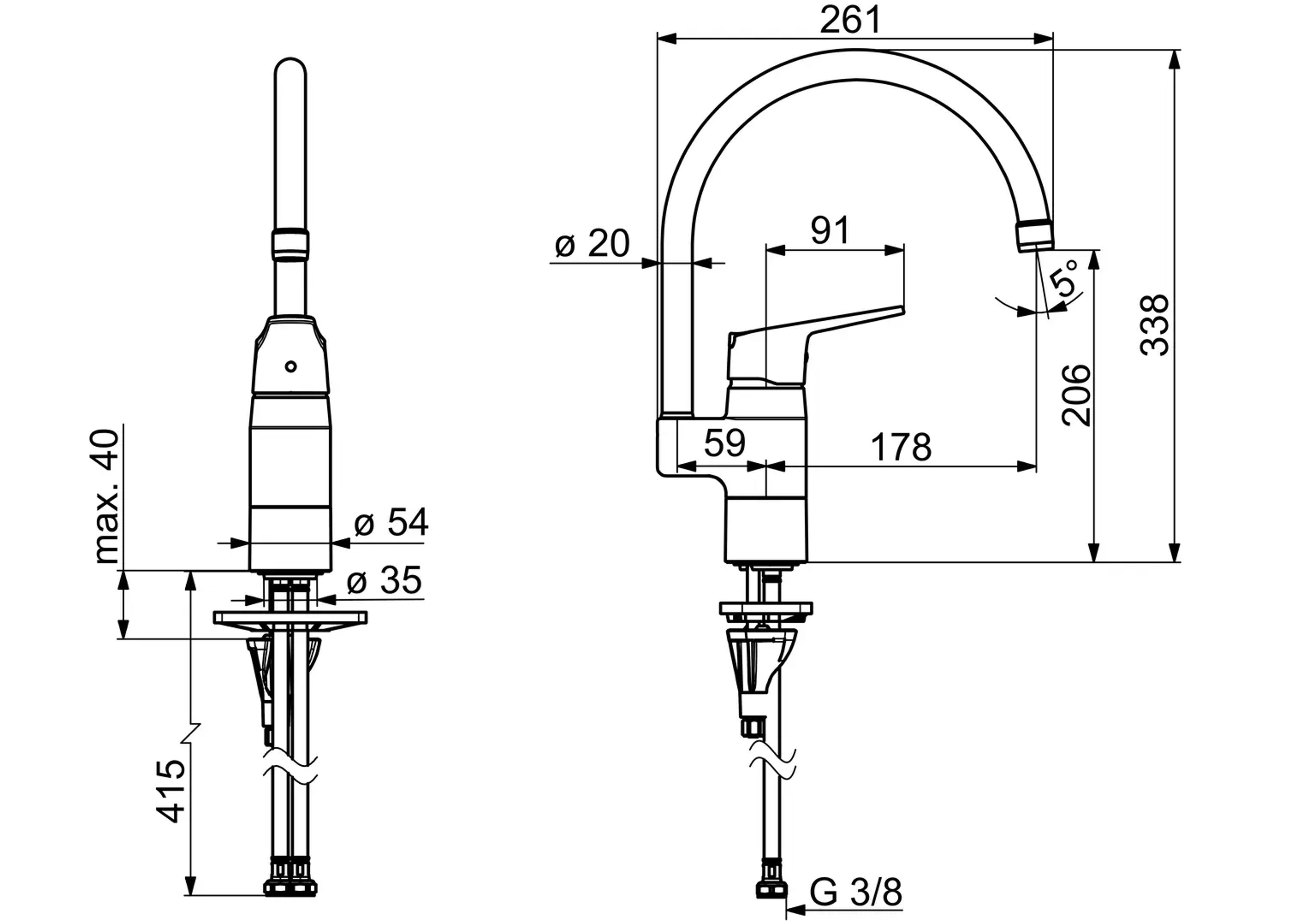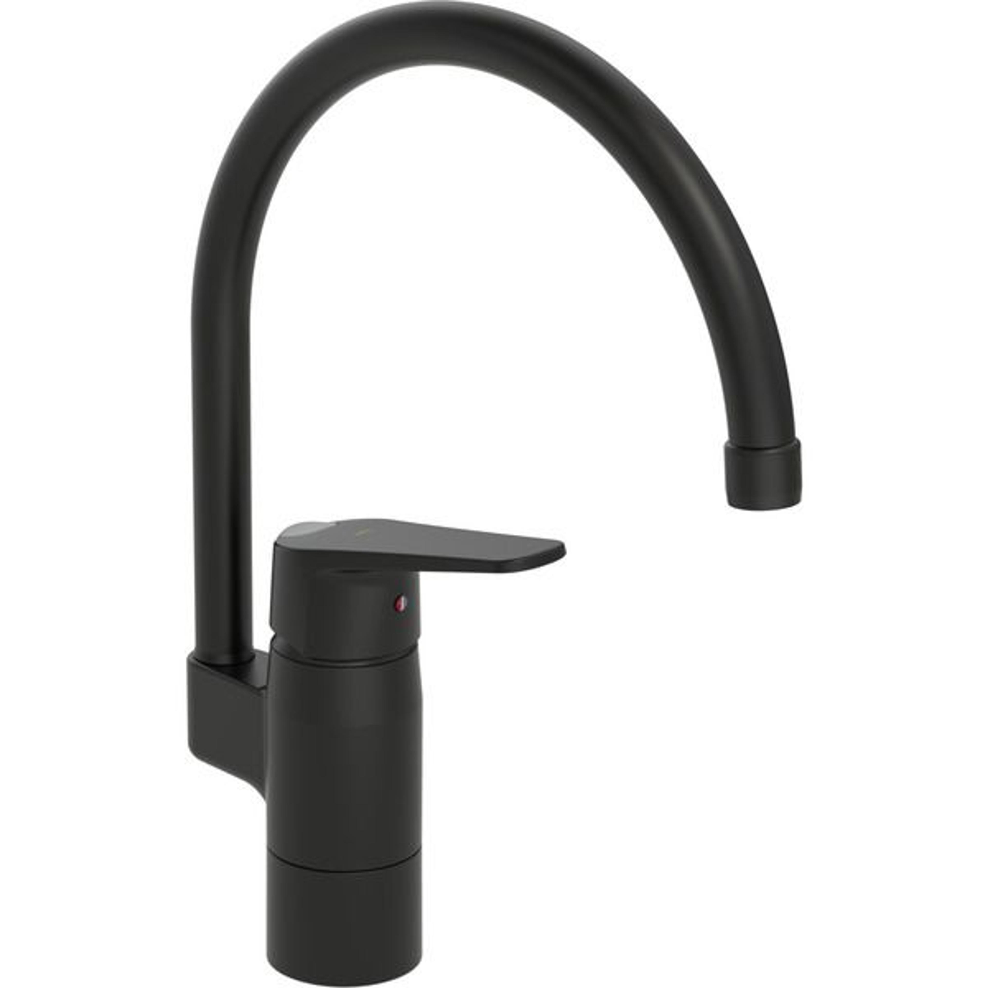 Kjøkkenkran i matt sort, med høy svingbar tut og strålesamler. Tutens svingradius er fabrikkinnstilt på 120grader (kan begrenses til 40-80 grader). Justerbar sokkel som gjør at tuten monteres bak, til høyre eller venstre på krankroppen ved installasjon. Hendelen er utstyrt med en økoknapp som kan begrense vannmengden. Funksjonen oppheves enkelt ved trykke på knappen. Sikker i bruk og vannbesparende. Oras 3S-Installation for enkel, sikker og rask montering. F = fleksible slanger.