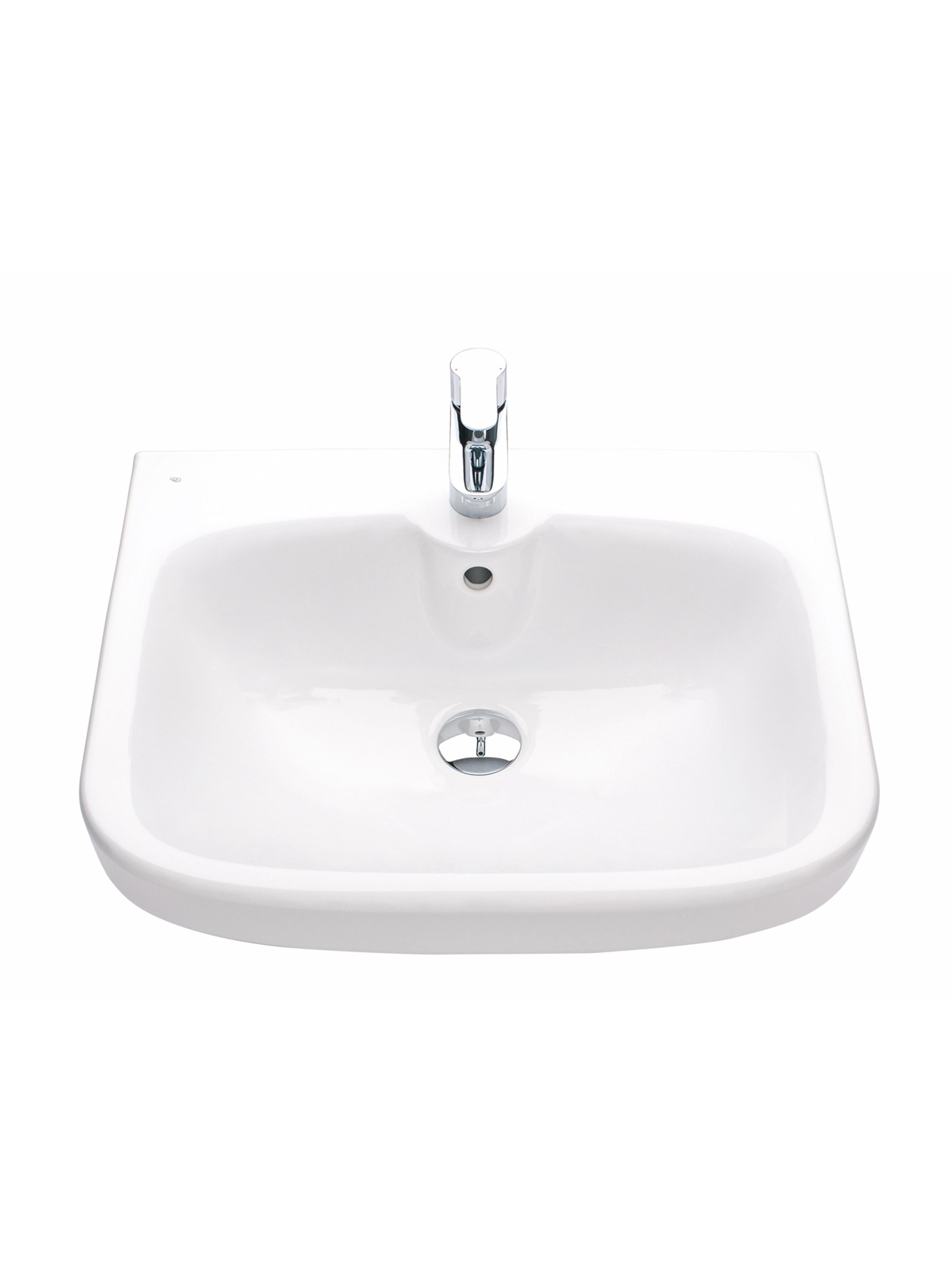 Porsgrund Glow servant i porselen, 560 mm, rektangulær design. Dypt basseng og god avsettingsplass i bakkant. For bolter/bærejern. Porselenets Smart glasur gjør servanten enkel å holde ren.