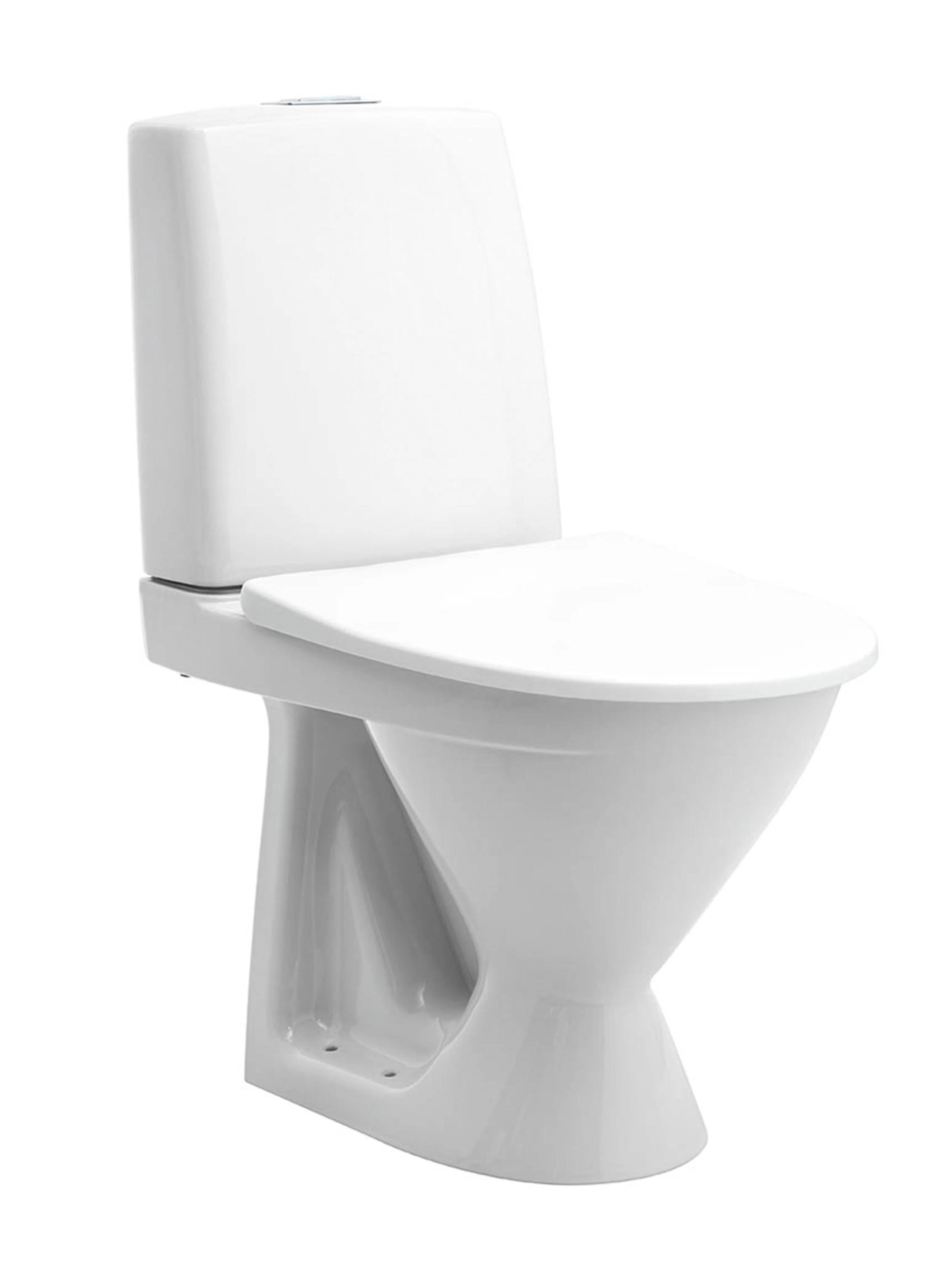 Gulvstående toalett med P-lås i en høyere modell enn standard. Med skruehull. Toalett kommer med trykknapp med dobbeltspyling- liten og stor spylemengde. Pris uten sete.