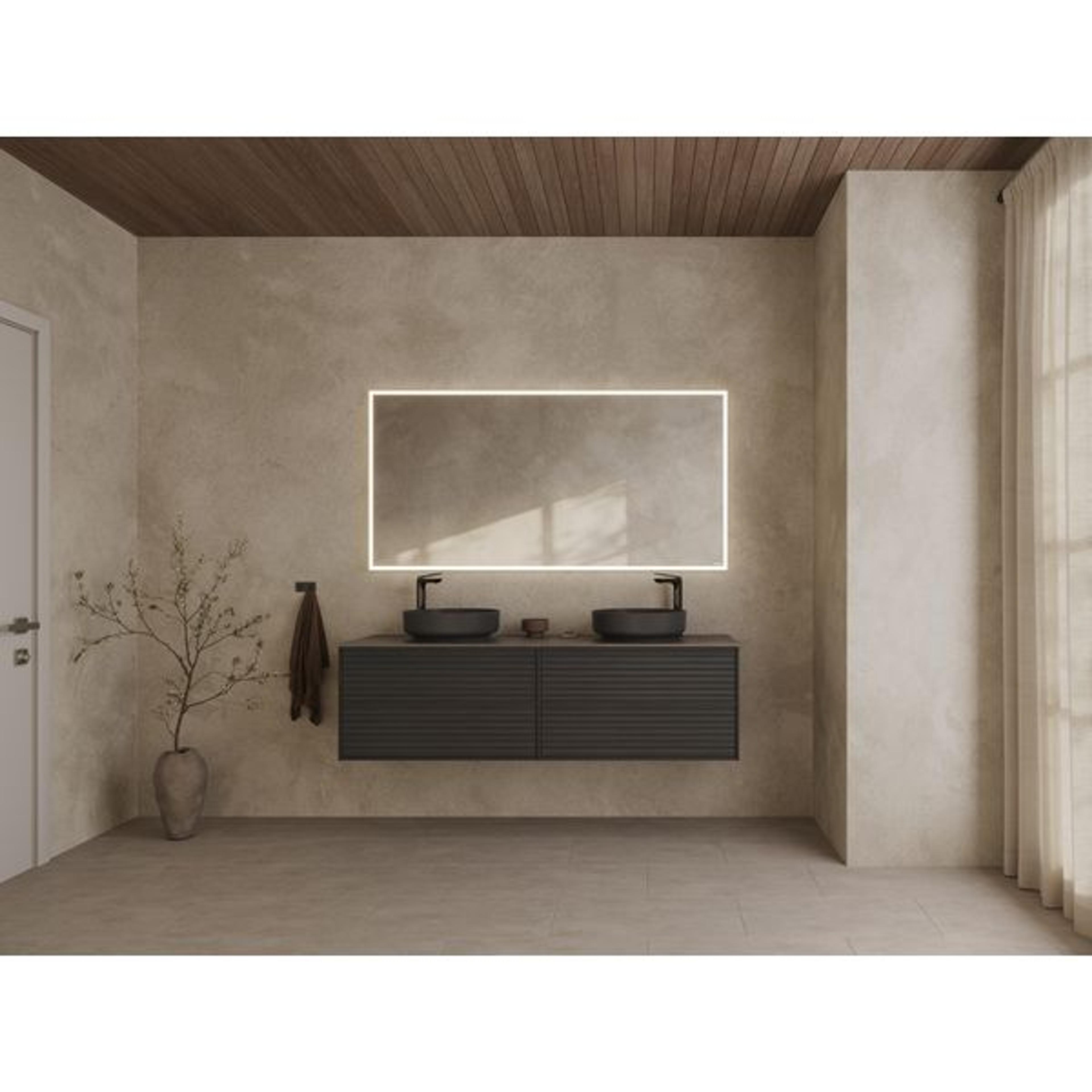 Epos 160x45 med doble servanter kombinerer stilrent design med romslige flater for hverdagen. De nøye utvalgte materialene gir en følelse av kvalitet i hver detalj og skaper en harmonisk helhet på badet. Designet i samarbeid med interiørdesigner Halvor Bakke.